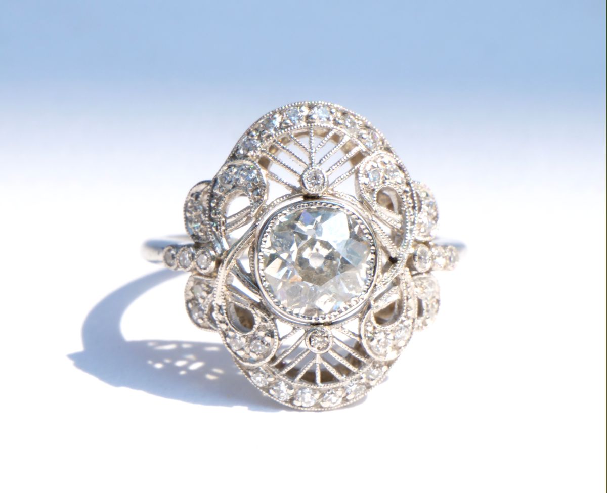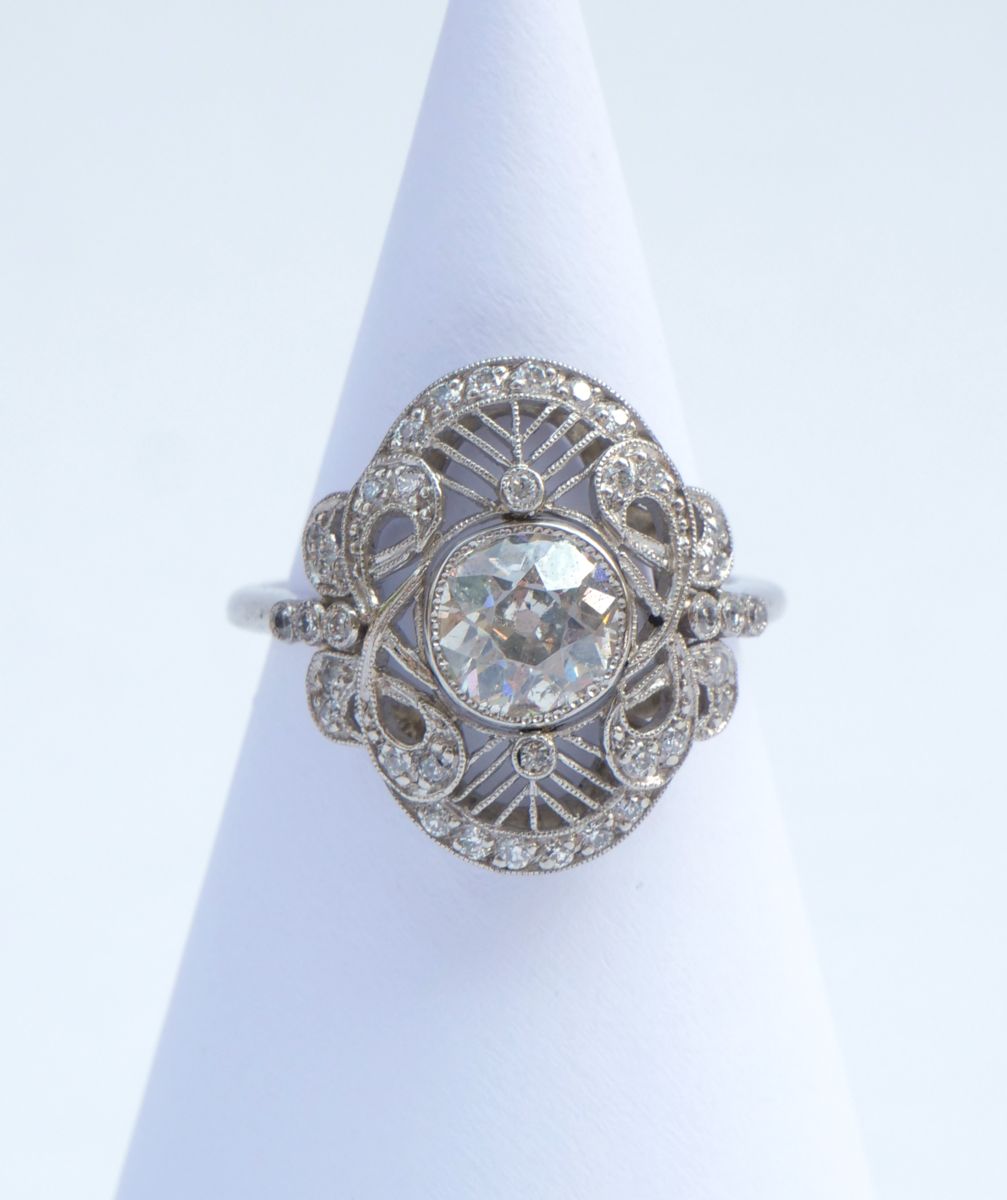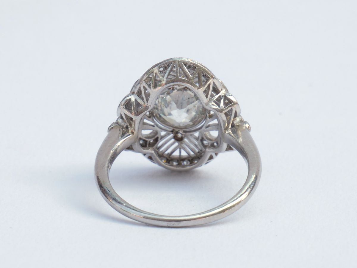 platinový prsten s ručně prořezávanou hlavou, centrální diamant starého briliantového brusu o hmotnosti 1,15 ct, čistota SI2 a barva M, Pt btto 5,60g/950/000, velikost 54; západní Evropa, kolem roku 1925, pozdější český punc; znalecký posudek
