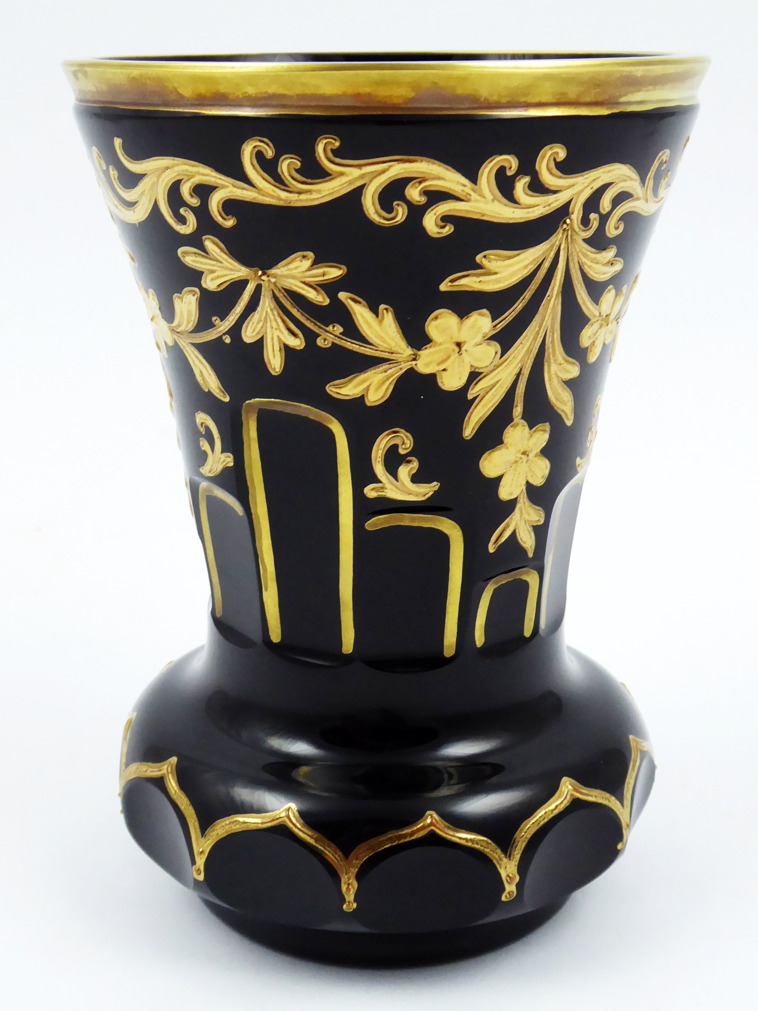 Bezbarvé silnostěnné ručně broušené sklo vrstvené kobaltovým, rubínovým a mléčným sklem. V biedermeierovém stylu. Ručně broušený pohár z bezbarvého silnostěnného skla velmi interesantní tmavě rubínové barevnosti zdobený zlacenými festony a vlnkami. Československo, minulé století. Výška 14 cm.