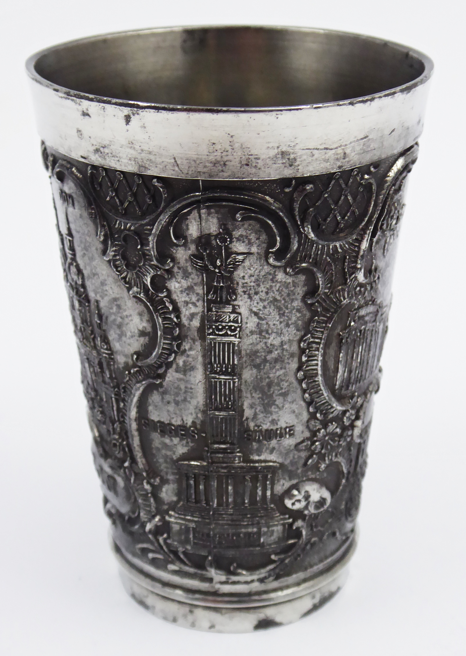 Kompozice z různých kovů. Pohárek z leštěného a patinovaného kompozitního kovu. Zdobený kartušemi s mřížkou rokokového tvaru. Reliéfní pamětihodnosti města Berlín v jednotlivých kartuších: katedrála, Vítězný sloup, zámek, pomník císaře Viléma. Německo, 1900 – 1935. Výška 9 cm.