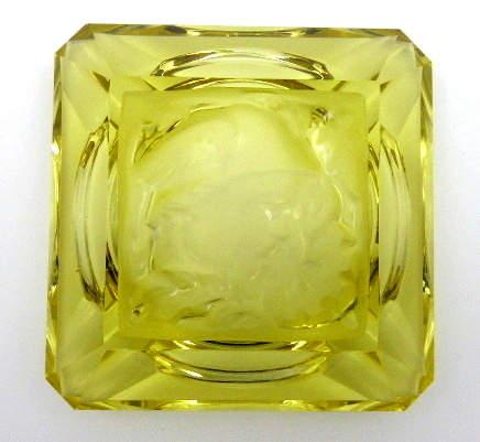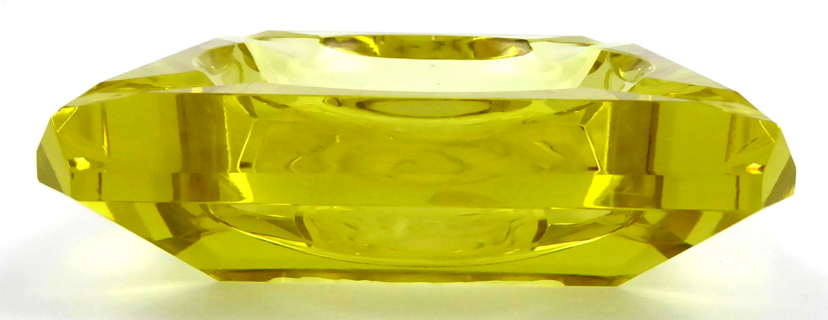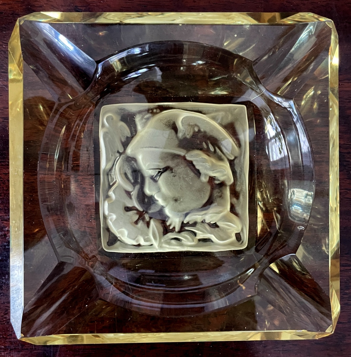 Žluté citrínové ručně broušené a matované sklo. Období a styl: art deco. Návrh a výroba Rudolf Hloušek (1909-1992), který založil roku 1930 v Železném Brodě firmu na umělecké zpracování skla. Něktré modely pro něho navrhoval také Alois Metelák. Za své sklo získal Hlouškův podnik na Světové sklářské výstavě v Bruselu v roce 1935 cenu Grand Prix. Popelník čtvercového tvaru ze silnostěnného žlutého zlatavě citrínového skla s ručně broušenými fazetami. Zdobený reliéfním portrétem Merkura na matovaném pozadí. Československo, Železný Brod, 30. léta minulého století. Rozměr popelníku 12 cm x 12 cm x 4 cm.