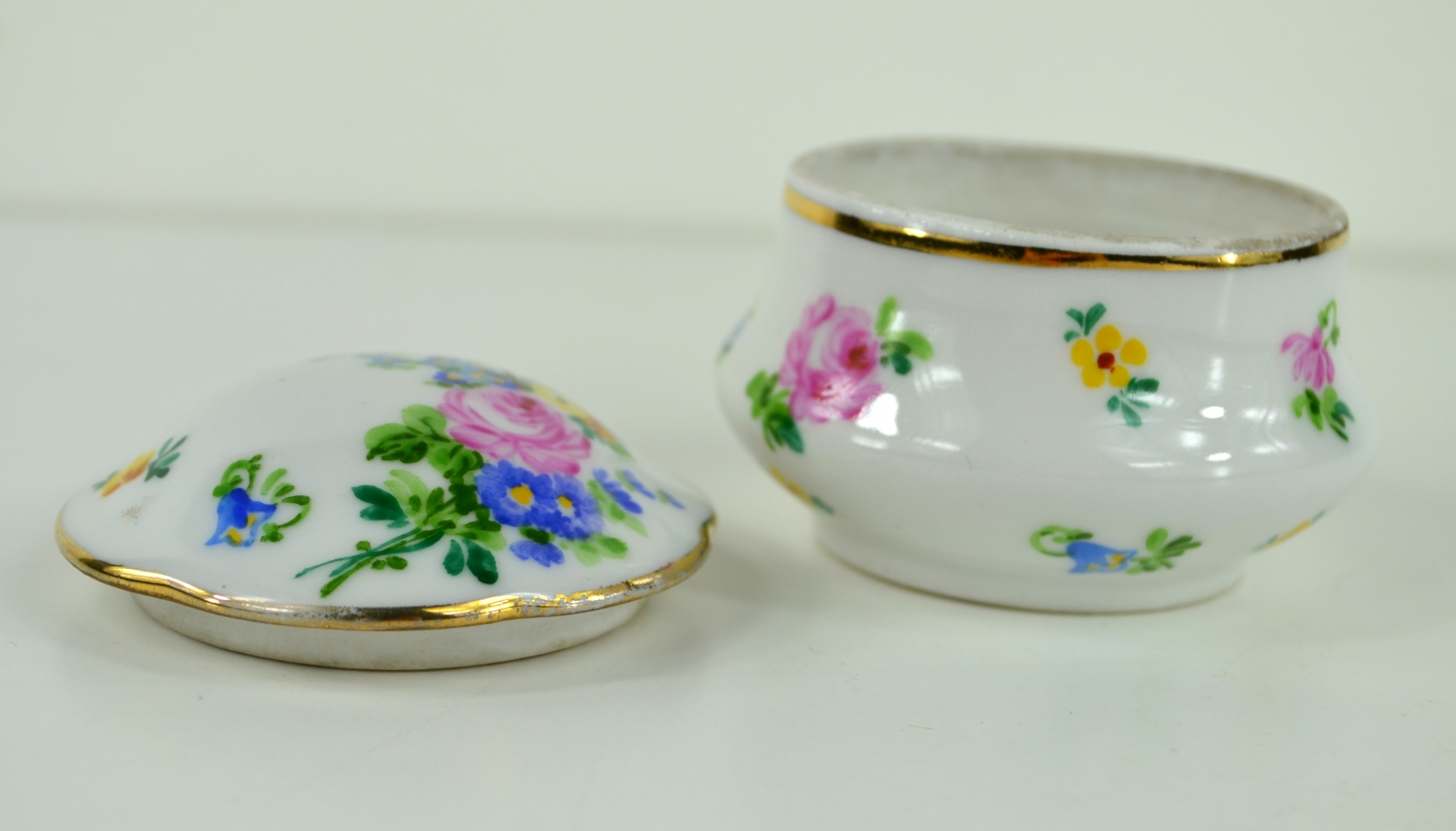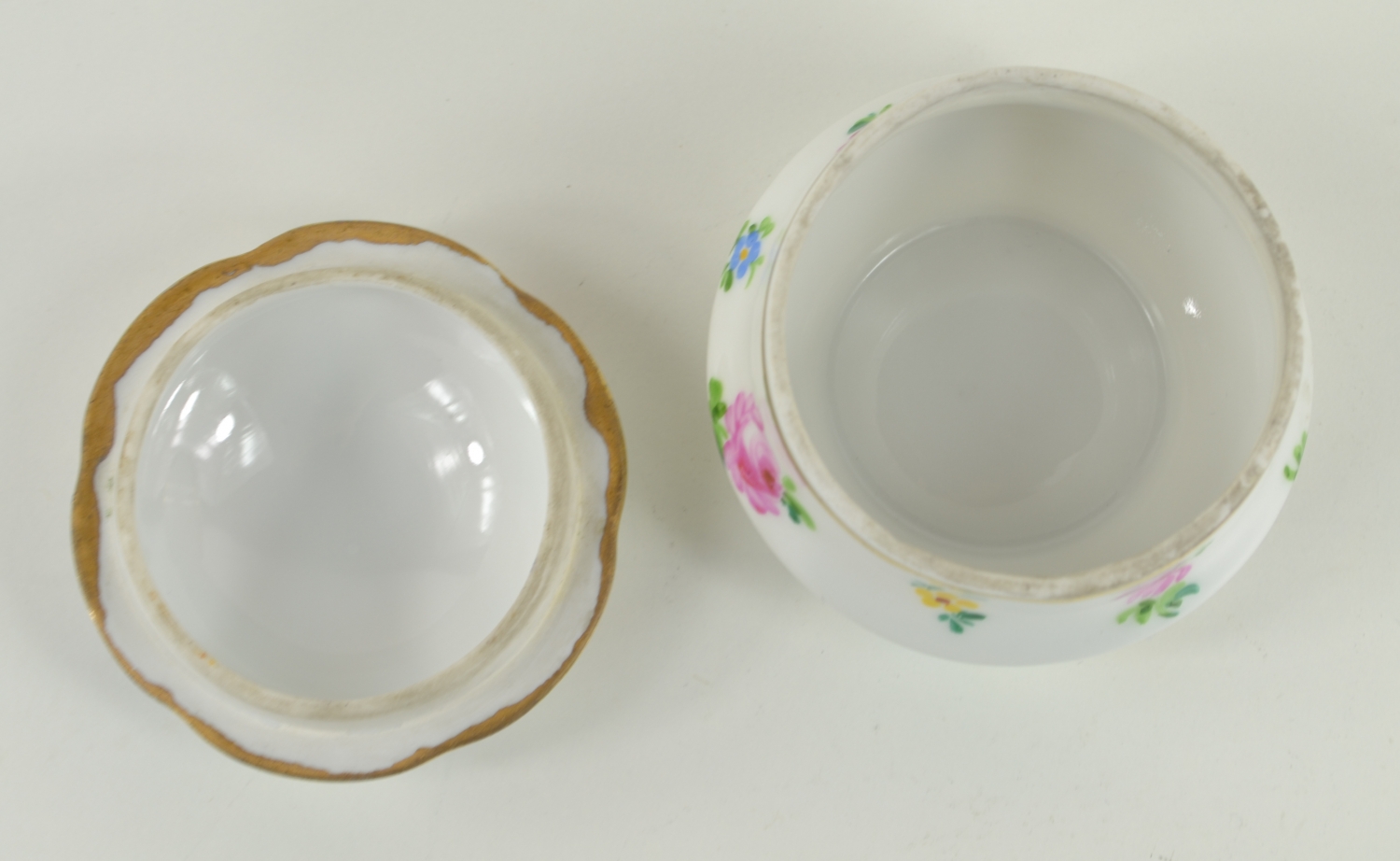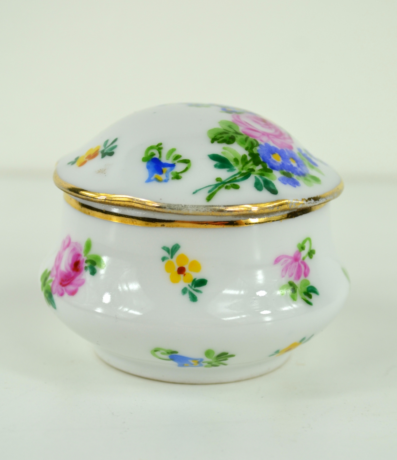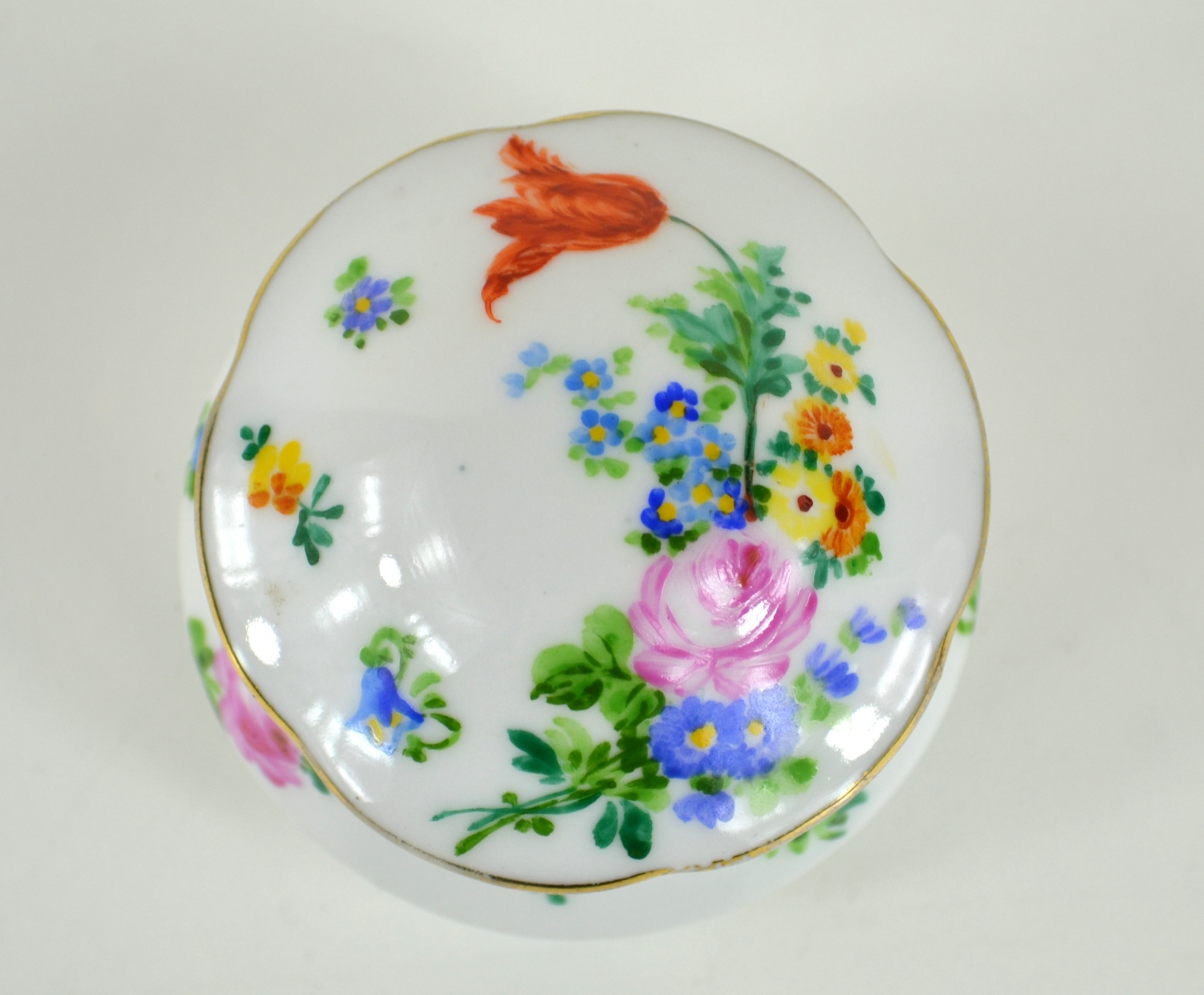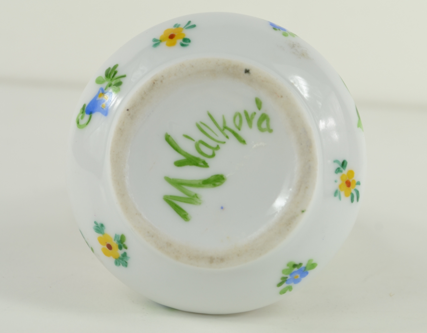Malovaná porcelánová dózička, Čechy, kolem roku 1940. Signováno na spodní straně M. Válková. Výška 7 cm.