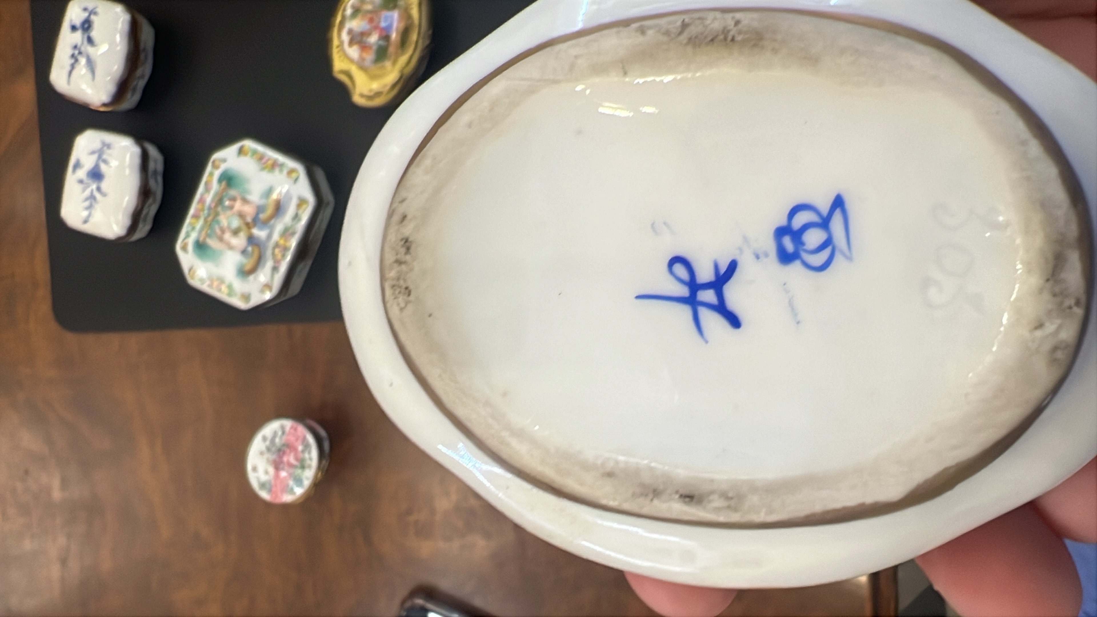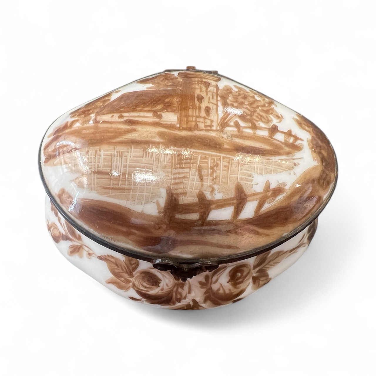 Elegantní porcelánová dóza z manufaktury Sevrès, zdobená jemnými hnědými motivy malovanými na bílém podkladu. Na víku je detailní výjev domu či mlýna, po stranách pak florální dekor. Dóza má mosazný rámeček a je značena na spodní straně. Původní stav odpovídající stáří.