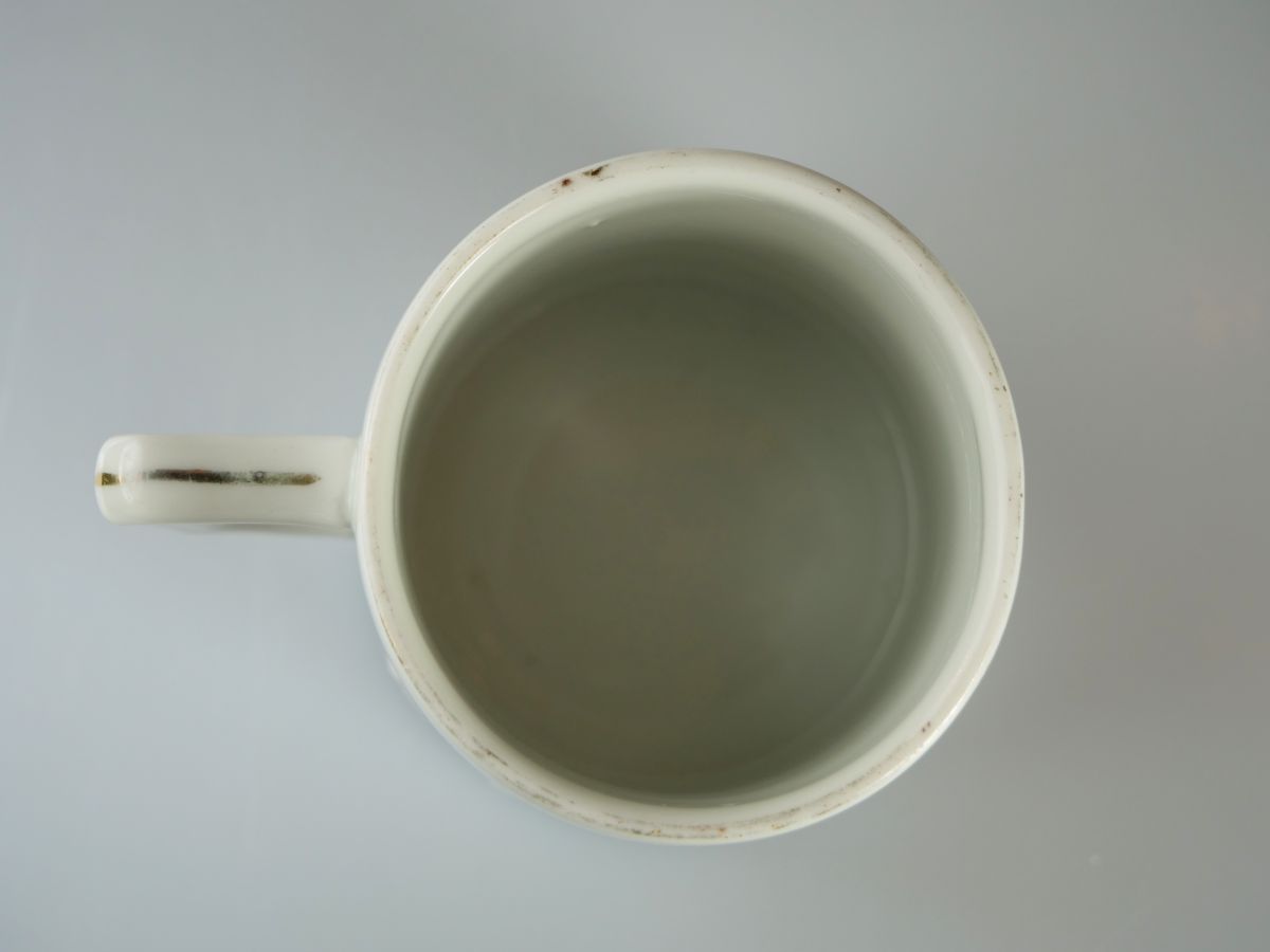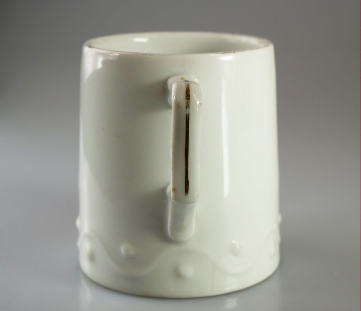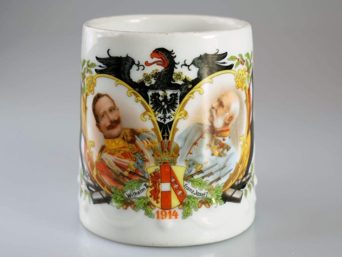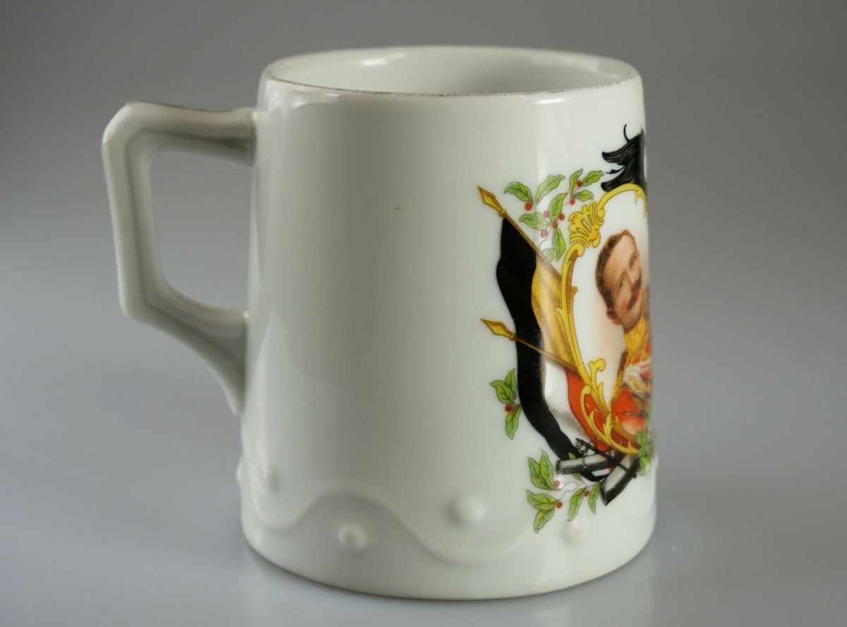 ”válečný” porcelánový hrnek s tištěnými portréty císařů Františka Josefa I. a Viléma II., tištěná datace 1914, Horní Slavkov, značeno; průměr 7 cm, výška 9 cm