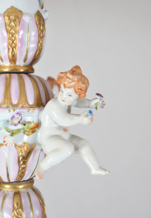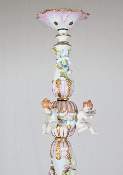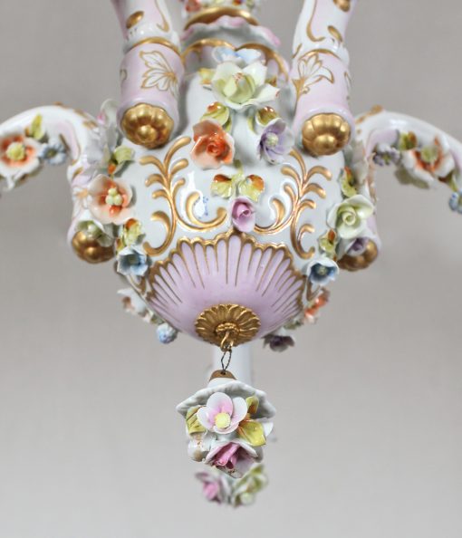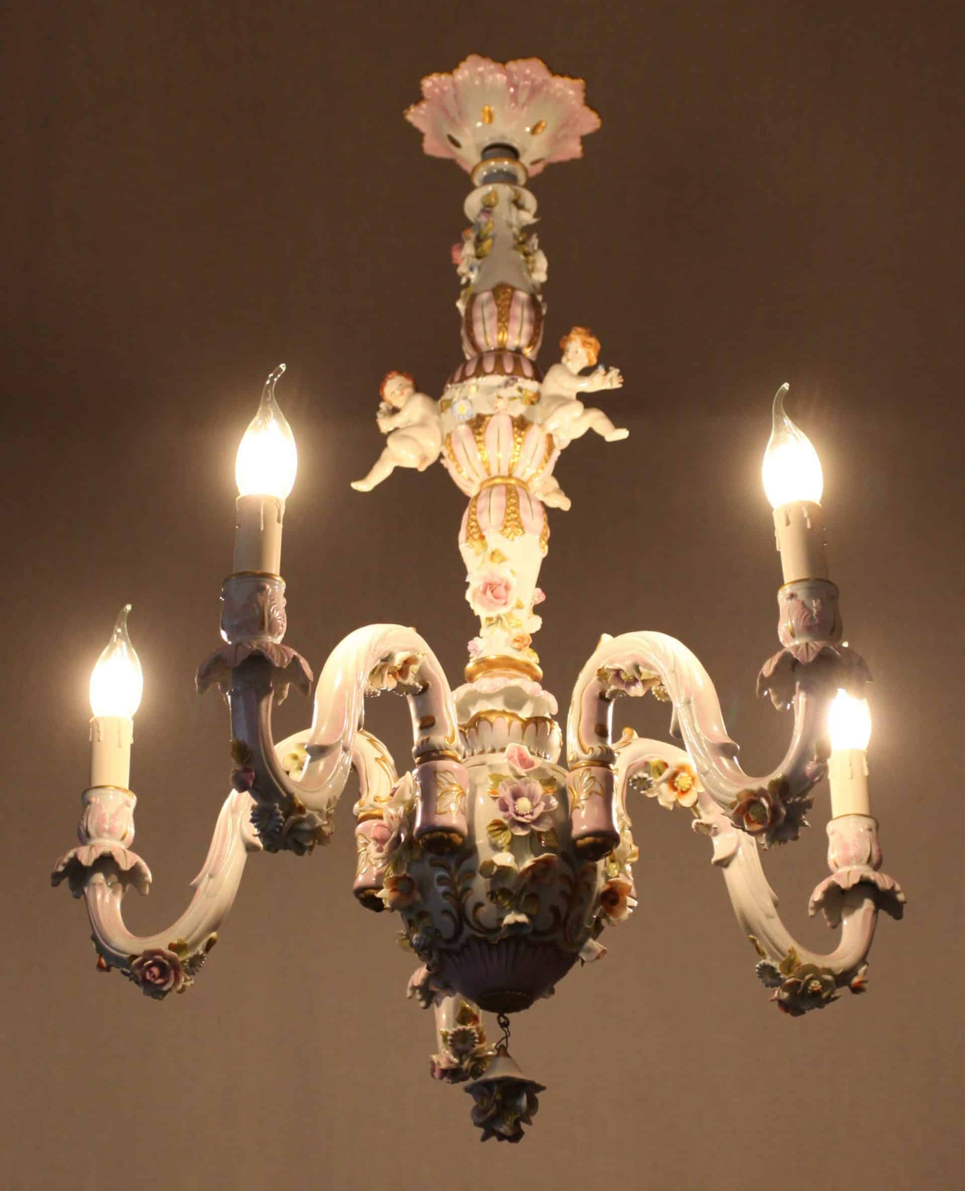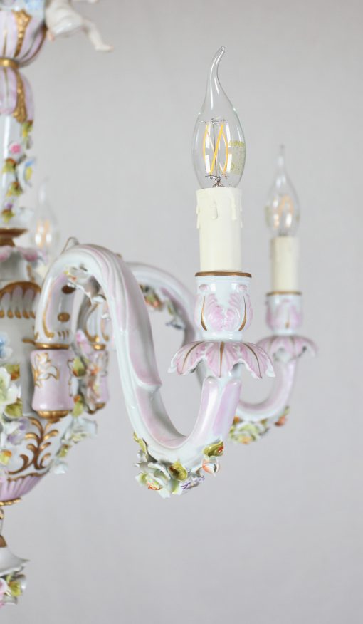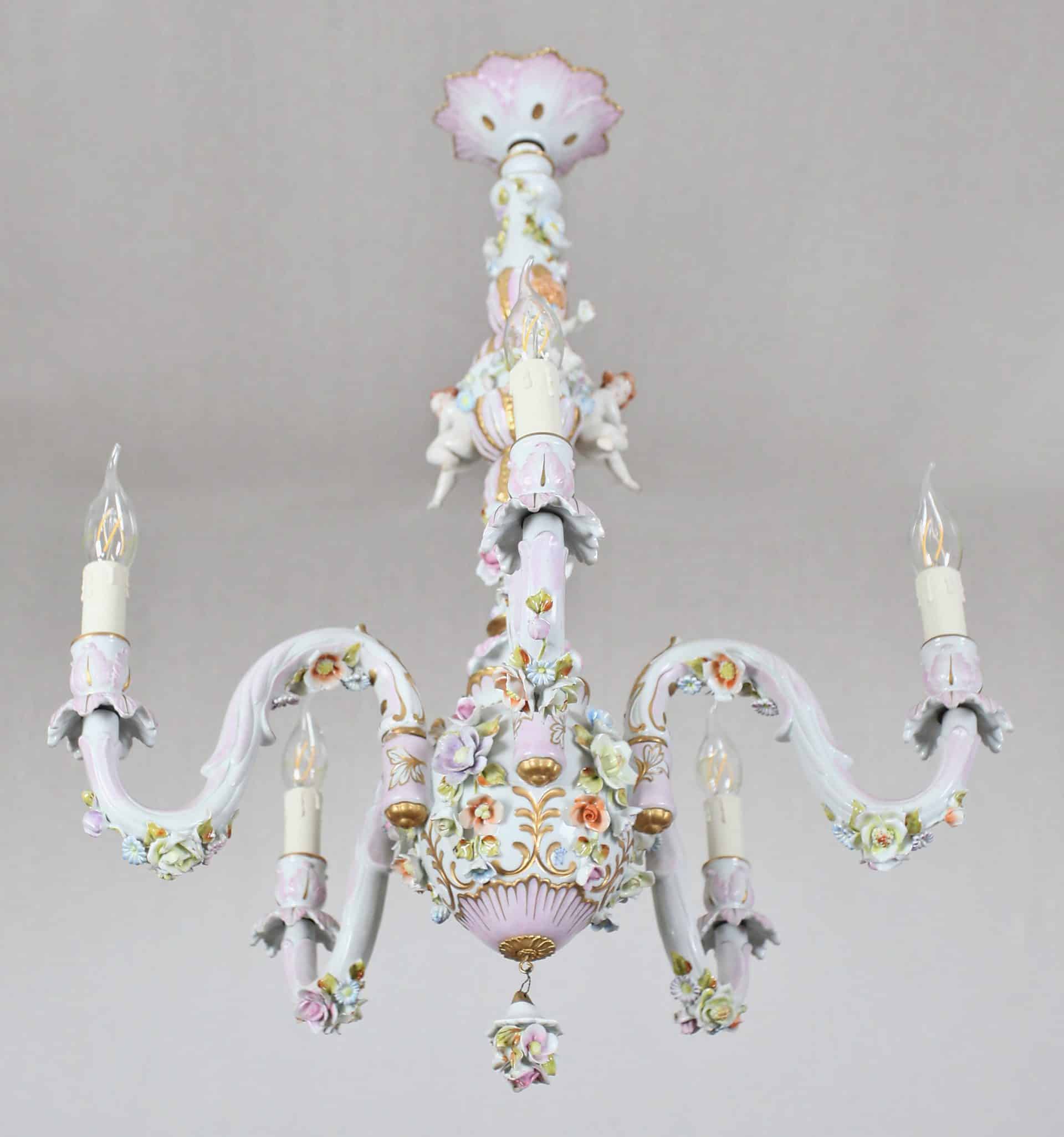 Ručně malovaný lustr z italských dílen v Capodimonte. Lustr je plně funkční. Lustr je zdobený porcelánovými figurkami Putti. Velmi kvalitní práce z 70-tých let minulého století. Lustr je na klasické svíčkové žárovky se závitem E14 – vhodné jsou normální i led žárovky.