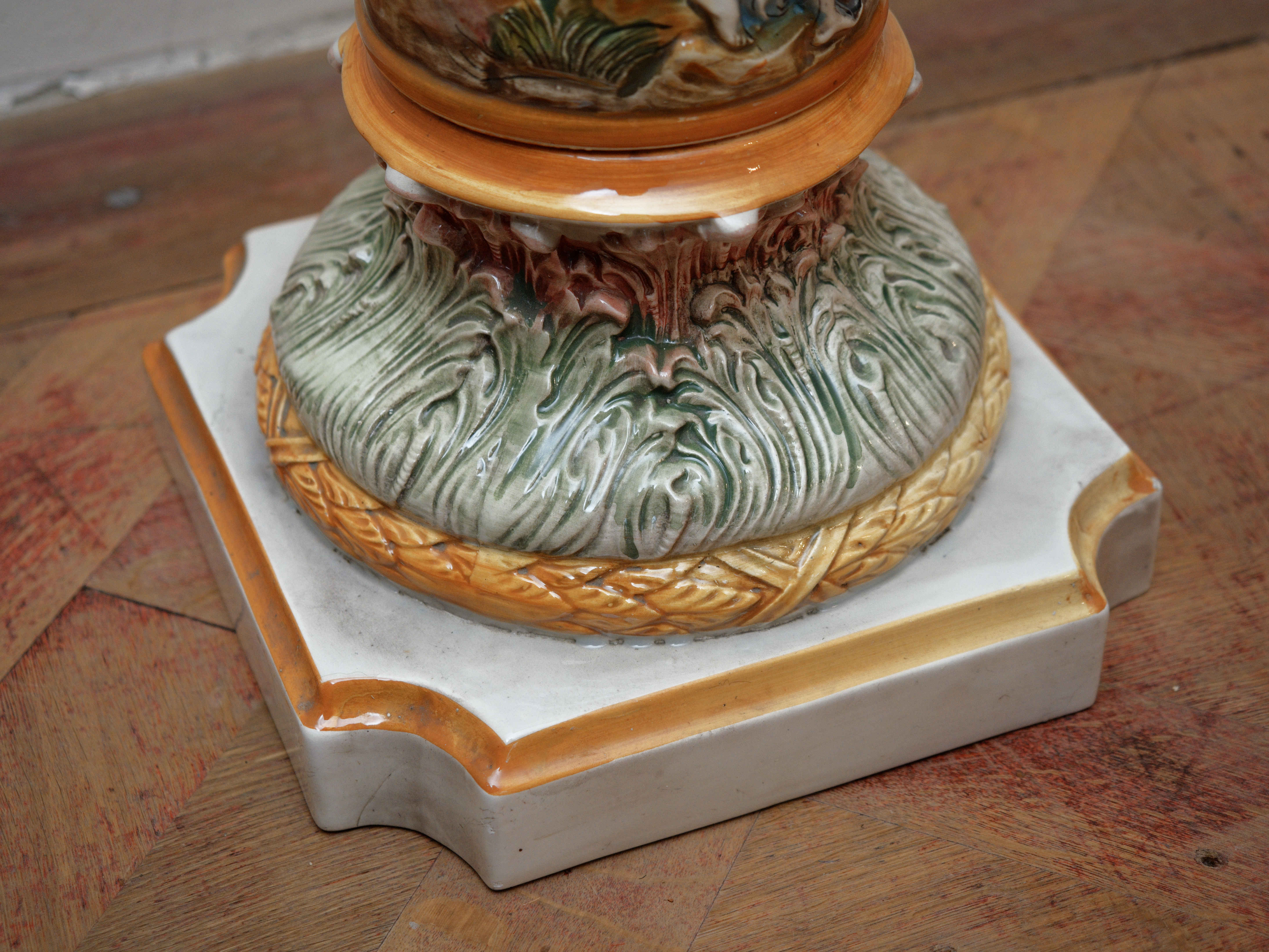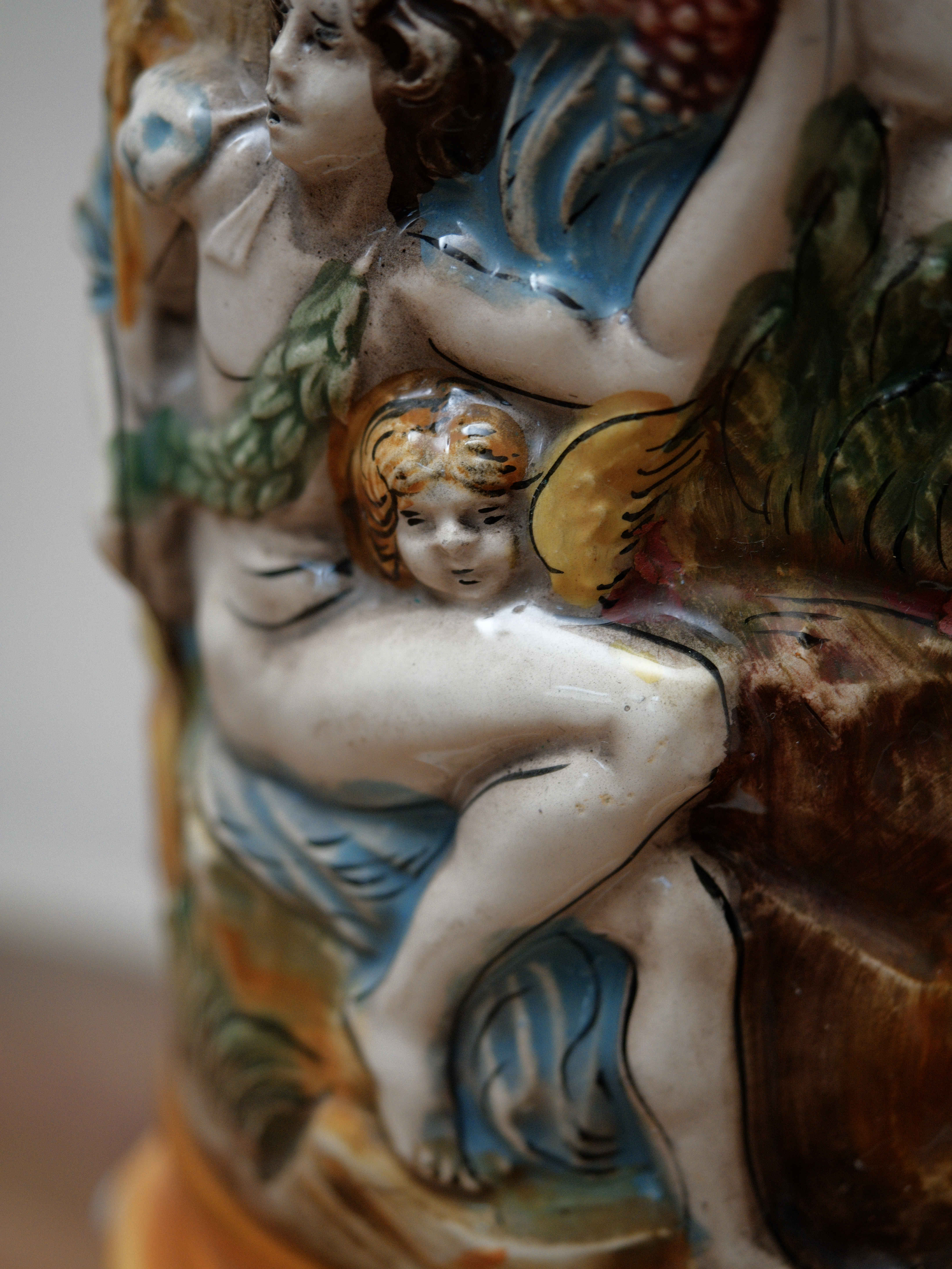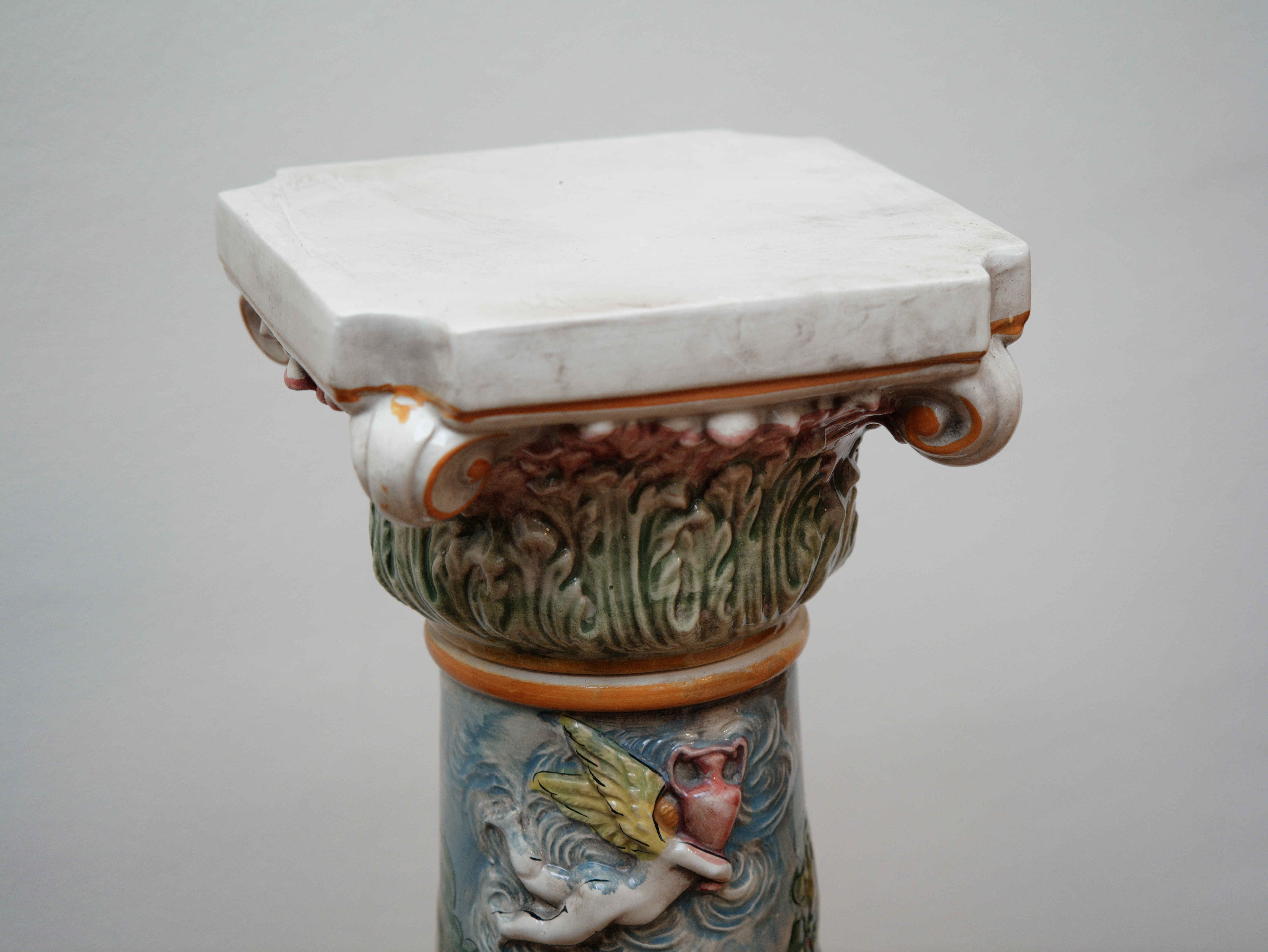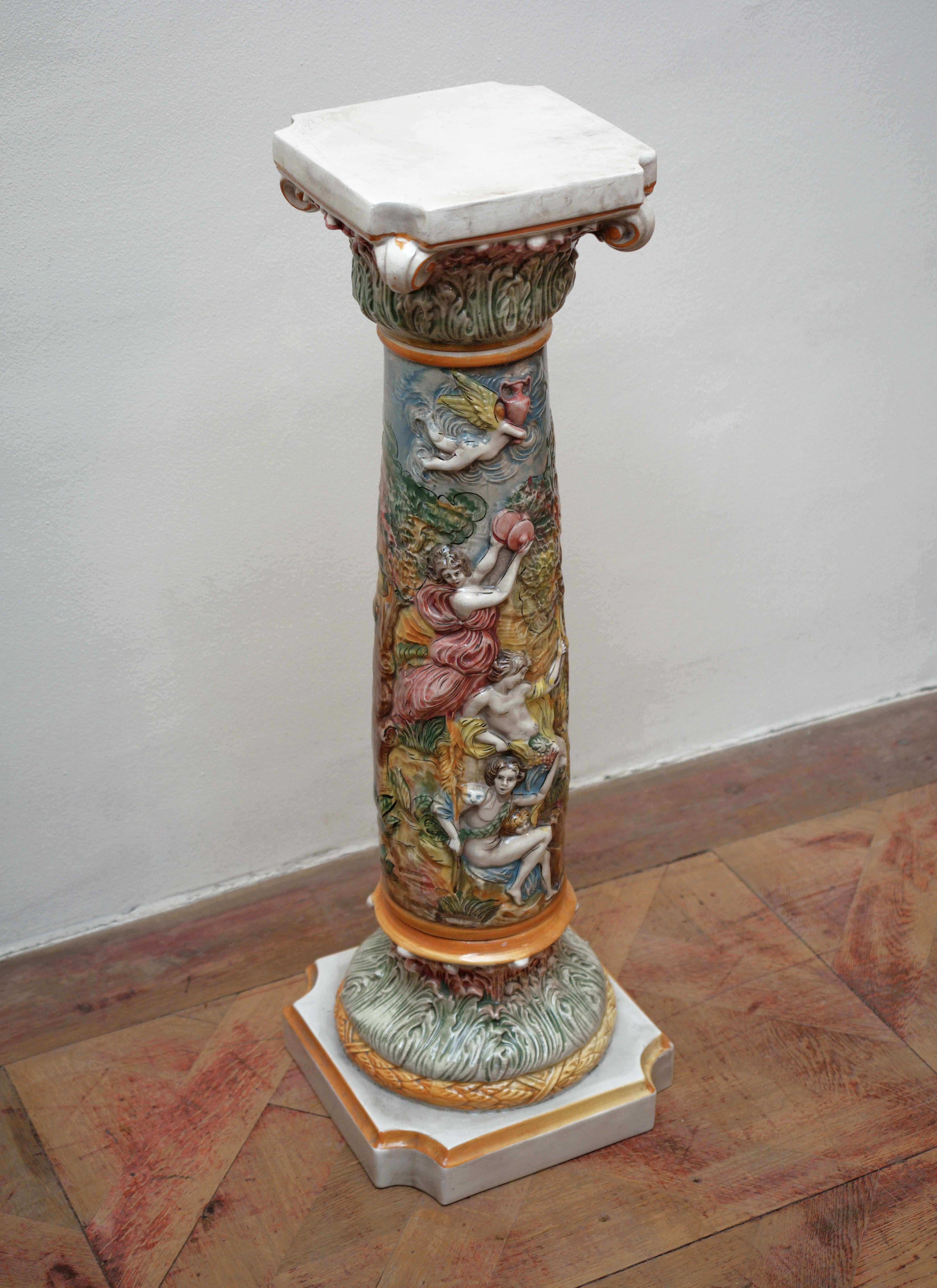 Dekorativní porcelánový sloup z dílen Capodimonte, bohatě zdobený plastickým figurálním reliéfem v duchu barokní a rokokové estetiky. Tělo sloupu je po celém obvodu modelováno ve vysokém reliéfu s výjevy putti, alegorických postav a ovocných motivů, které vytvářejí živou, téměř sochařskou kompozici.