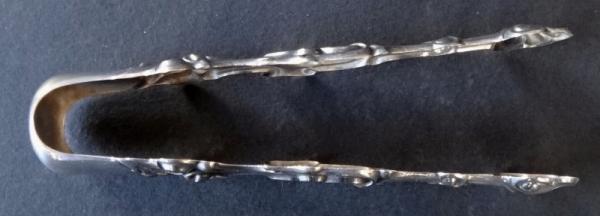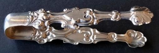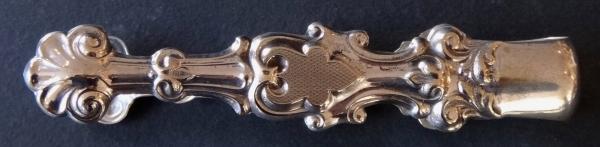 Stříbřený žlutý kov. Horní část klenutá, hladká. Střední část zdobená druhorokokovým reliéfním ornamentem. Spodní úchyty, ve tvaru mušle, s reliéfním dekorem. Střední Evropa 1850 – 1870. Délka 15 cm.