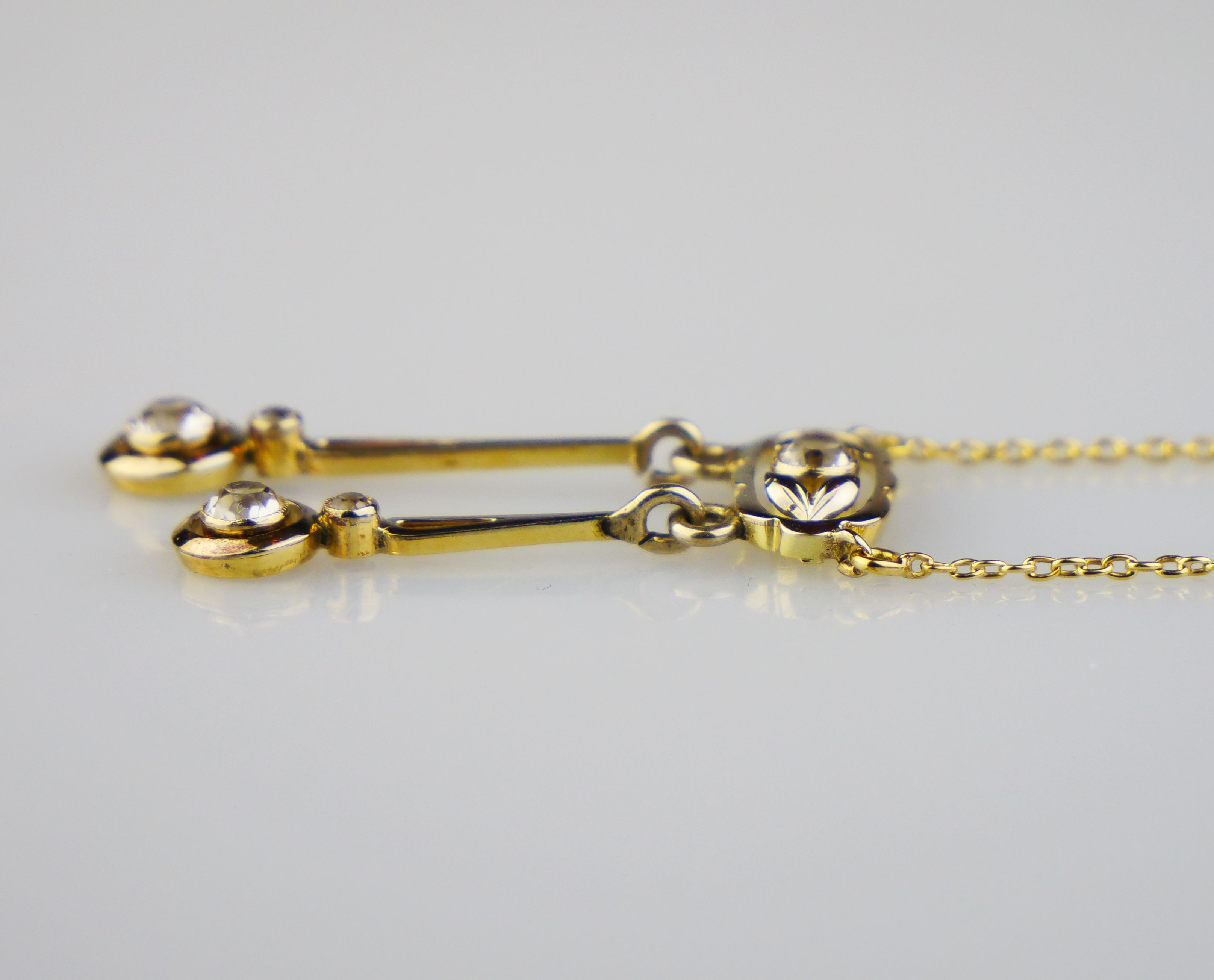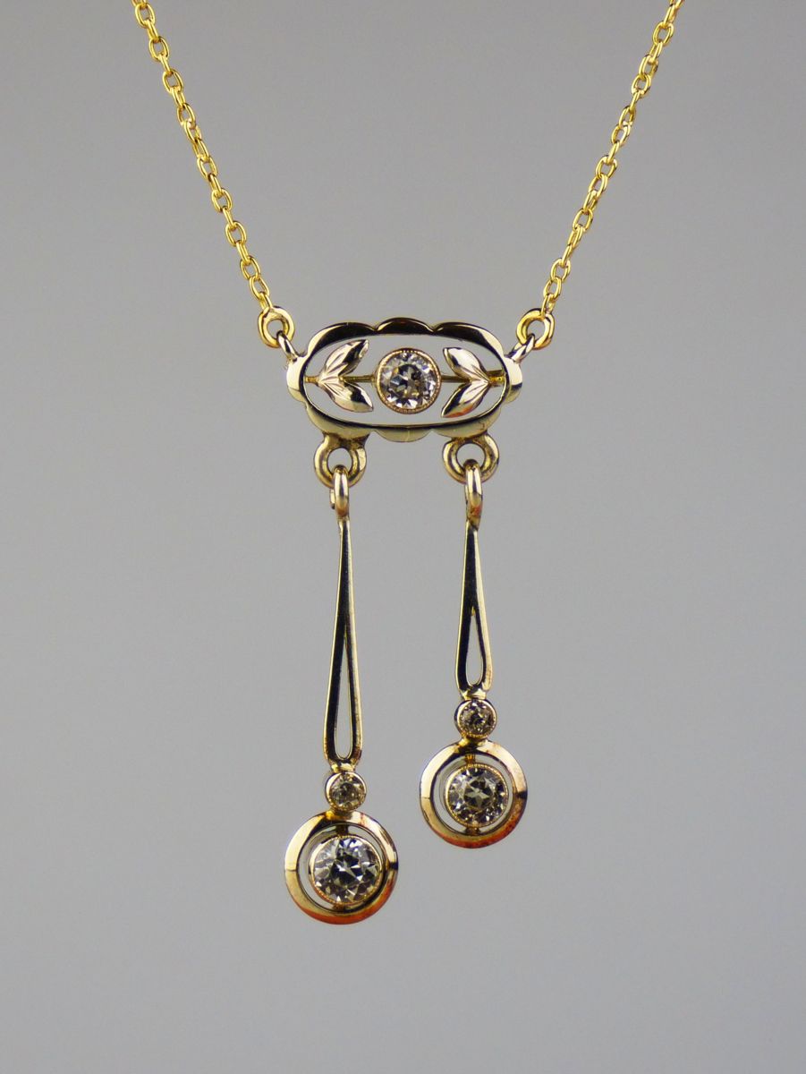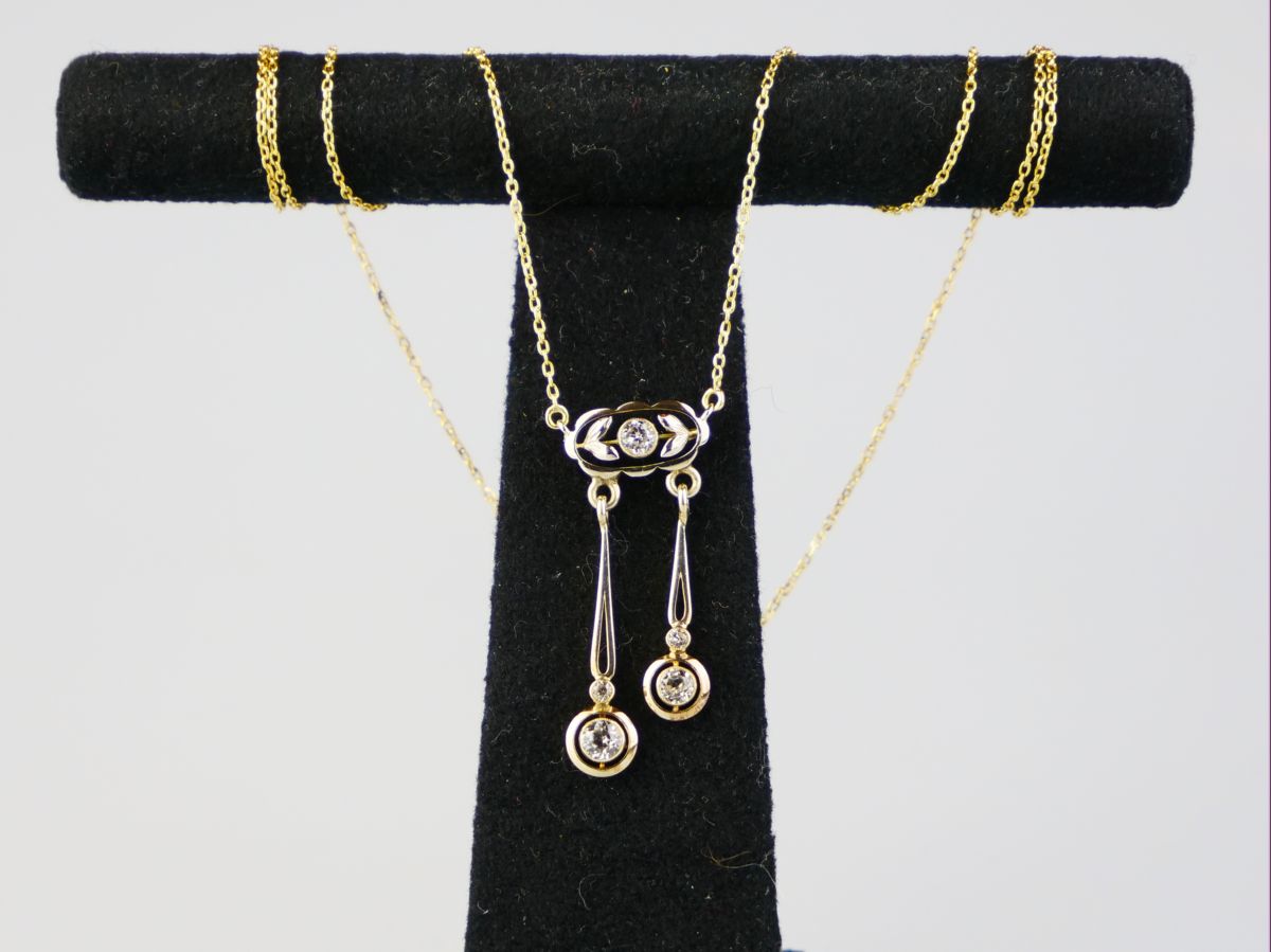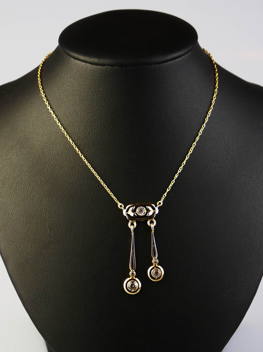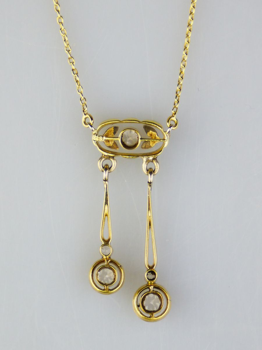 postsecesní kolier s bezbarvými safíry briliantového brusu, Au 3,75 g/585/1000, Československo, kolem r. 1930, dobový punc (lvíček), rozměr závěsu 3,5 x 1,5 cm, délka řetízku 51 cm