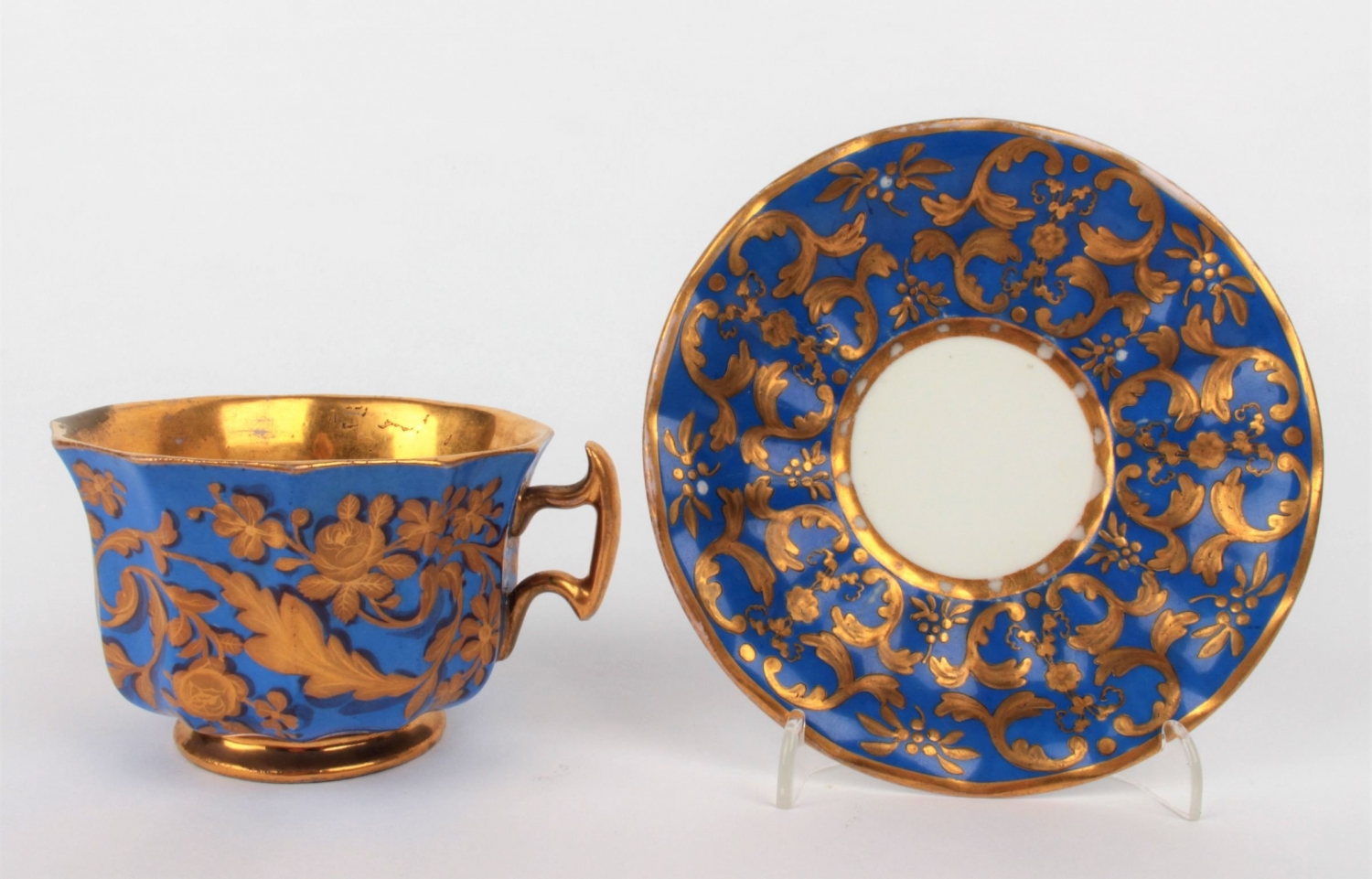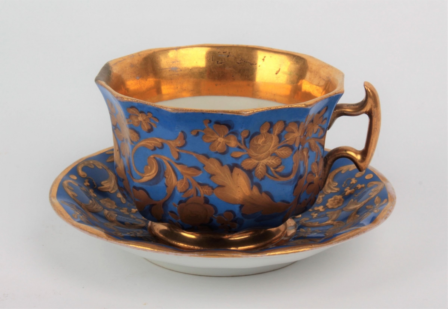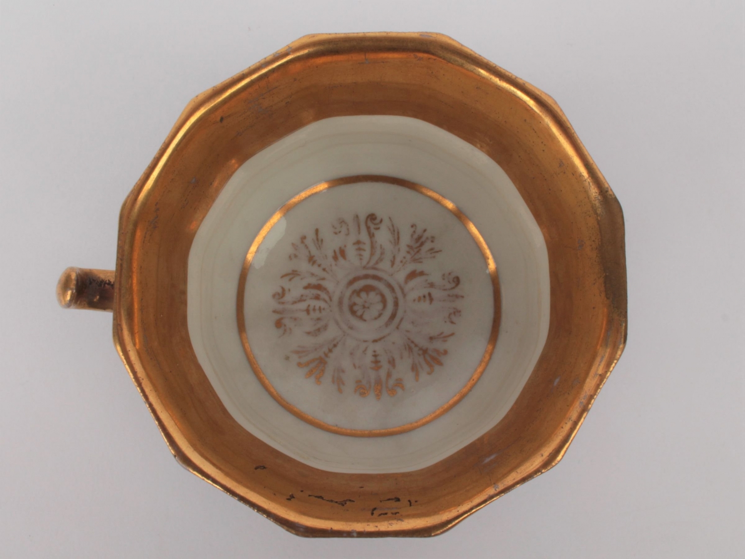 Čechy, 1. polovina 19. století, bílý glazovaný porcelán, ručně malovaný, zlacený dekor, značeno vtlačenou Prag a číslem 3, rozměry šálku 7 x 9,5 x 11 cm, průměr podšálku 14 cm.
