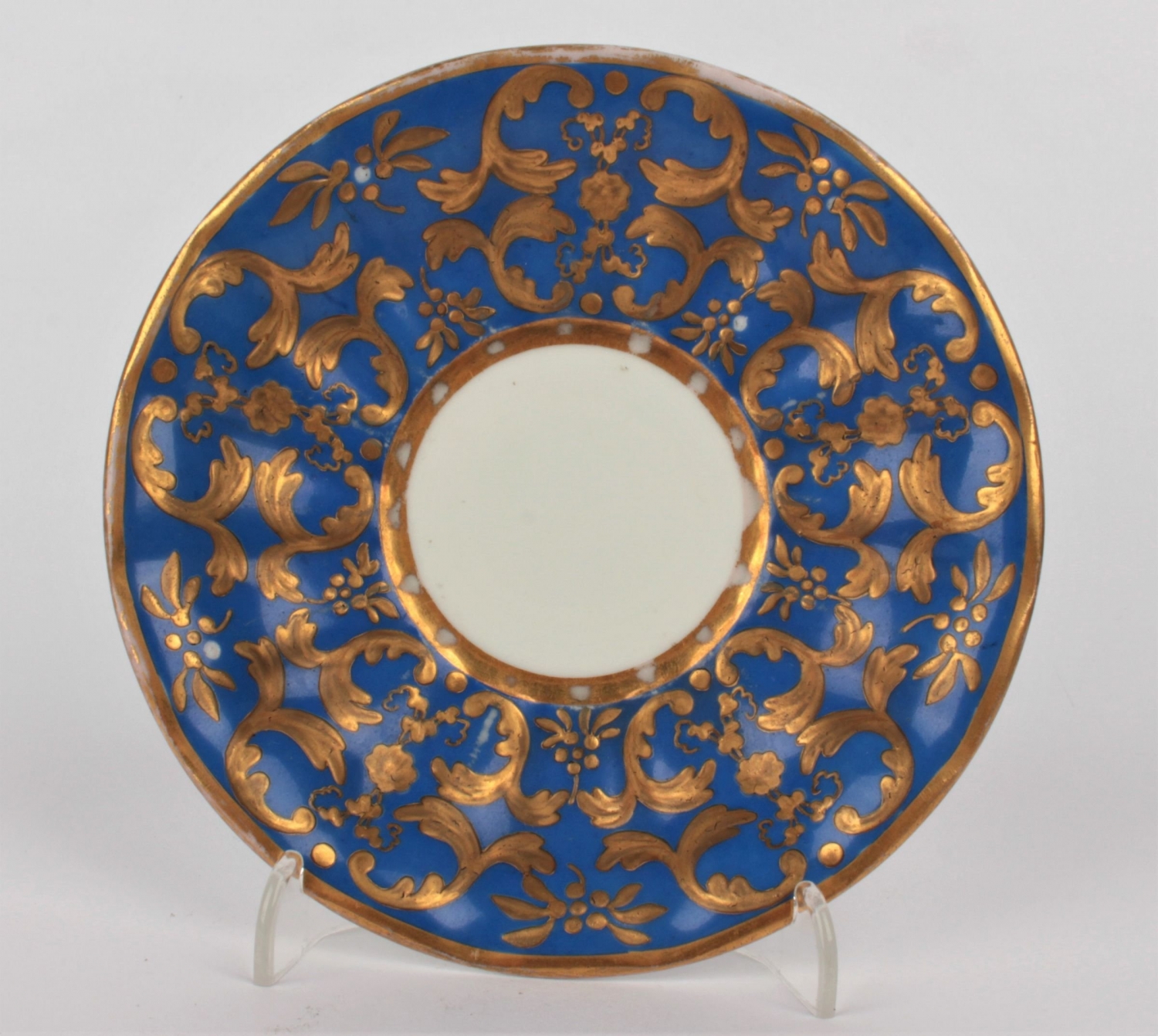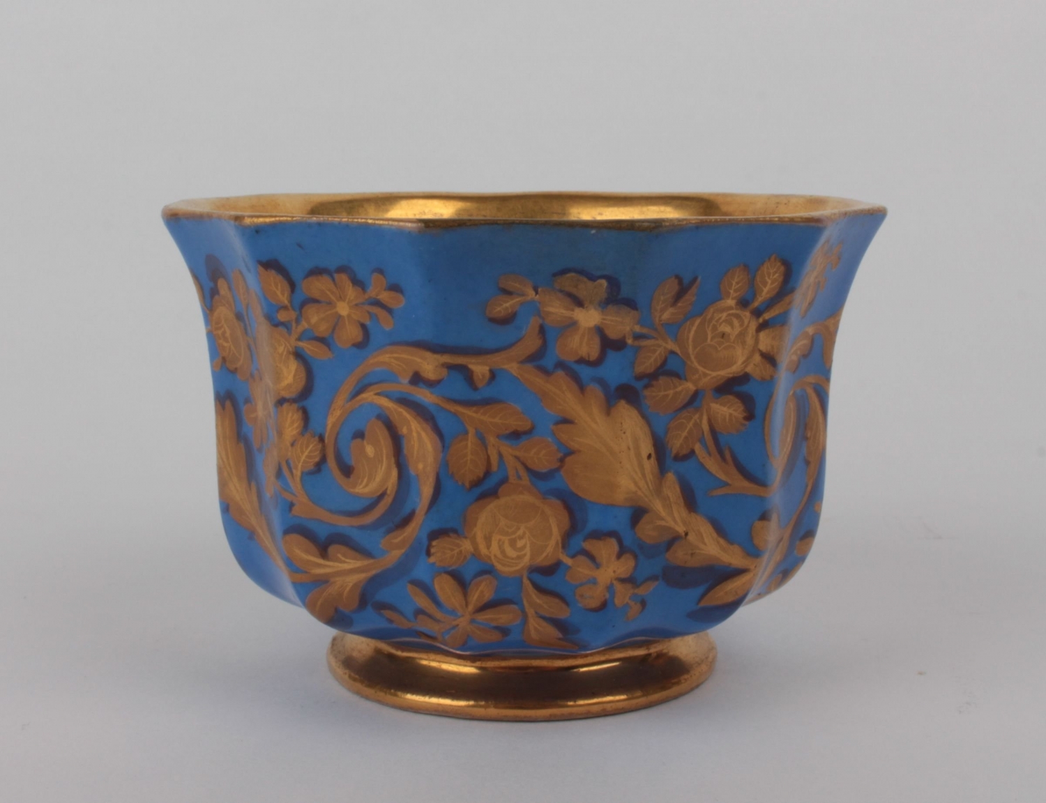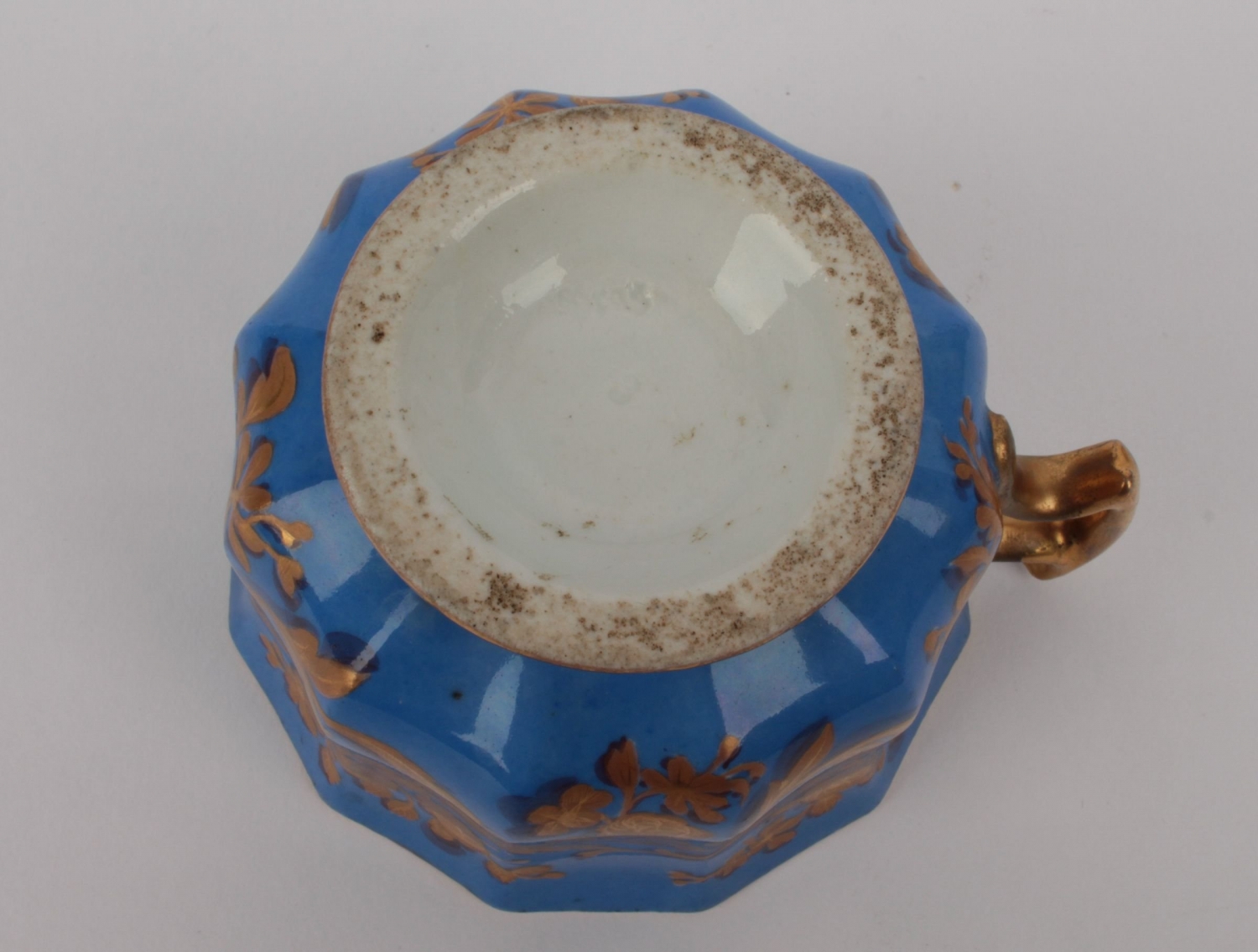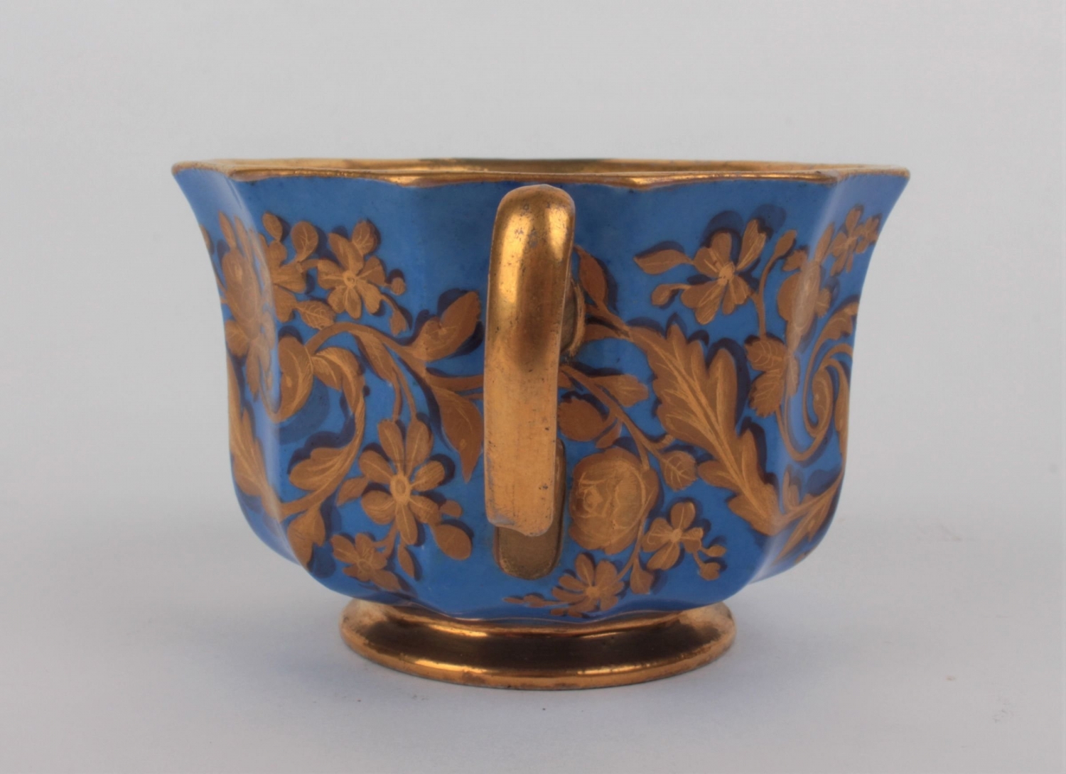 Čechy, 1. polovina 19. století, bílý glazovaný porcelán, ručně malovaný, zlacený dekor, značeno vtlačenou Prag a číslem 3, rozměry šálku 7 x 9,5 x 11 cm, průměr podšálku 14 cm.