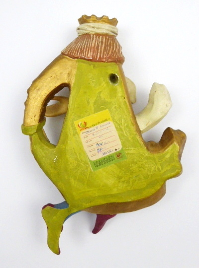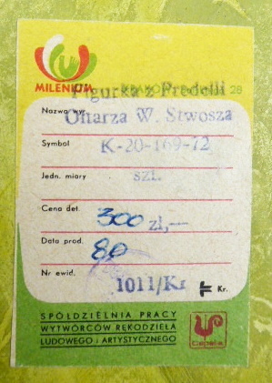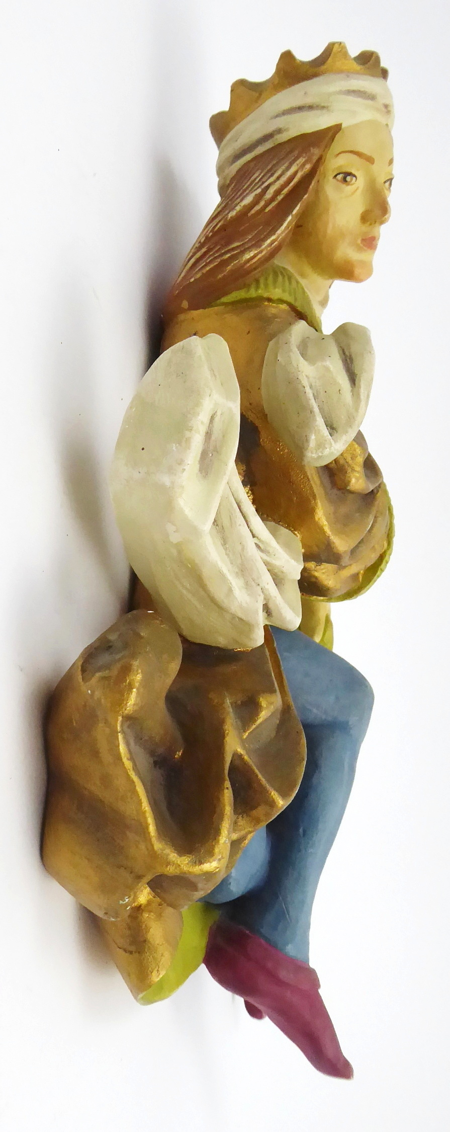 Patinovaná sádra, ruční malba, zlacení. Mariánský (Krakovský) oltář od Veita Stosse-Wit Stwosz (1447-1533) je umístěn v arciděkanském Kostele Nanebevzetí Panny Marie v polském Krakově. Tento oltář vznikl v období 1477 – 1489. Třináct metrů vysoký a jedenáct metrů široký oltářní nástavec čítá více jak 200 postav vyřezaných z lipového dřeva. Tato soška prince je jednou z nich a je umístěna na predelle (spodní část křížového oltáře zdobená malbou či řezbou). Sádrová kopie sošky je ručně barevně malována a zlacena. Princ s korunou na hlavě v dobovém oblečení sedí se zkříženýma nohama zahalen do zlaceného pláště. Ve velmi dobrém stavu. Vzadu originální nálepka polského prodejce spolu s cenou a popisem sošky. Polsko, Krakov, třetí třetina minulého století. Výška 31 cm.