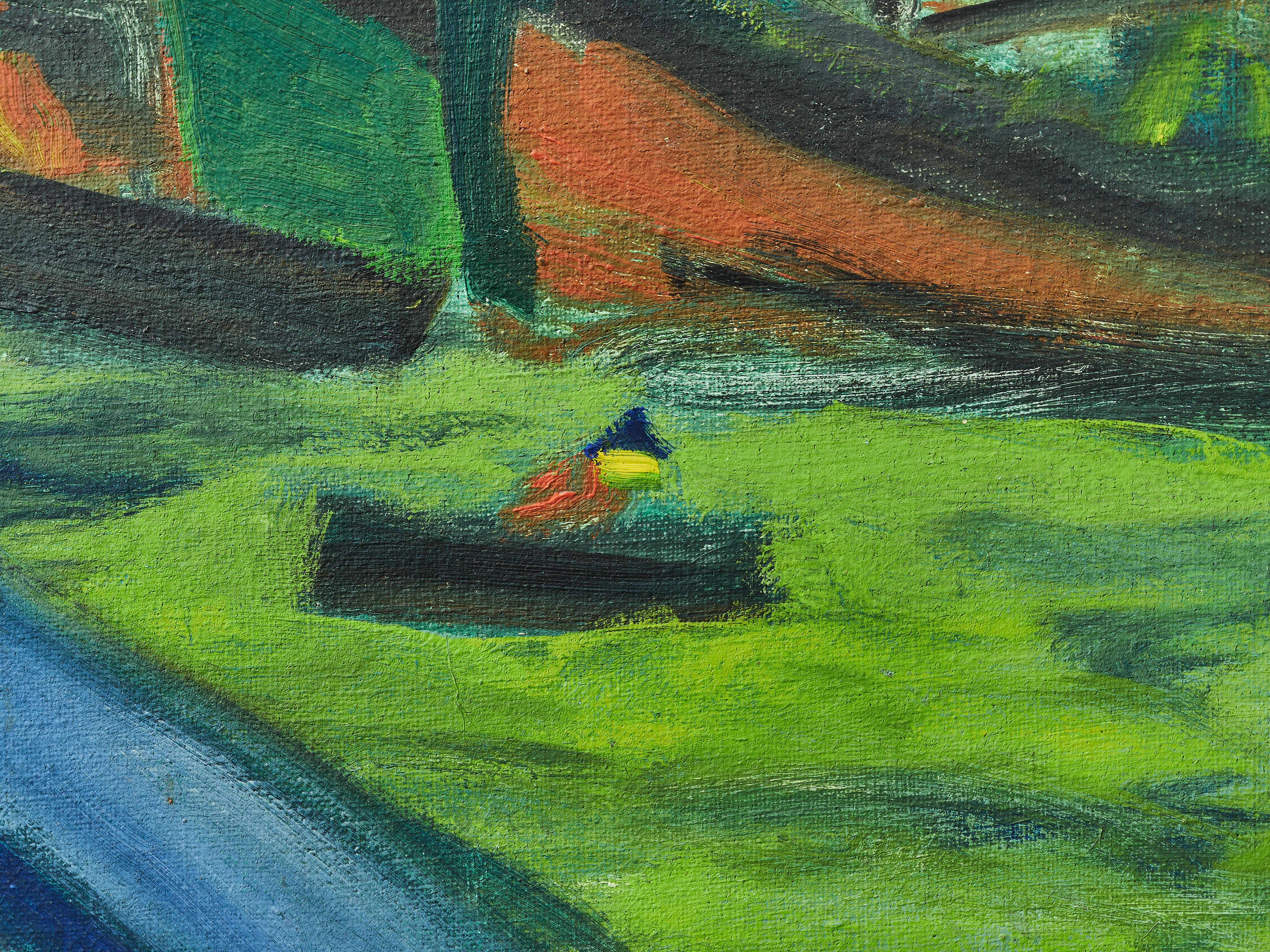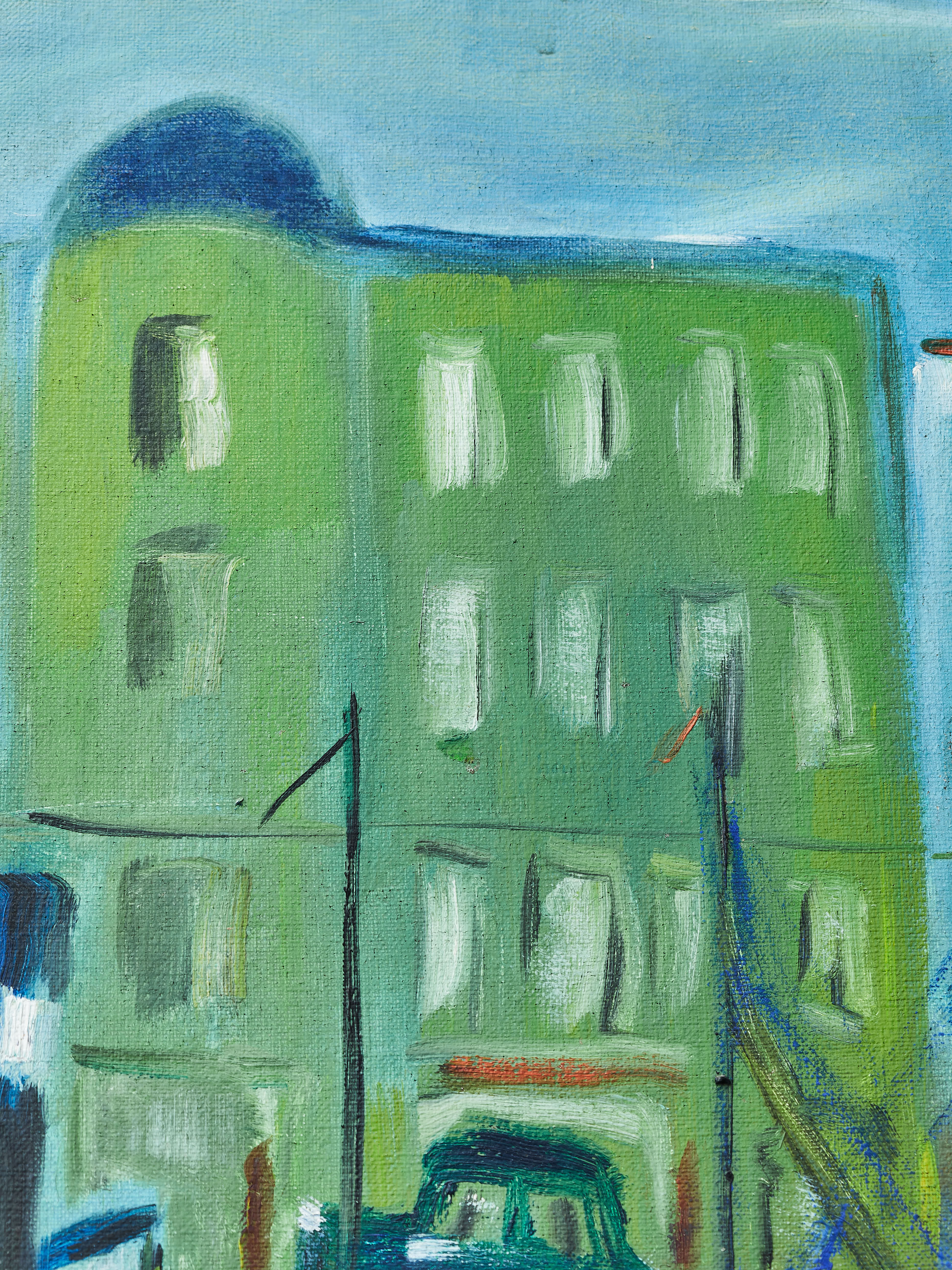 Velkoformátové plátno s názvem Přístavní město zaujme svou energií a silně stylizovaným výtvarným jazykem. Expresivní malba zachycuje rušný městský přístav s kotvícími loděmi, domy a tramvajemi v pohybu. Barevná paleta je odvážná, dominují syté tóny zelené, červené a modré, které navozují atmosféru pulzujícího městského života. Postavy i architektura jsou zjednodušeny do geometrických forem, čímž vzniká dojem snového, téměř divadelního prostředí.