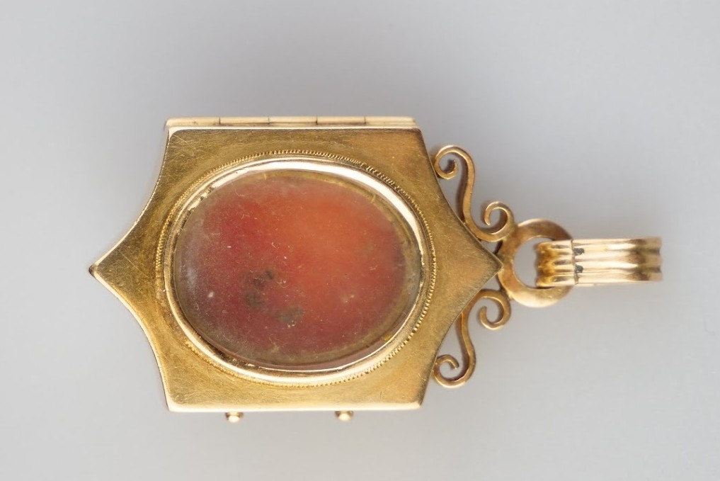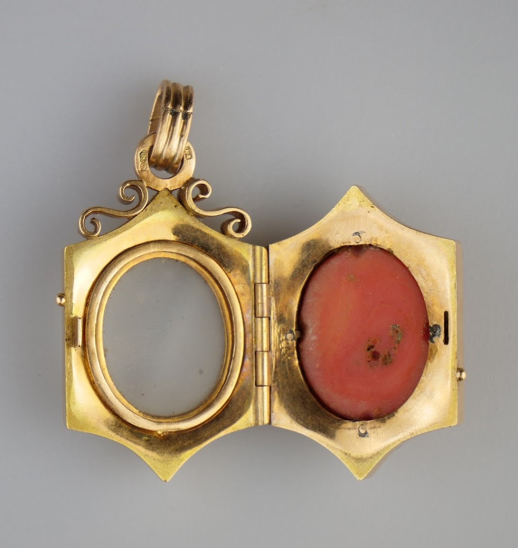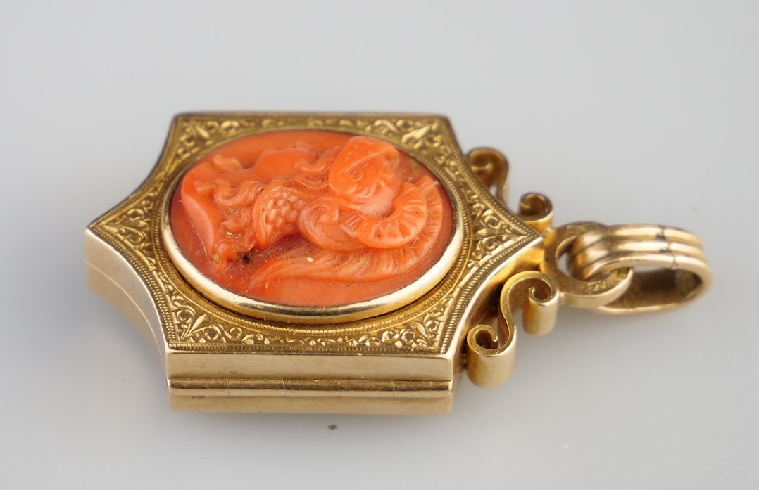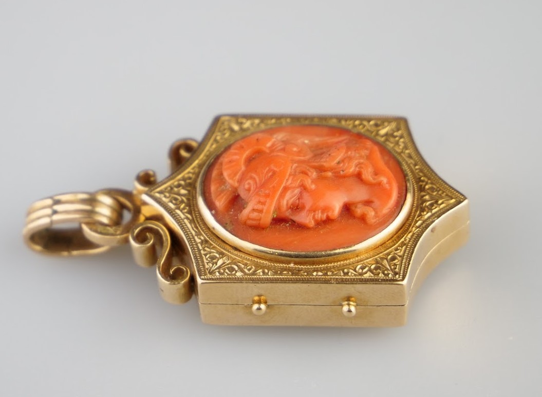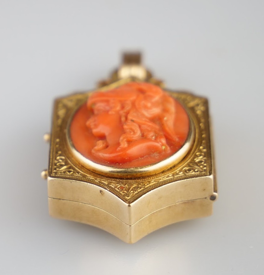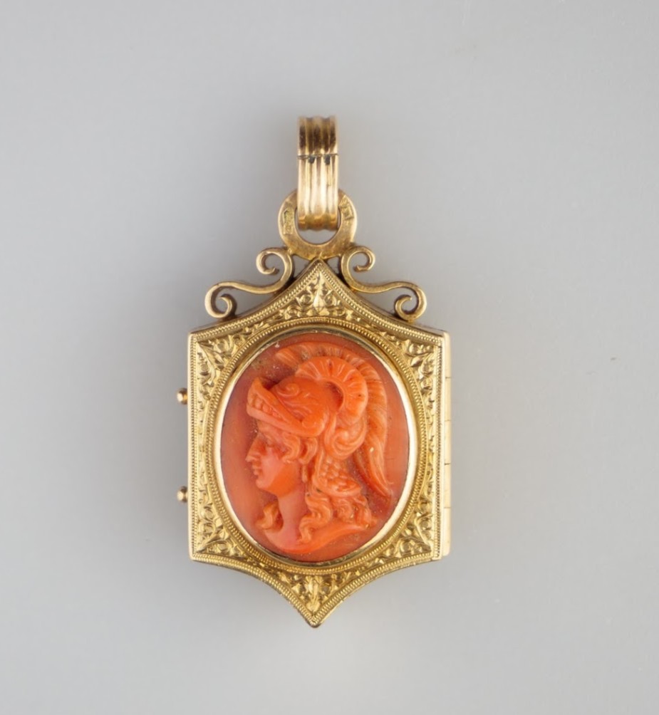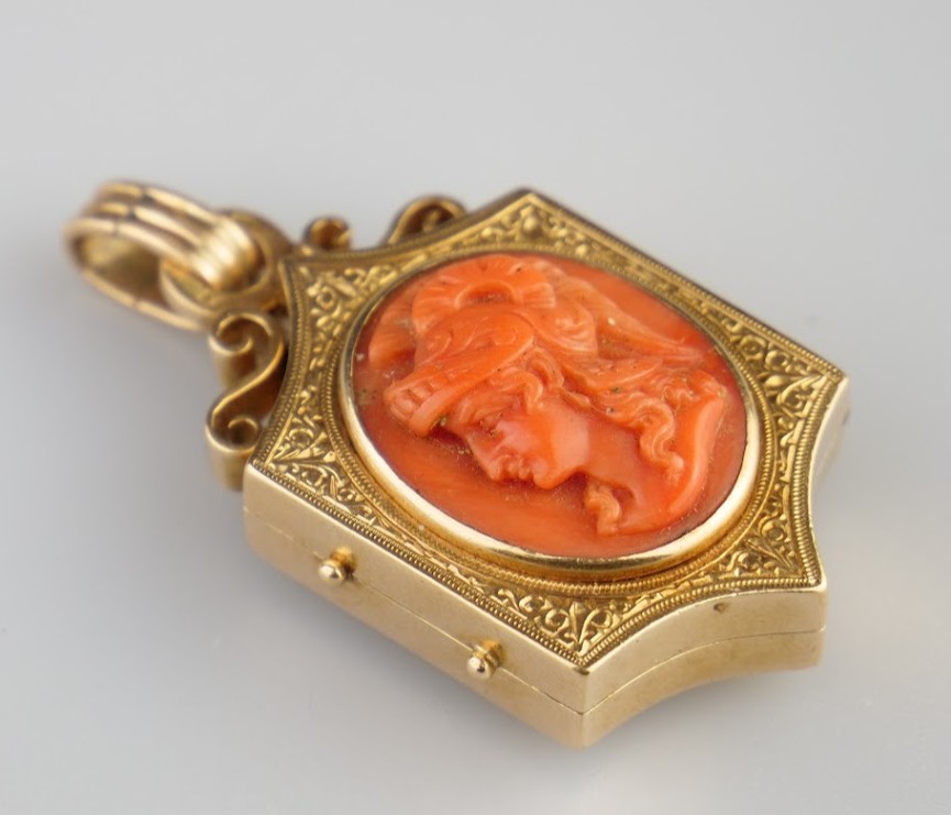 Zlatý noblesní historizující přívěsek – medailon s korálovou vysokoreliéfní gemou, zobrazující řeckou bohyni moudrosti a války Athénu. Celková hmotnost Au 22,68 g/580/1000, punc liška (Z – 27), Praha, mistrovská značka v kartuši PV, České království. Otevírací medailon ve tvaru nepravidelného šestiúhelníku, zadní strana s průhledem z oválného sklíčka, zdoben jemným gravírováním. Přírodní korál velmi dobré kvality, odborný posudek. Luxusní reprezentativní šperk ve výborném stavu ze třetí čtvrtiny 19. století. Délka závěsu s ouškem 5,2 cm, bez ouška 4,4 cm, šířka závěsu 2,5 cm, výška 1,5 cm.