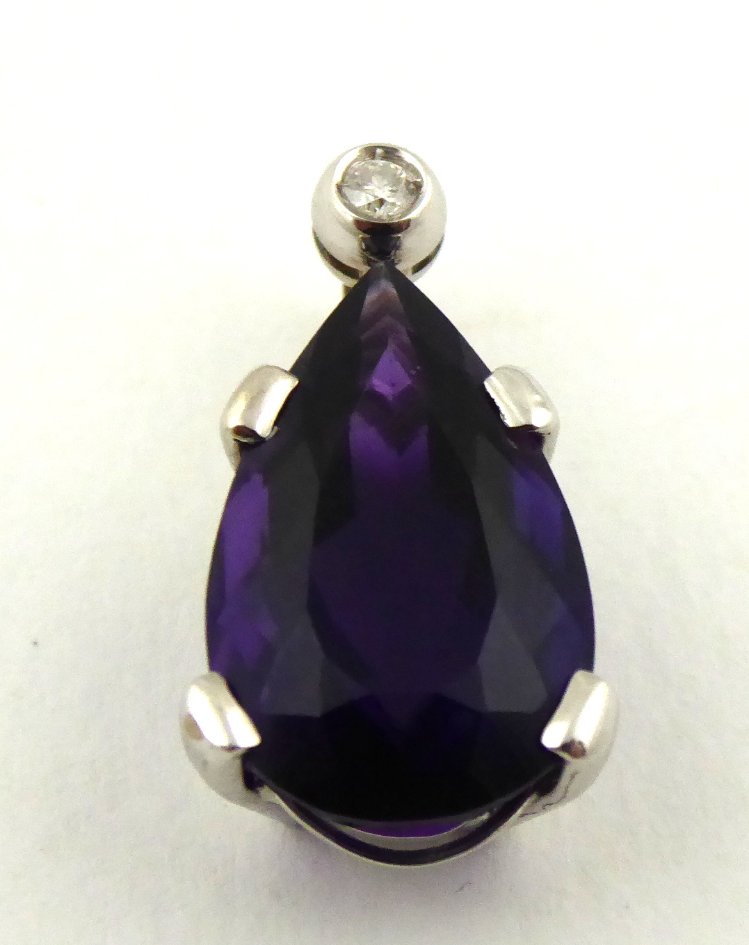 Osmnáctikarátové bílé zlato, přírodní ručně broušený velký ametyst, přírodní ručně broušený malý diamant. Ryzost Au 750/1000, celková hmotnost 3,9 g. Přívěsek z osmnáctikarátového bílého zlata s centrálním přírodním ametystem uprostřed ve tvaru kapky s oboustranným výbrusem doplněným v horní části přírodním diamantem o váze 0,05 ct, barva H, čistota SI. Značeno: československý punc kohout, ryzost 750, mistrovská značka. Itálie, třetí třetina minulého století. Rozměr přívěsku výška 20 mm, šířka 12 mm.