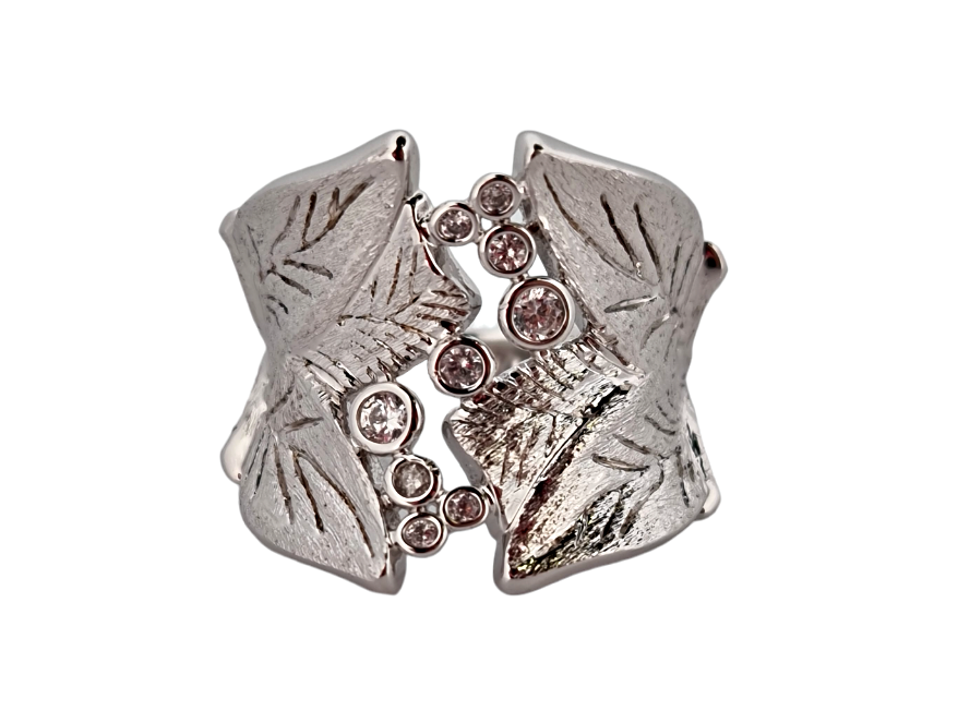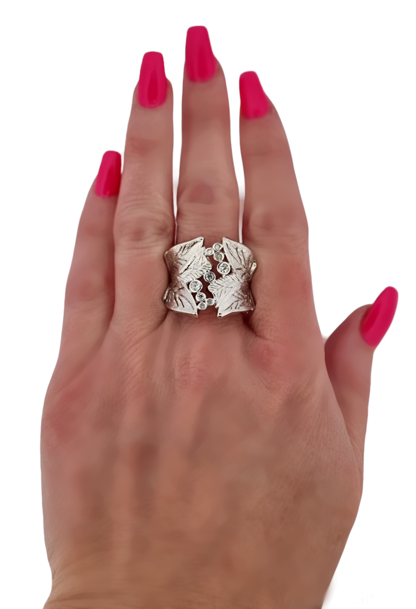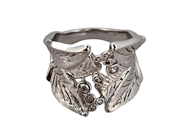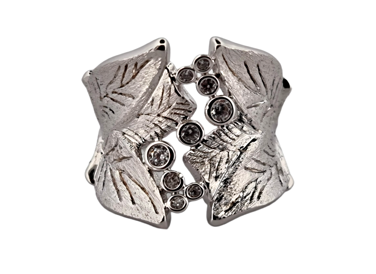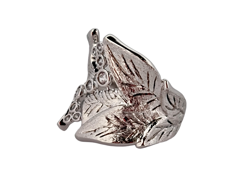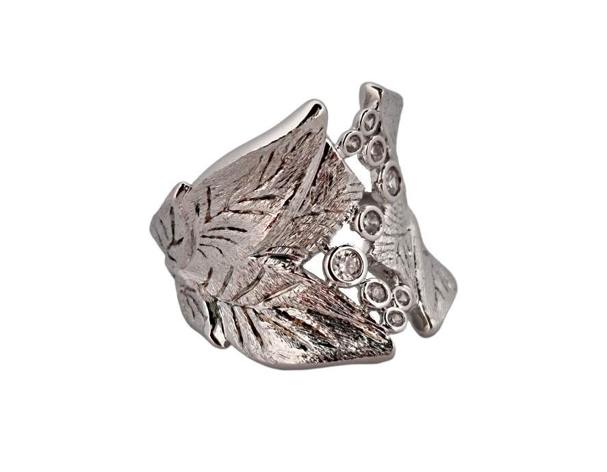 Rhodiovaný prsten střbrné barvy ve tvaru listů, obecný kov rhodiovaný, zdobený křišťály.