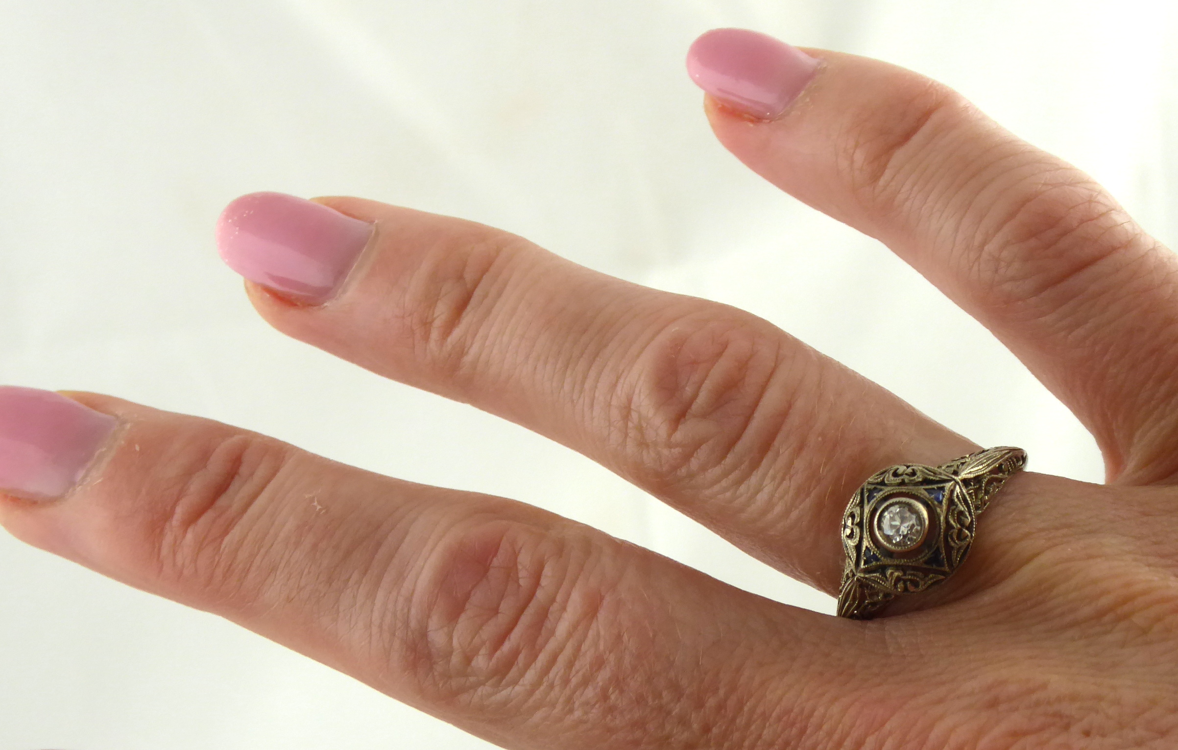 Osmnáctikarátové bílé zlato, přírodní diamant o váze 0,15 ct, čtyři přírodní malé safíry. Ryzost Au 750/1000, celková hmotnost 1,85 g. Prsten z bílého osmnáctikarátového zlata s centrálním přírodním diamantem starého briliantového brusu o váze 0,15 ct, barva I, čistota SI3 a čtyřmi malými přírodními safírky. Mistrovská šperkařská práce s jemně prořezávanými ornamenty. Značeno: československý punc kohout. Evropa, kolem roku 1900. Velikost 56.