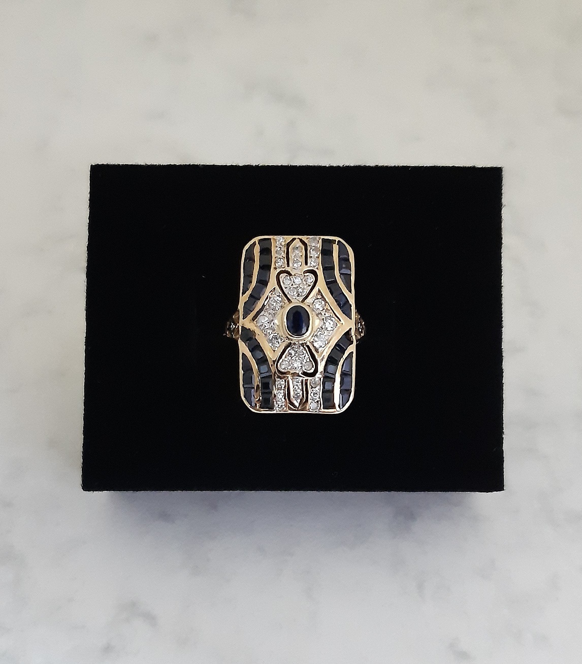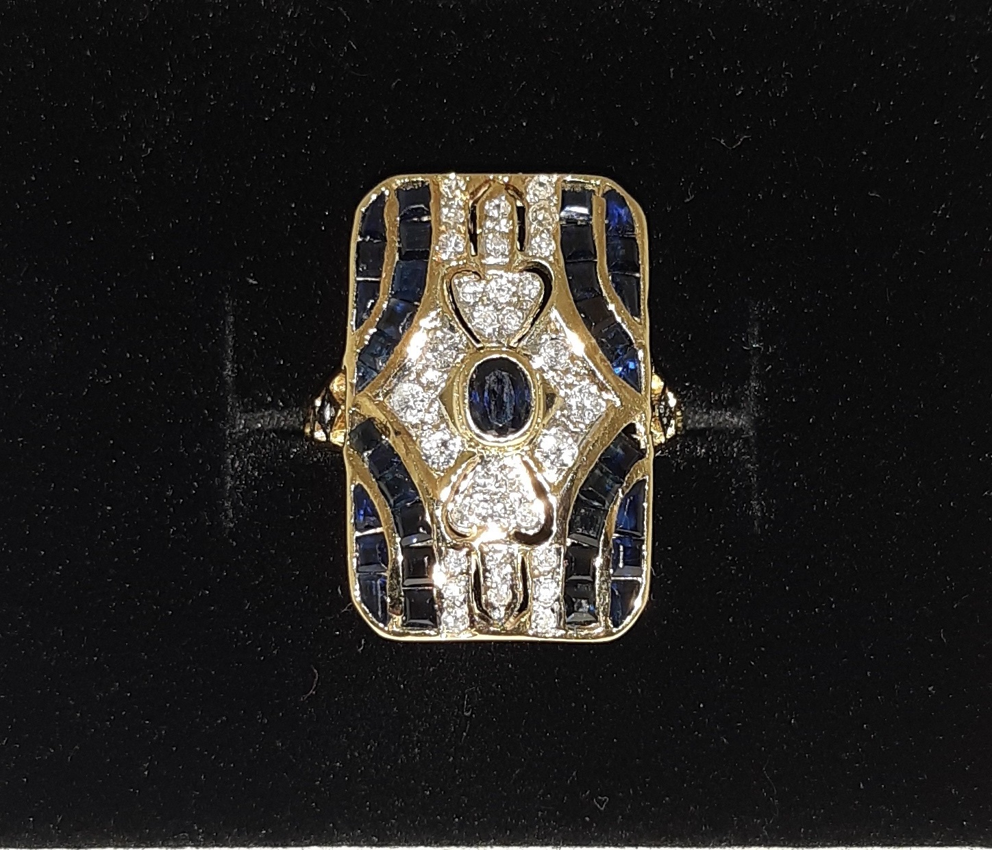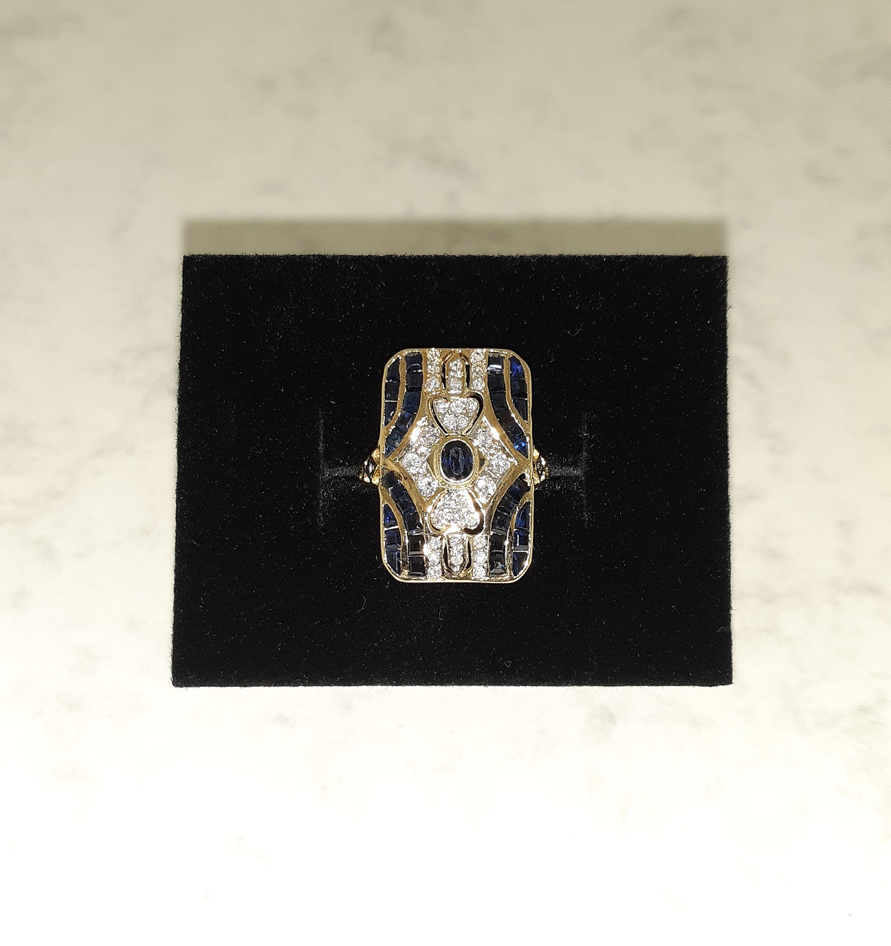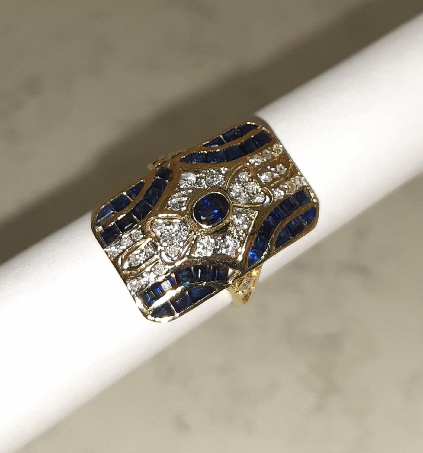 Krásný zlatý prsten se safíry a brilianty z období okolo roku 1930. Okolo největšího safíru uprostřed jsou ornamentálně zasazeny brilianty a v poslední řadě safíry.