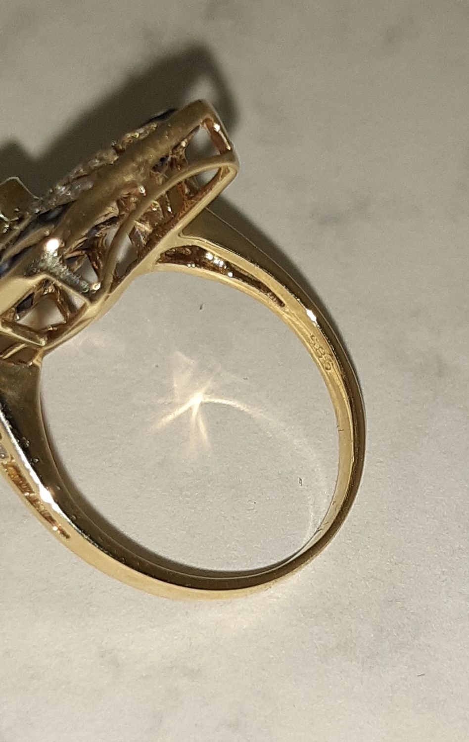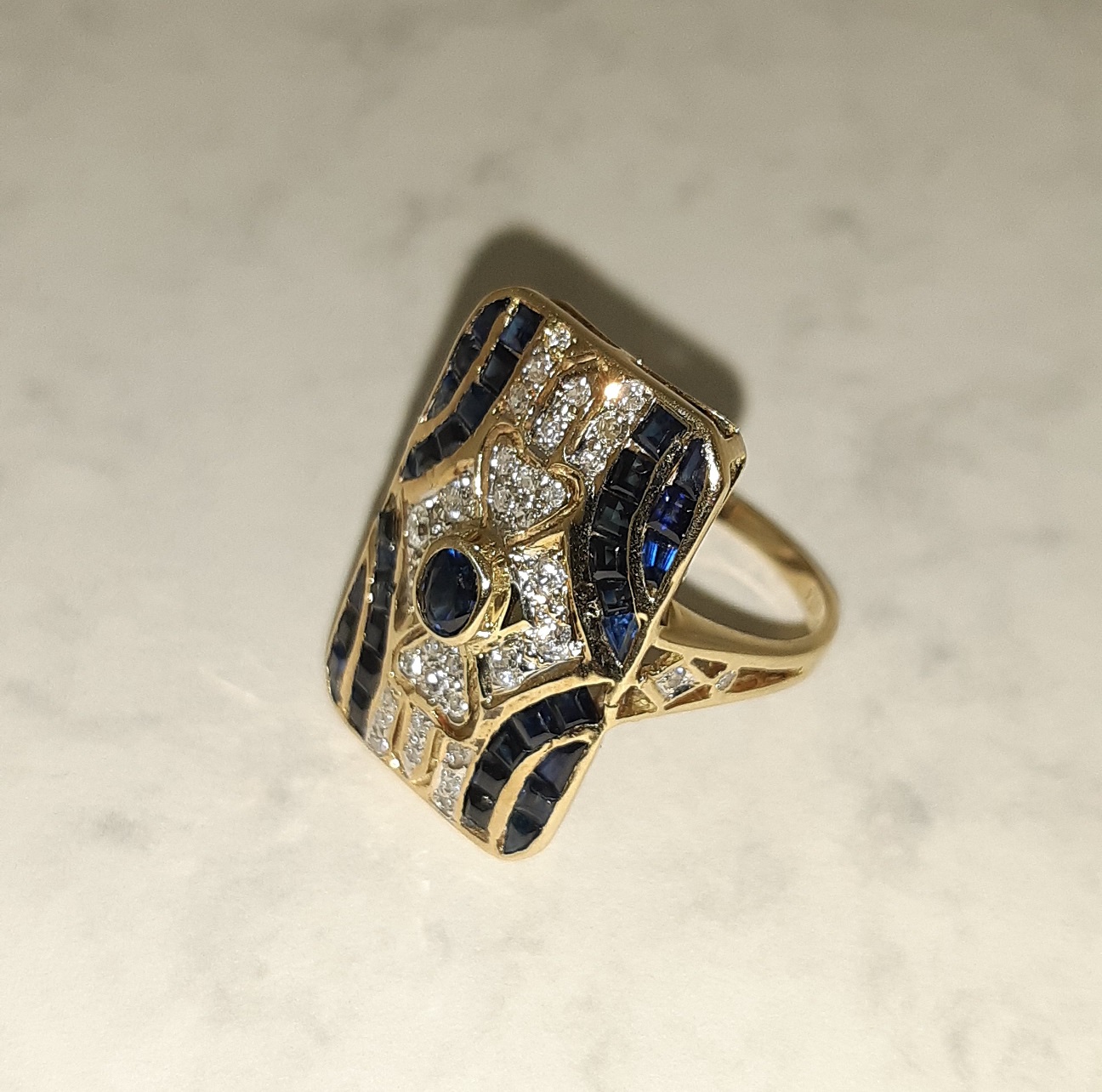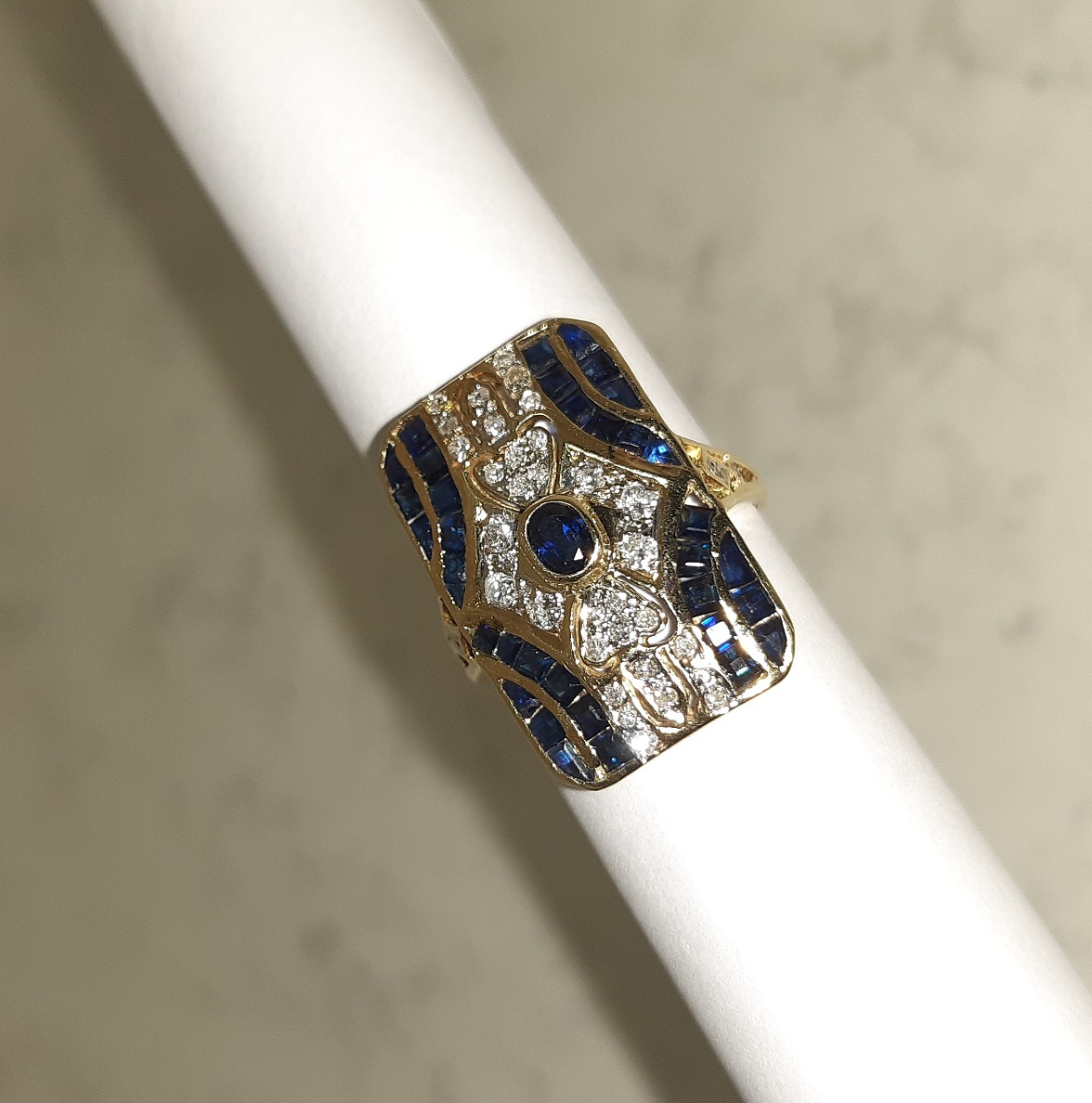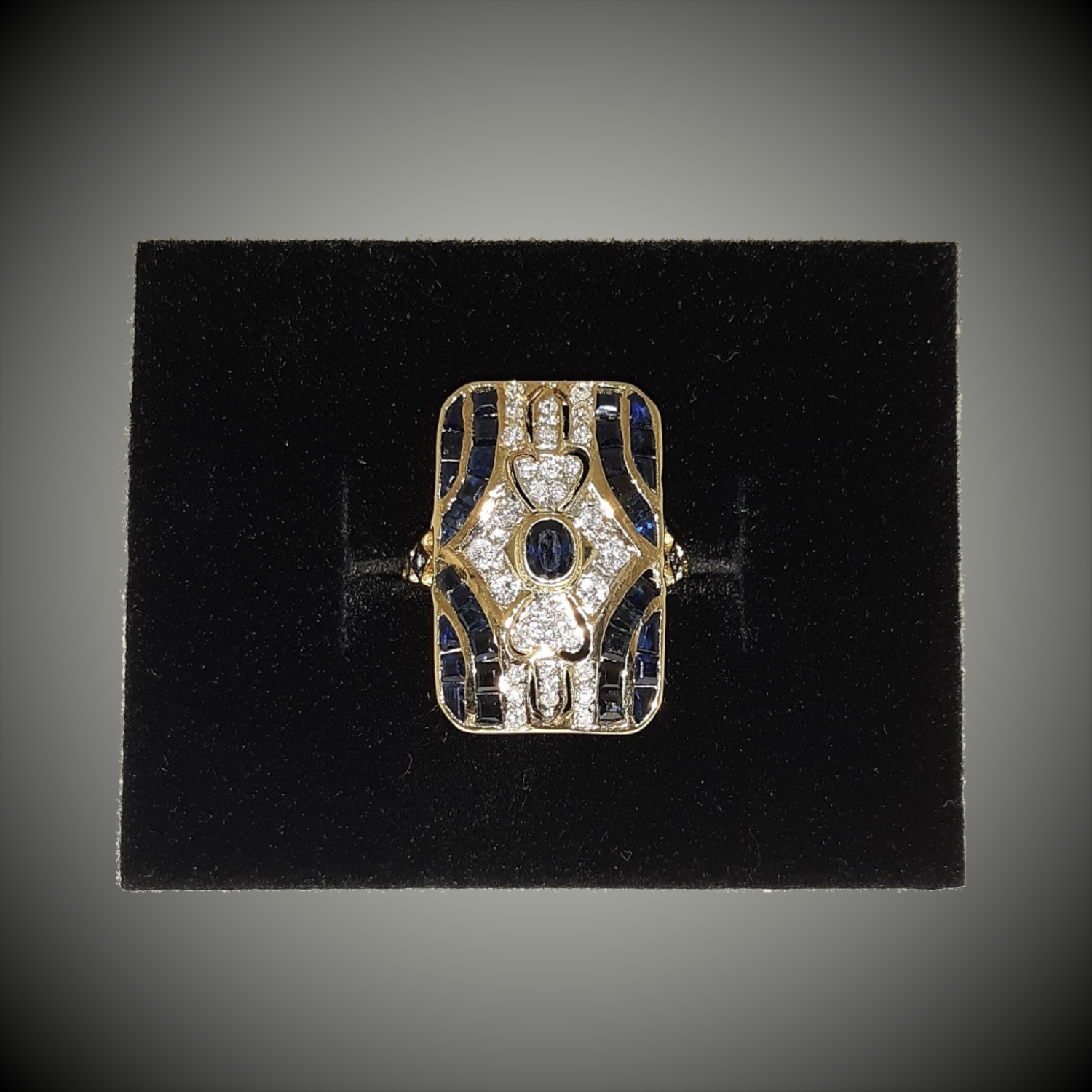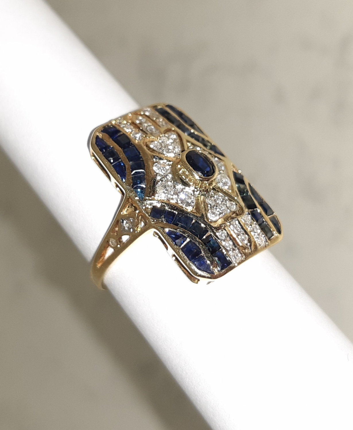 Krásný zlatý prsten se safíry a brilianty z období okolo roku 1930. Okolo největšího safíru uprostřed jsou ornamentálně zasazeny brilianty a v poslední řadě safíry.