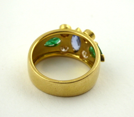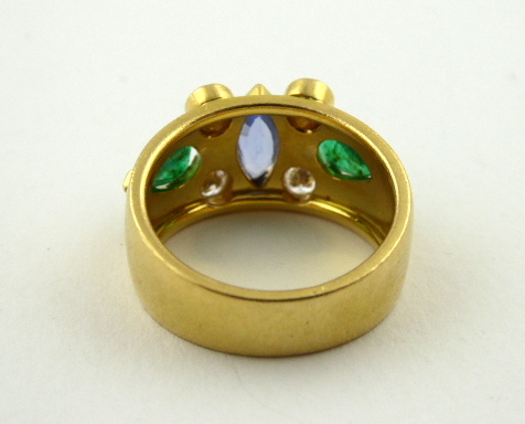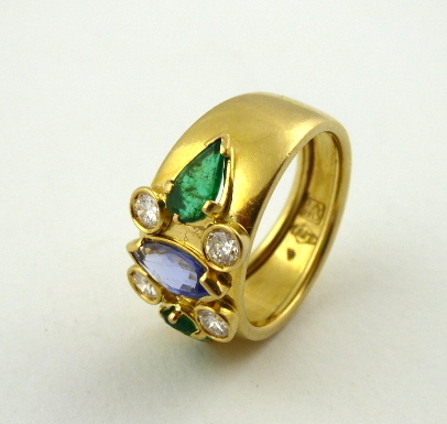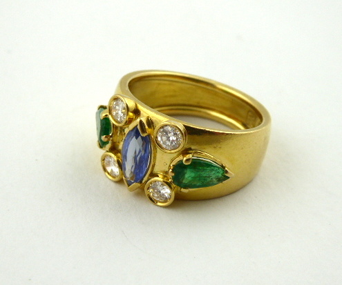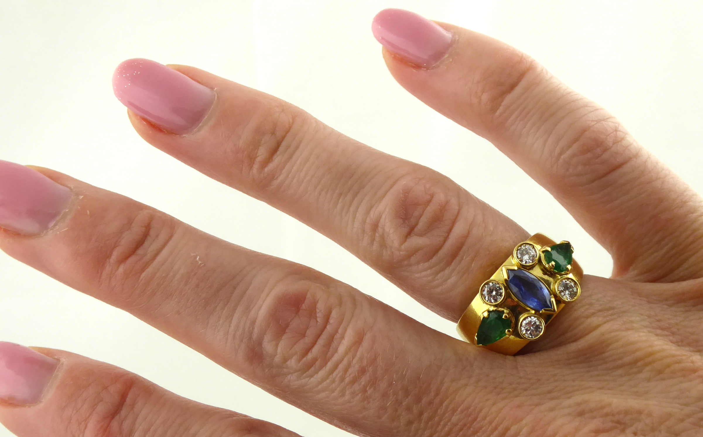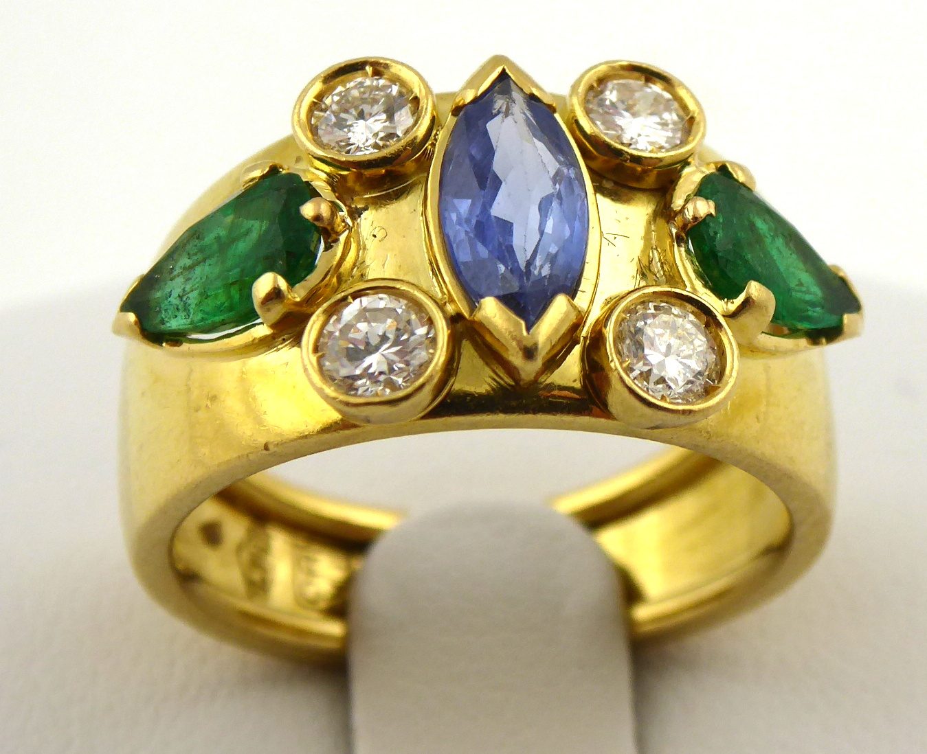 Osmnáctikarátové žluté zlato, přírodní smaragdy, přírodní safír a přírodní diamanty o celkové váze 0,45 ct. Ryzost Au 750/1000, celková hmotnost 6,93 g. Krásný designový prsten italské provenience se čtyřmi přírodními diamanty moderního briliantového brusu o celkové váze 0,45 ct, barva G, čistota SI2, dvěma přírodními smaragdy a jedním přírodním safírem. Prsten z osmnáctikarátového zlata s centrálním přírodním modrým safírem ručně broušeným do tvaru markýz, jehož po stranách doplňují dva přírodní zelené smaragdy výbrusu pendlok, okolo doplněné čtveřicí přírodních diamantů kulatého briliantového tvaru. Značeno: československý punc kohout, ryzost 750 a značka klenotnického mistra. Itálie, třetí třetina minulého století. Velikost prstenu 54.