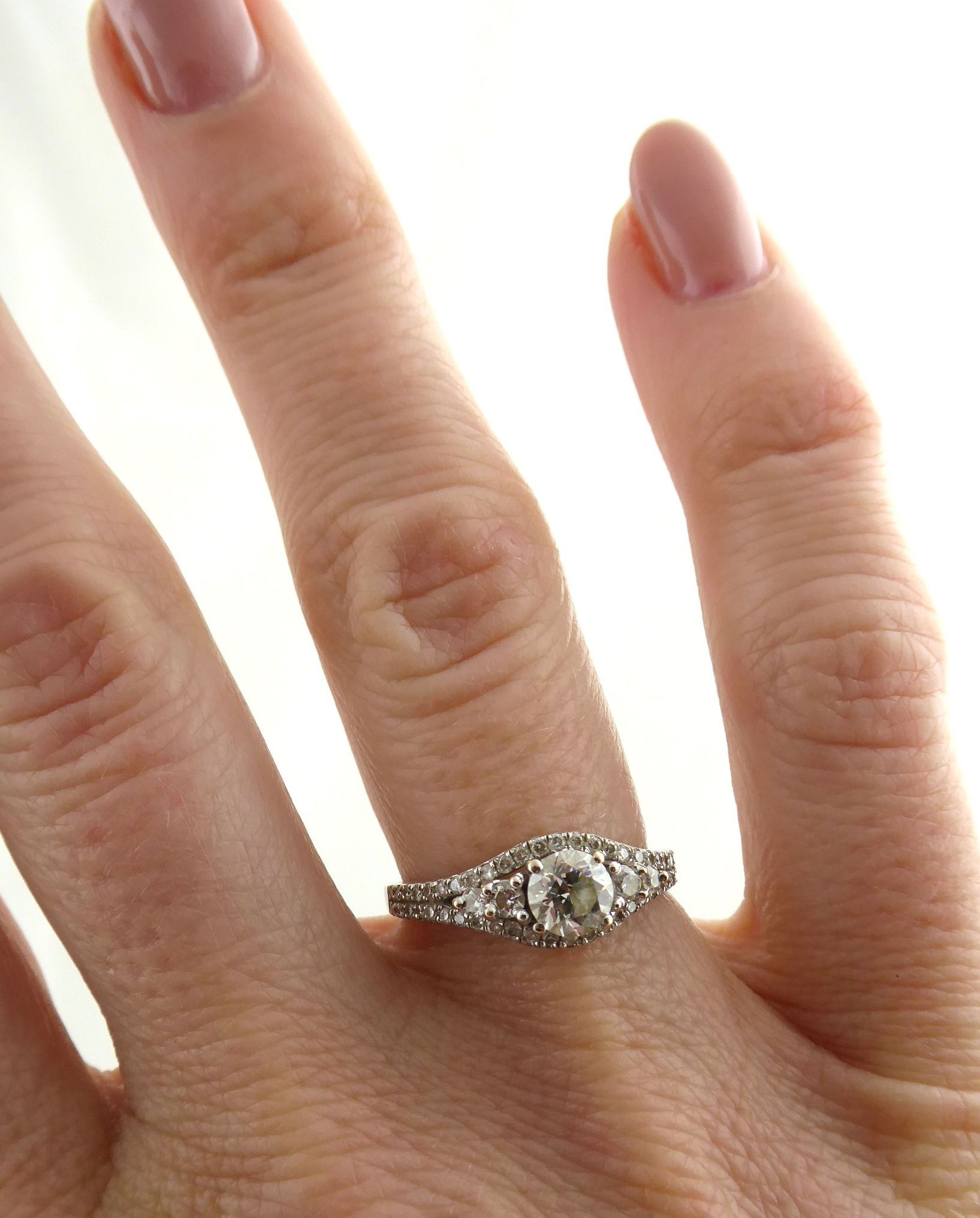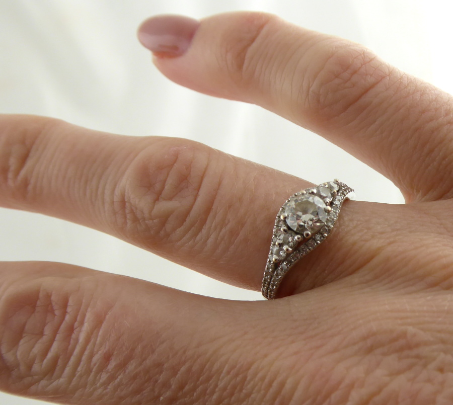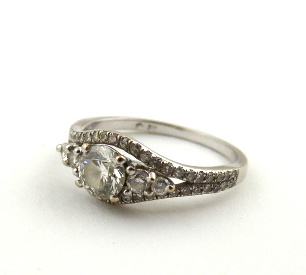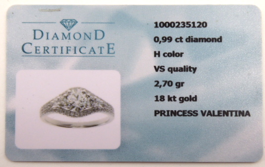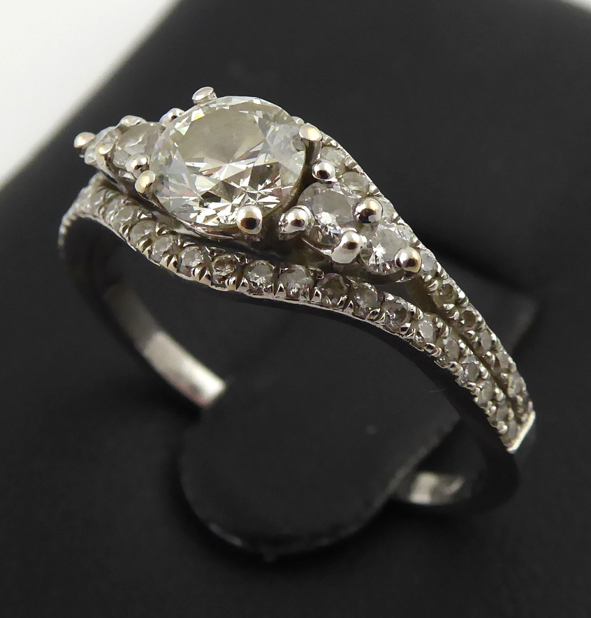 Osmnáctikarátové bílé zlato, 55 diamantů o celkové váze 0,79 ct. Ryzost Au 750/1000, celková hmotnost 2,67 g. Přiložen certifikát \\\“DIAMOND CERTIFICATE\\\“ o pravosti kamenů a ryzosti zlata. Prsten z osmnáctikarátového bílého zlata s centrálním diamantem moderního briliantového brusu o váze 0,60 ct doplněný 4 diamanty moderního briliantového brusu o celkové váze 0,14 ct a 50 diamanty moderního briliantového brusu o celkové váze 0,25 ct. Značeno: mistrovská značka, český punc kohout, leptaná ryzost 750 a písmeno D. Evropa, od roku 1995. Velikost prstenu 51.