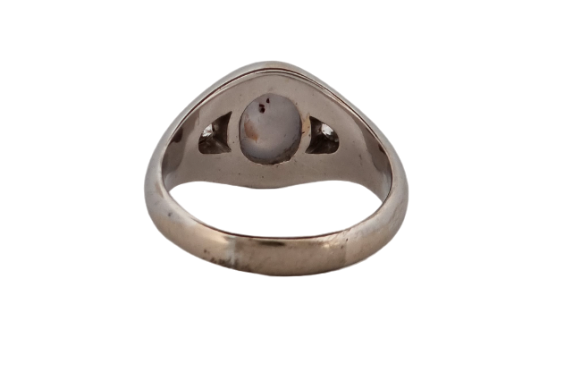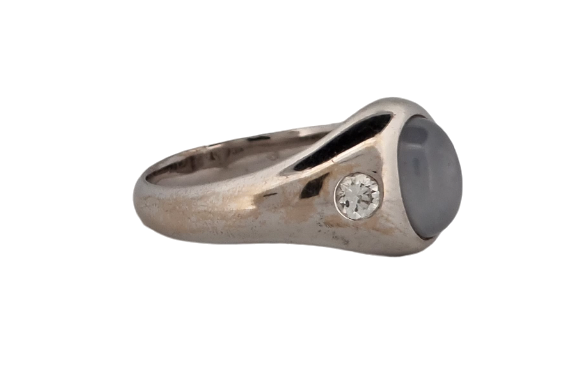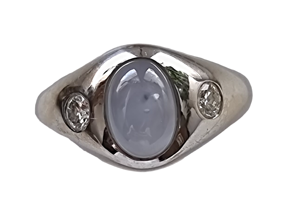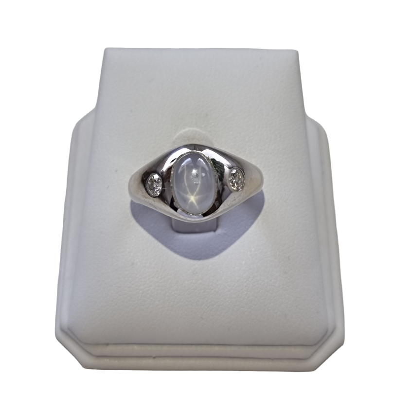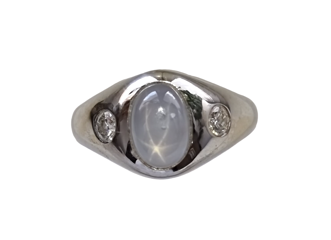 Popis: Masivní prsten z bílého zlata s přírodními diamanty a asterickým safírem.