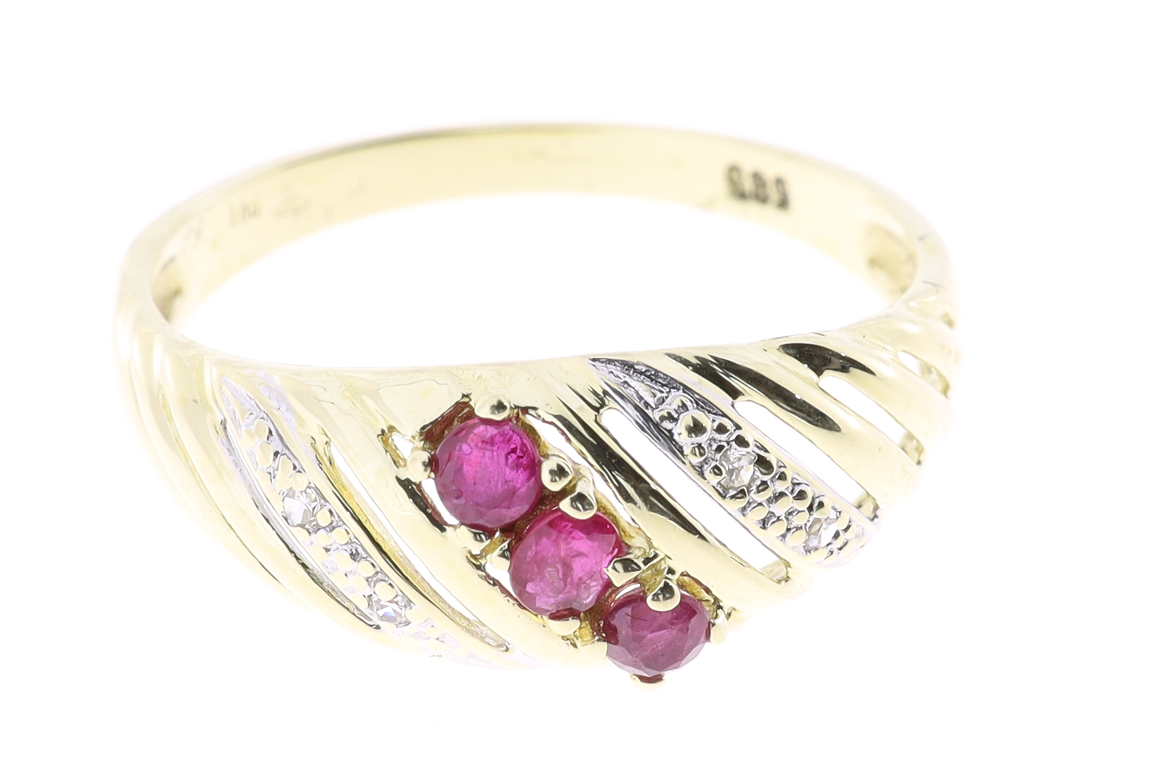 Jemný a elegantní prsten ze žlutého zlata o velikosti 58 a váze přibližně 2,28 g. Osazen je třemi výraznými rubíny a čtyřmi drobnými diamanty v 8/8 brusu, které dodávají šperku jemný třpyt. Ideální volba pro milovníky klasické elegance a barevných drahokamů.