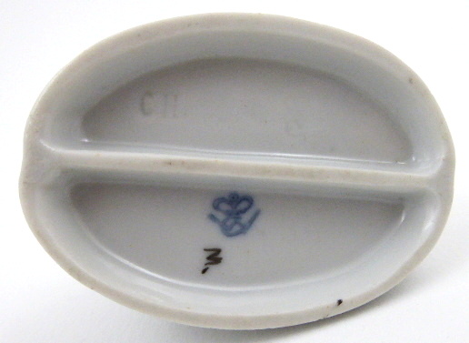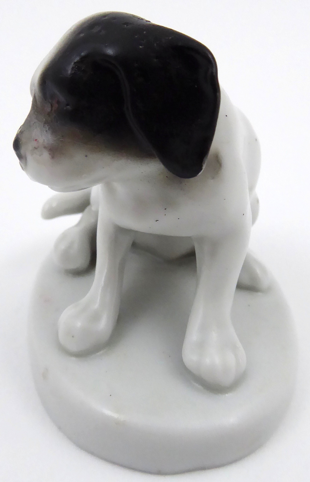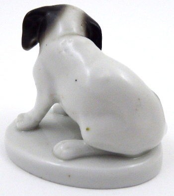 Bílý a ručně barevně malovaný porcelán. Věrně zachycená figurka sedícího psíka. Značeno zespodu: modrá a vtlačená značka, vtlačená písmena C.H., značka malíře. Německo, Oeslau 1935 – 1949. Výška 5,5 cm, rozměr podstavce 6,5 cm x 4,5 cm.