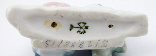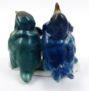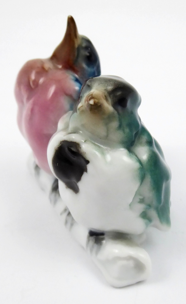 Bílý a barevně ručně malovaný porcelán. Karl Ens, Volkstedt. Porcelánové něžně jemné sousoší dvou pestrobarevných načepýřených ptáčků sedících na podstavci ve tvaru stylizované větvičky. Značeno zespodu: značka výrobce a ručně psaná čísla. Německo, Volkstedt 1919 – 1945. Výška 6,5 cm.