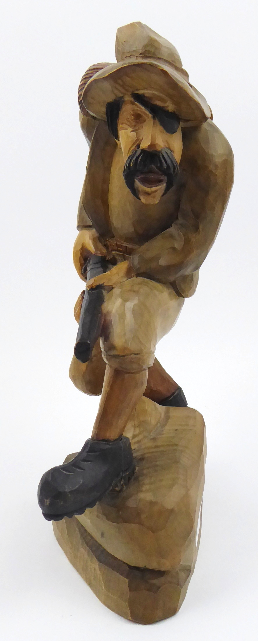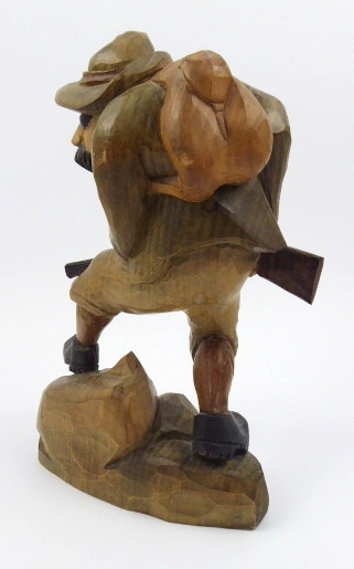 Barevně kolorovaná a mořená ruční dřevořezba. Dřevořezba jednookého pytláka v klobouku a pytlem na kořist na zádech plížícího se lesem s puškou v ruce. Žertovně ztvárněná figura. U lýtka pravé nohy lepená část. Střední Evropa 1890 – 1940. Výška 30 cm.