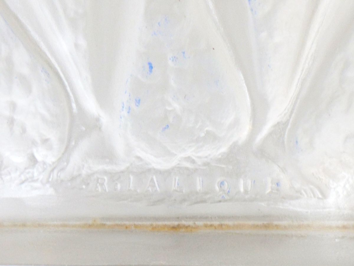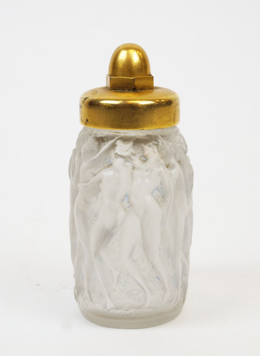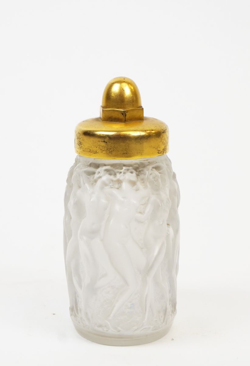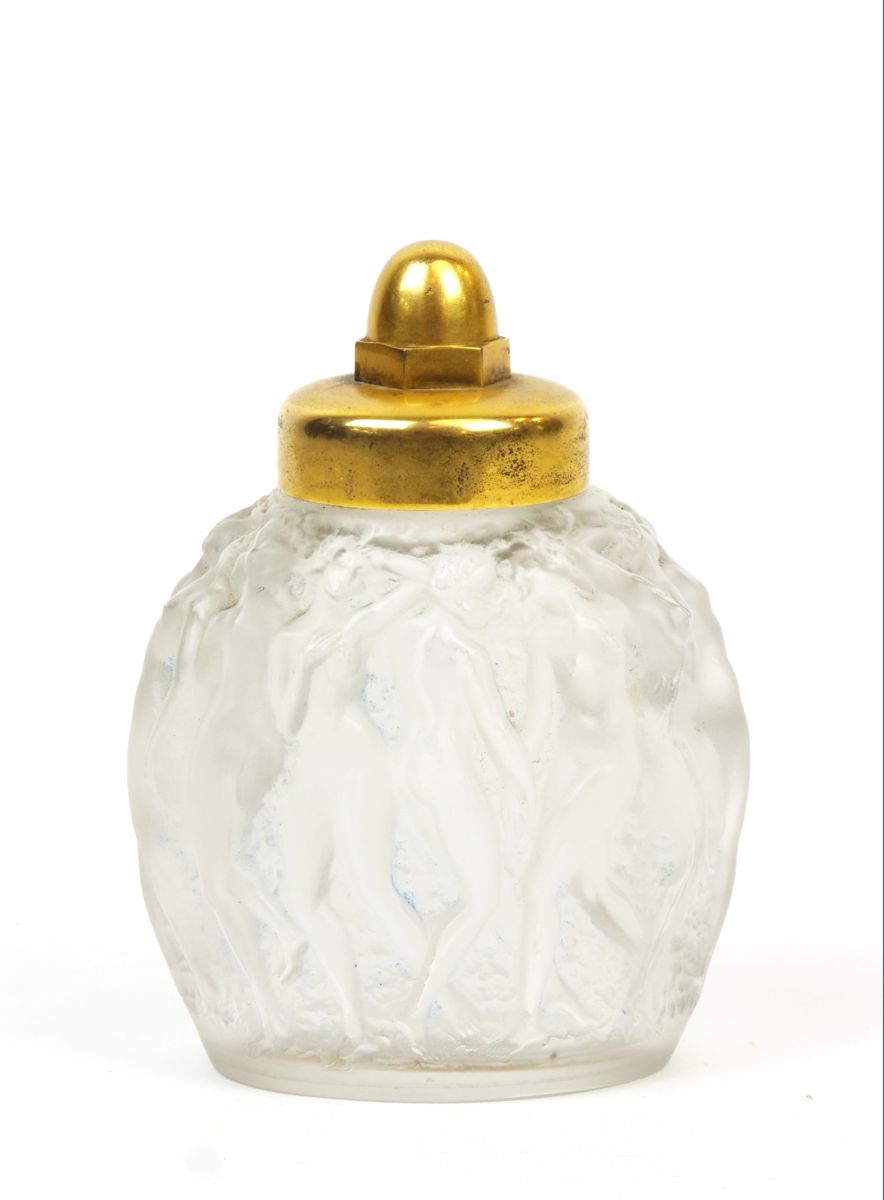 flakon z lisovaného matovaného skla s reliéfním dekorem nahých žen, značeno LALIQUE, na spodní straně značka prodejce ”Molinard Paris France”; uzávěr ze zlacené mosazi, Francie, kolem roku 1930; výška 11 cm, šířka 8 cm; sběratelsky zajímavé