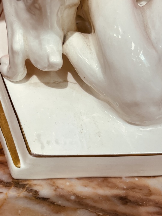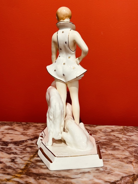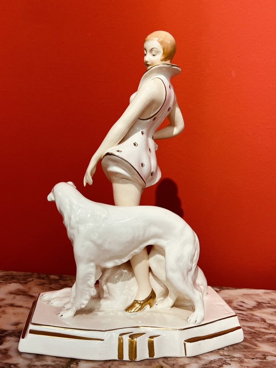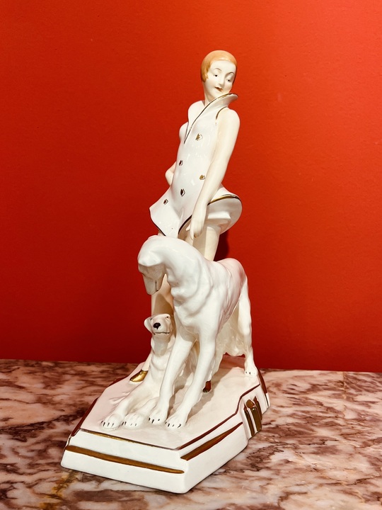 Royal Dux, Dáma se dvěma chrty, Čechy, 20. léta 20. století, období Art Deco, porcelán zlacený, glazovaný,