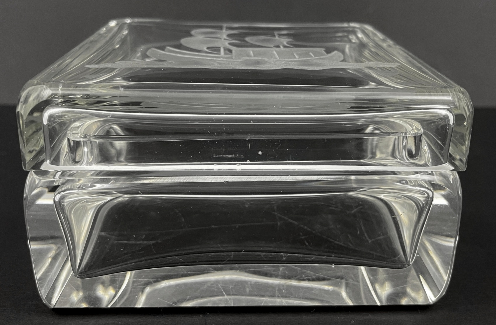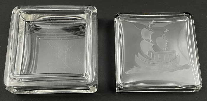 Ručně broušené bezbarvé sklo. Elegantní skleněná dóza čtvercového tvaru z bezbarvého skla s efektní rytinou mořského korábu plujícího na vlnách. Československo 1920 – 1945. Rozměr dózy: 11 cm x 11 cm, výška 6,5 cm.