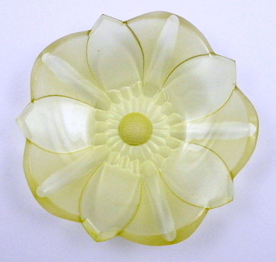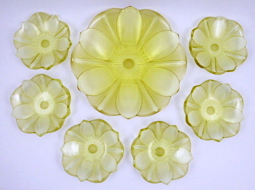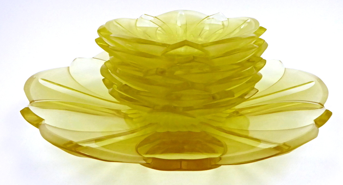 Ručně broušené a matované sklo v barevnosti připomínající Eldor od firmy Moser. Období a styl: art deco. Návrh a výroba: Rudolf Hloušek (1909-1992) založil roku 1930 v Železném Brodě firmu na umělecké zpracování skla. Některé modely pro něho navrhoval i Alois Metelák. Za své broušené sklo získala Hlouškova rafinérie na Světové výstavě v Bruselu v roce 1935 cenu Grand Prix. Sada mísy se šesti miskami ve tvaru květu ve střídavé kombinaci čiré a matované plochy. Základna zdobená ručně broušenými fazetami a diamantovým brusem. Ve výborném stavu. Československo, Železný Brod, 30. léta minulého století. Průměr mísy 28 cm, průměr misek 15 cm.