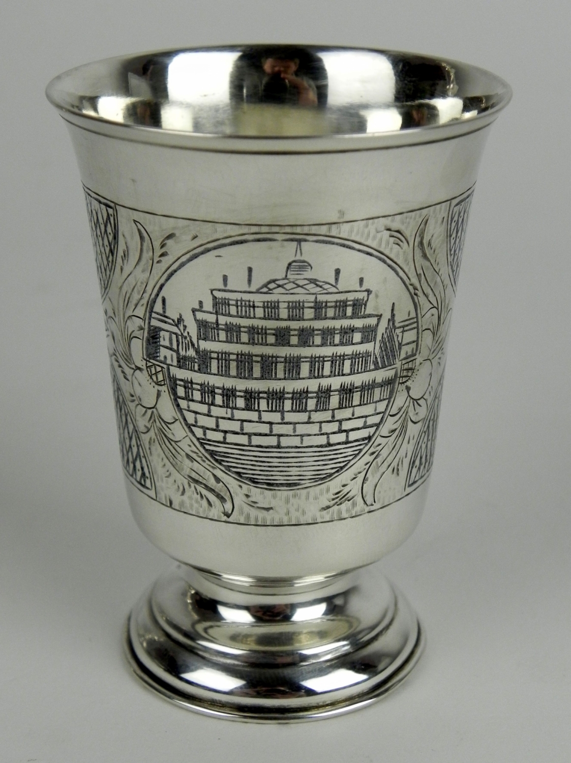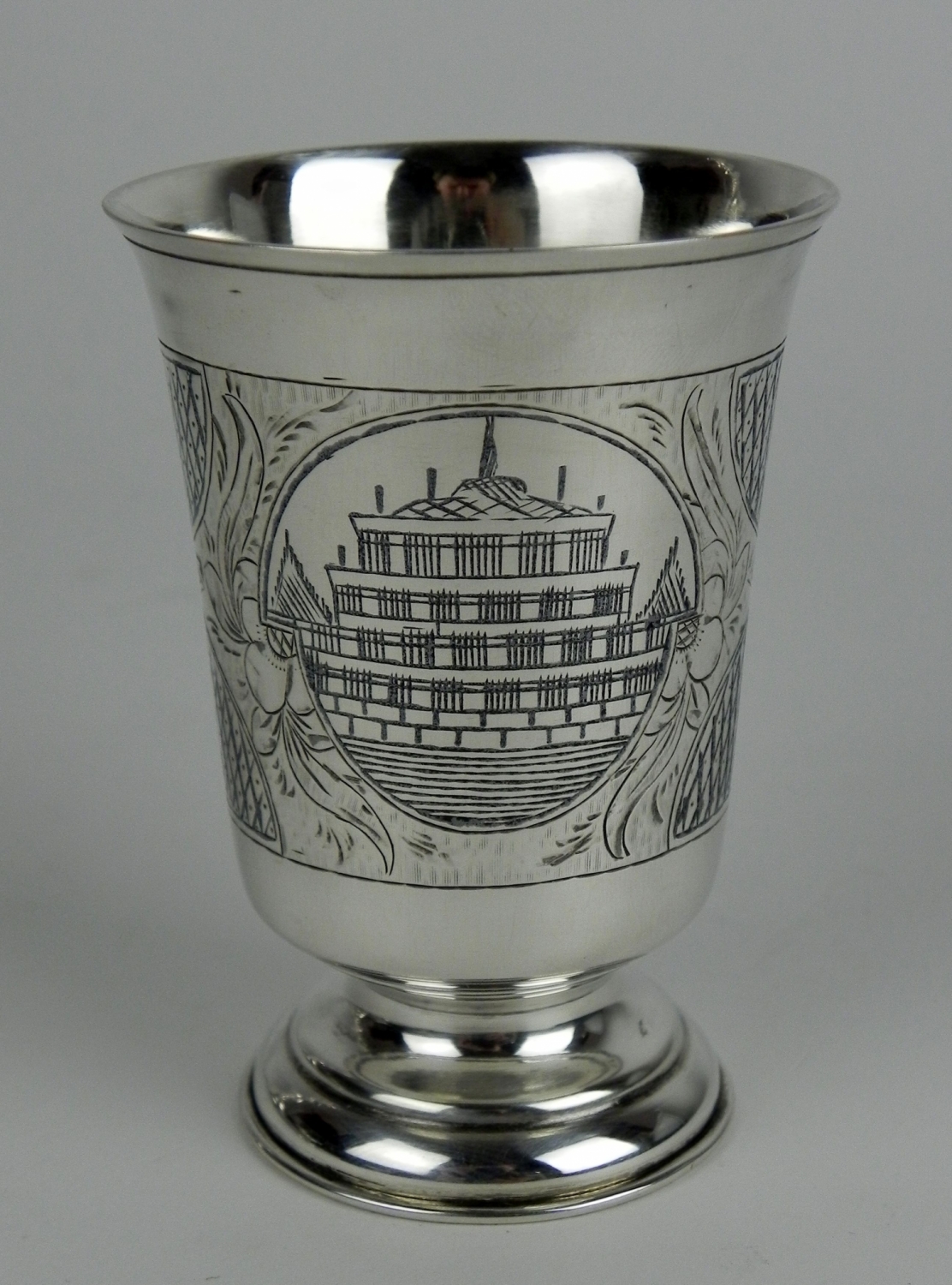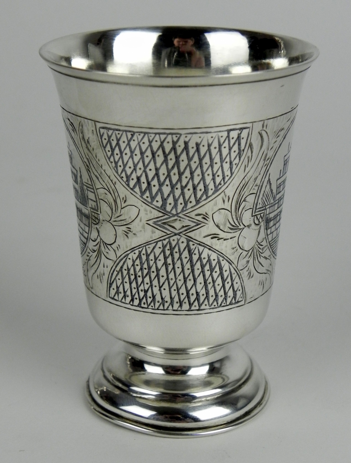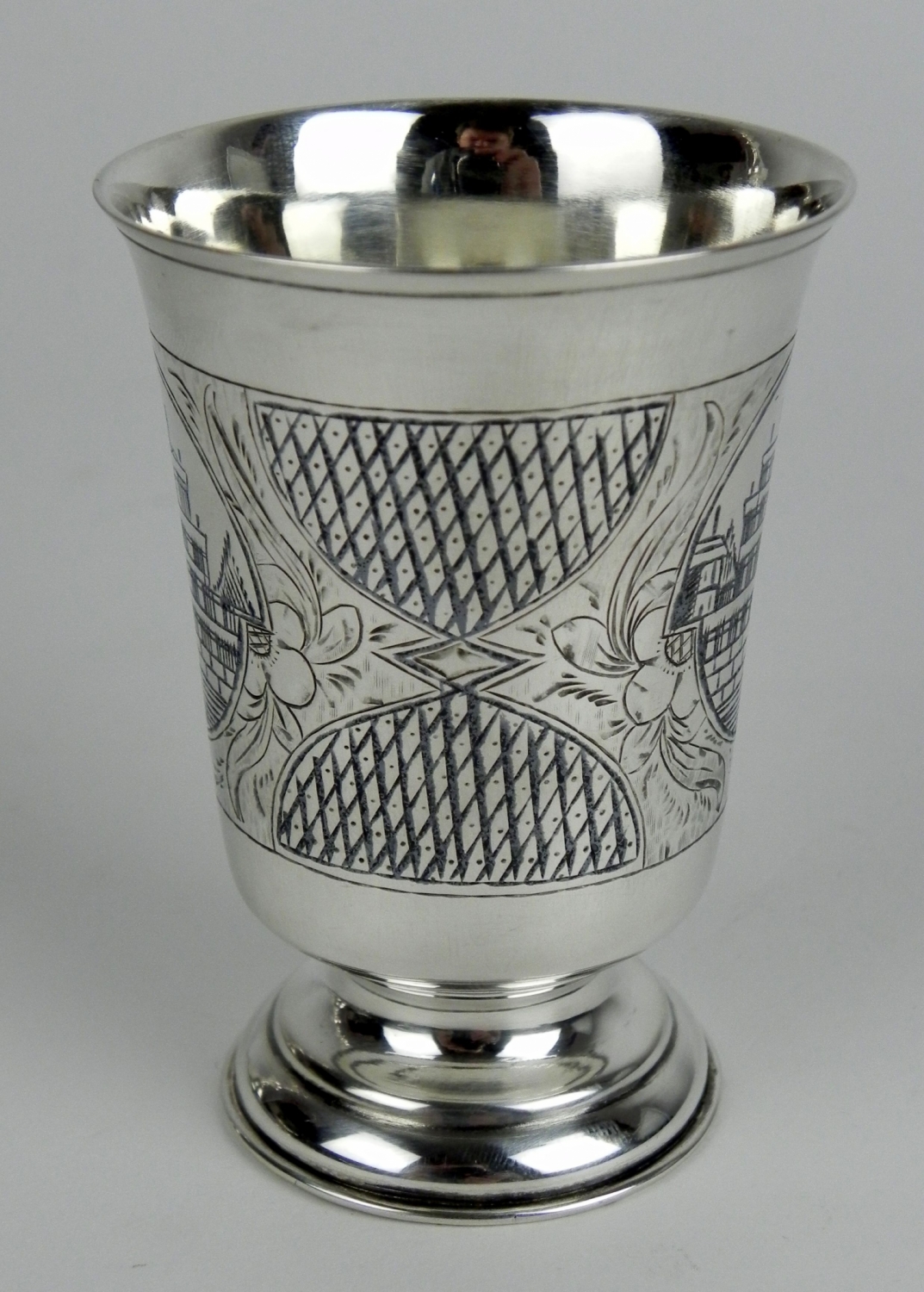 Ruský stříbrný pohárek zdoben zlatnickou technikou niello – tulla, Ag 875/1000, váha 70,30 g, datováno 1873; rozměry: výška 8,5 cm, průměr 6,2 cm