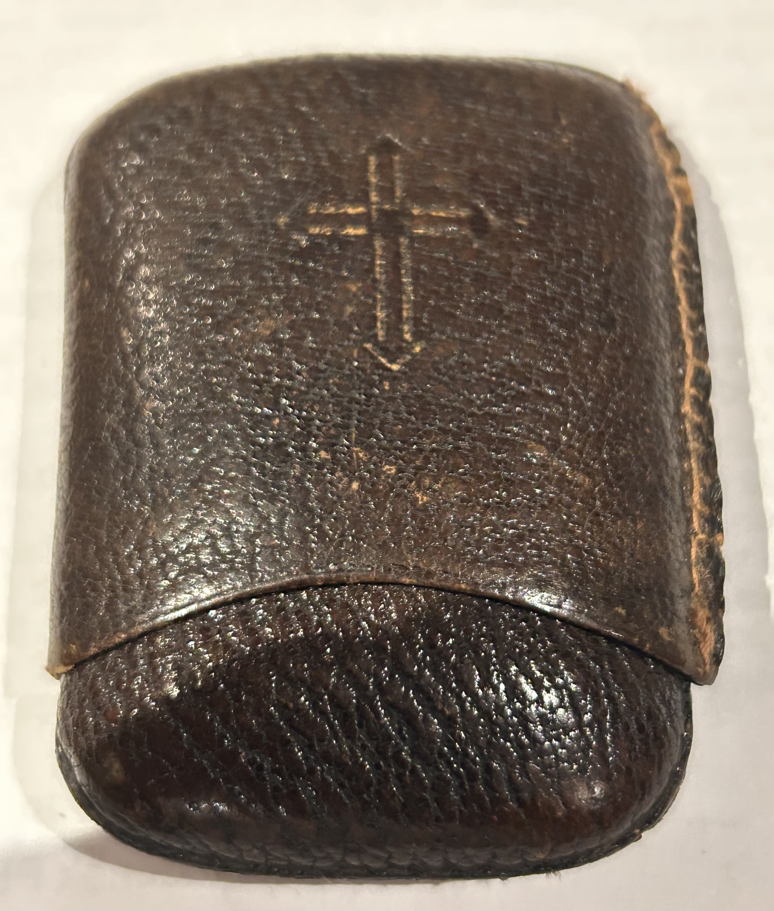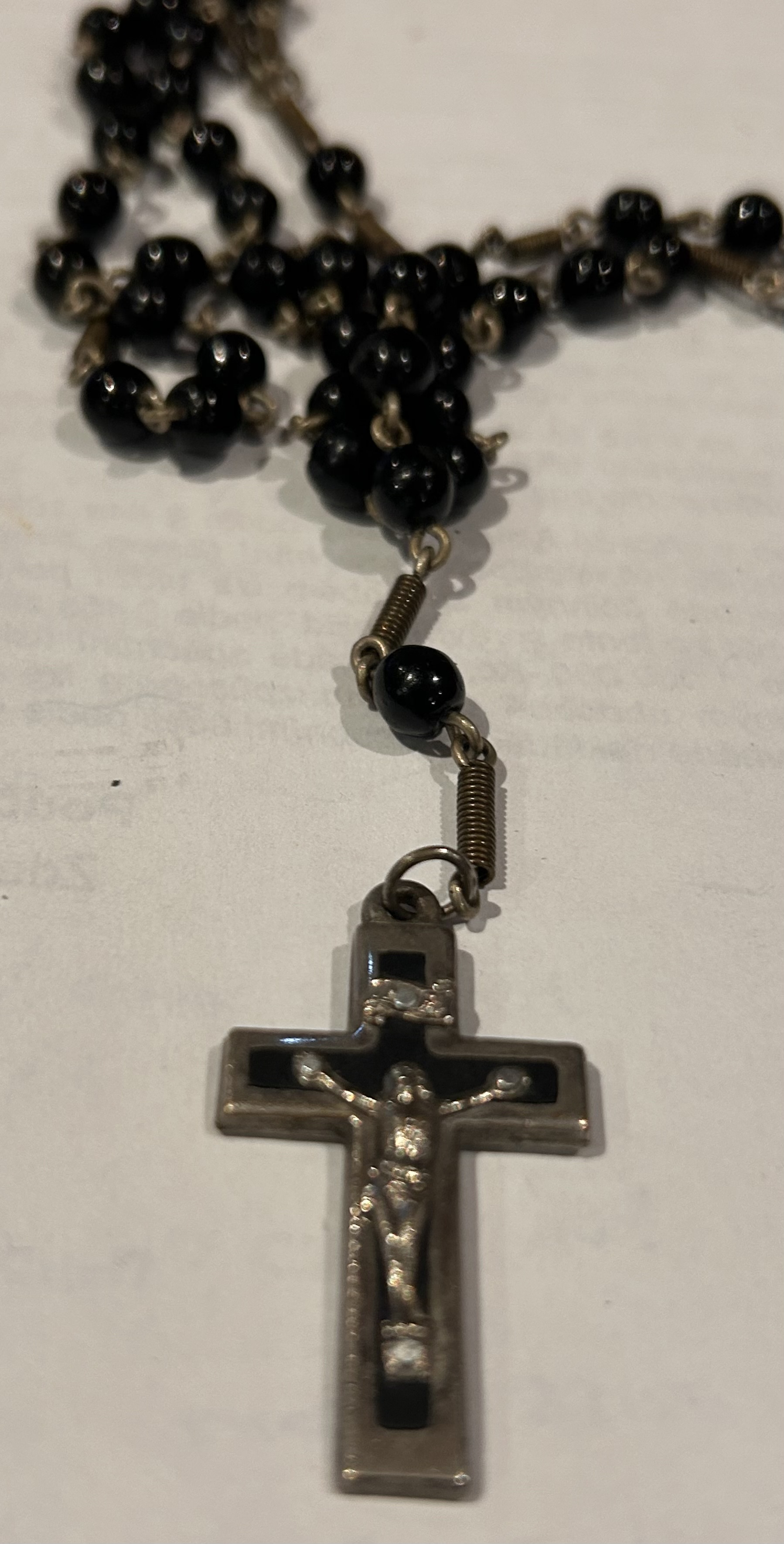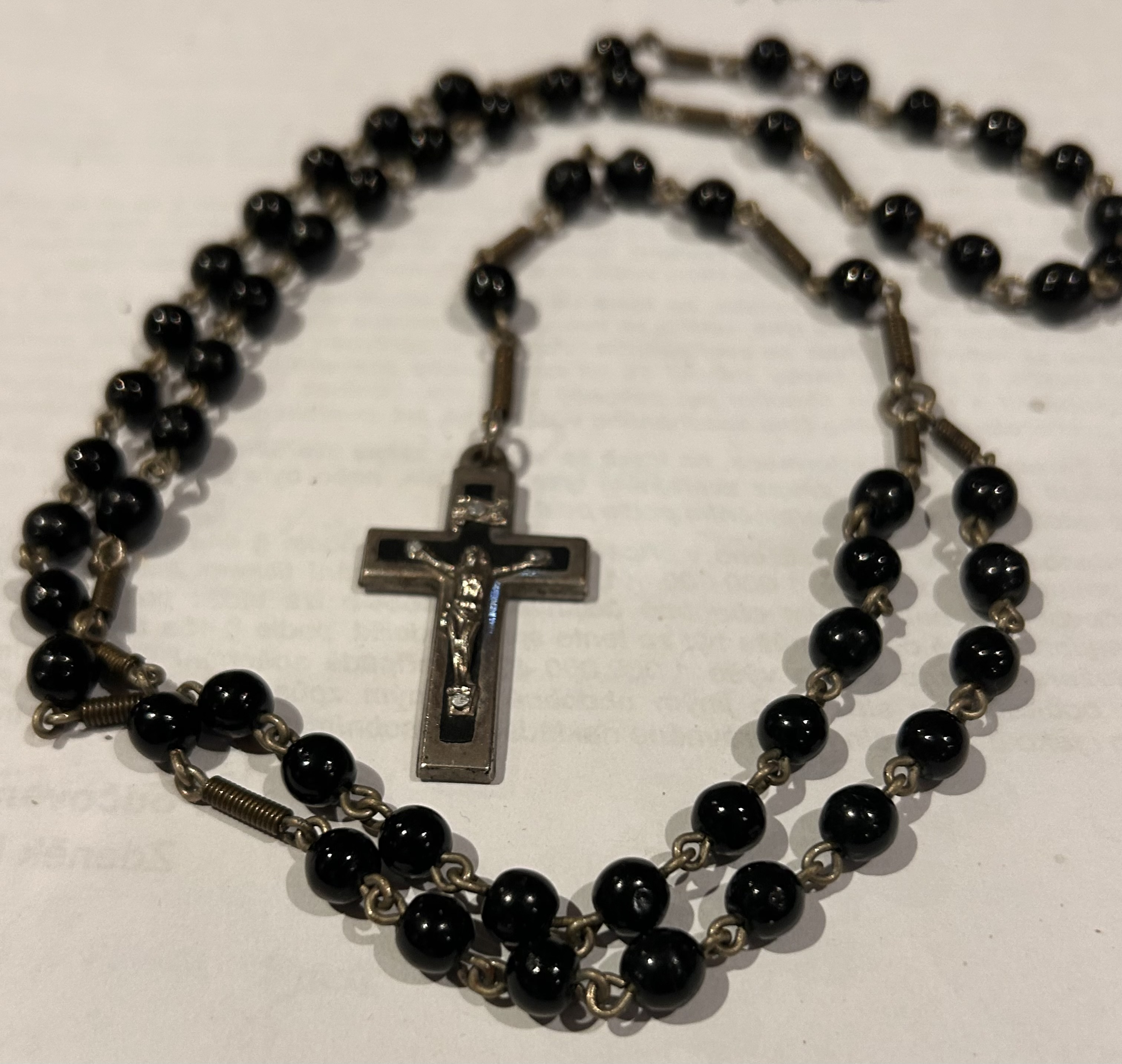 Elegantní starožitný růženec,tvořen starými skleněnými páteříky 5×10,mělo svůj význam,jsou různé typy,zde celkem 59 korálků,vynikající stav včetně vkusného koženého pouzdra ,rozměr 7x6cm