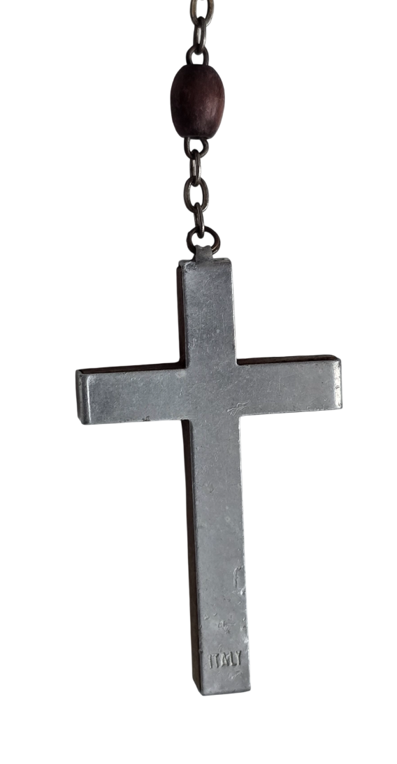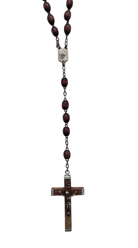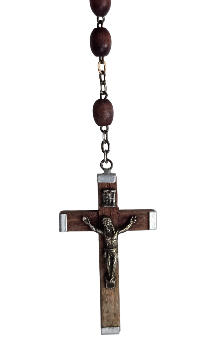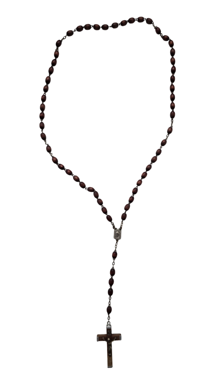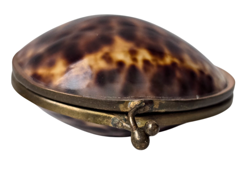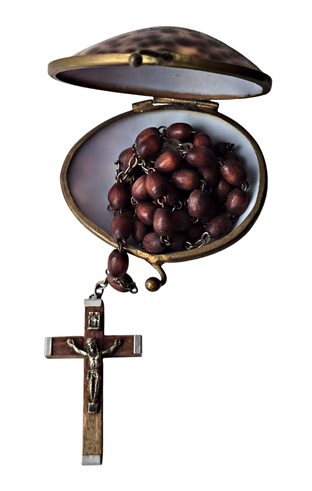 Popis: Starožitný růženec v původní etui z přírodní mušle hnědé barvy s výrazným žíháním. Kovové lemování, plně funkční zavírání. Růženec je ze dřeva, doplněný kovovými prvky stříbrné barvy. Rarita.