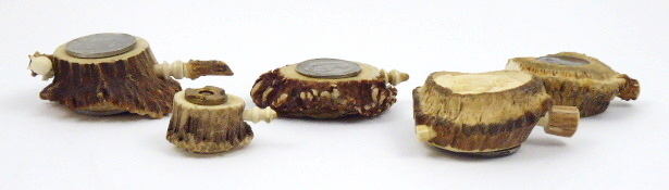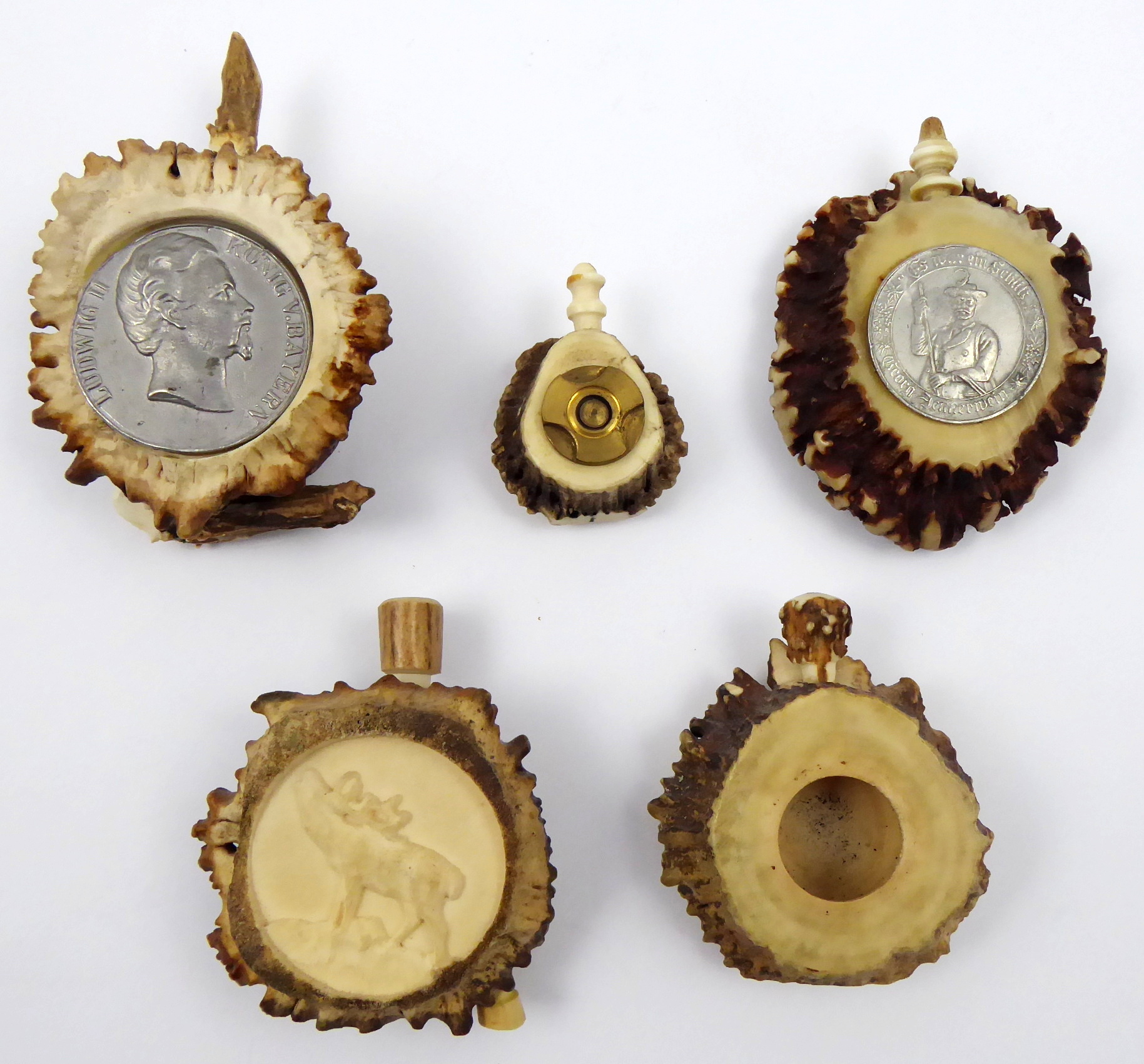 Paroží a medaile. Rozměrově nejmenší dózička je bez uzávěru. Sada pěti dóziček na šňupavý tabák vyřezaná z paroží zdobená medailemi s různými motivy. Jedna z dóziček dekorovaná ručně vyřezávanou reliéfní figurou jelena. Německo, minulé století. Rozměry: 10 cm x 7,5 cm, 9,5 cm x 8 cm, 12 cm x 8 cm, 8 cm x 7,5 cm a 6 cm x 4,5 cm.