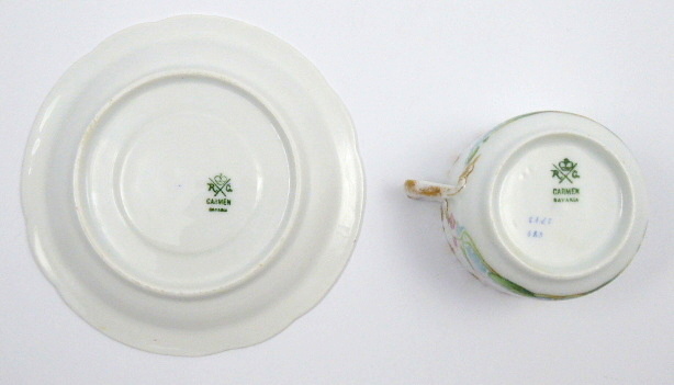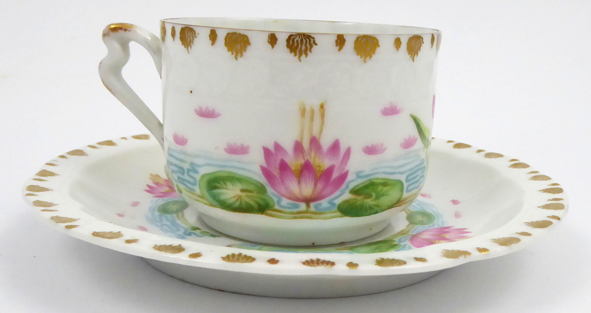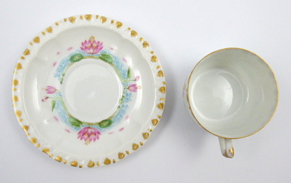 Bílý a barevně ručně malovaný a zlacený porcelán. Porcelánka Rosenthal. Šálek z bílého porcelánu s reliéfním věnečkem u horního okraje dekorovaný zlacením a ručně malovanými květy růžového lotosu s listy a úponky na vodní hladině. Stejný ručně malovaný dekor zdobí i podšálek s reliéfním žebrováním. Značeno zespodu: značka Rosenthal, název vzoru CARMEN, BAVARIA a značka malíře. Německo, Rosenthal 1898 – 1906. Výška šálku 5 cm, průměr podšálku 14 cm.