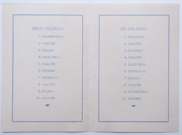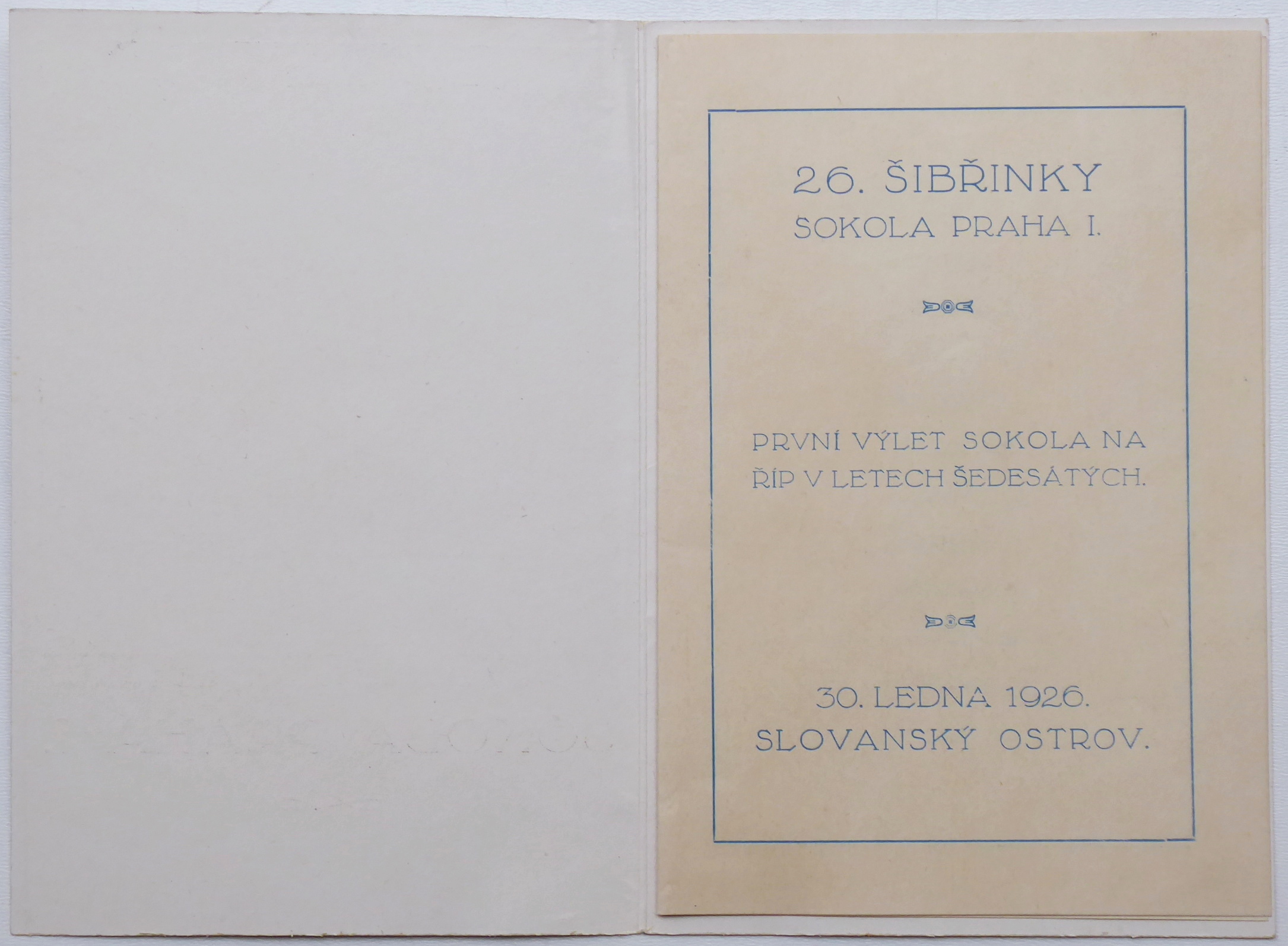 Československo, rok 1926. Hlubotisk na papíru 14,7 cm x 10 cm. Autor: Ladislav Šaloun (1870-1946). Vytiskla firma: Umělecká reklama Jan Ziegloser. Uvnitř vložen originální taneční pořádek. Nerámováno.