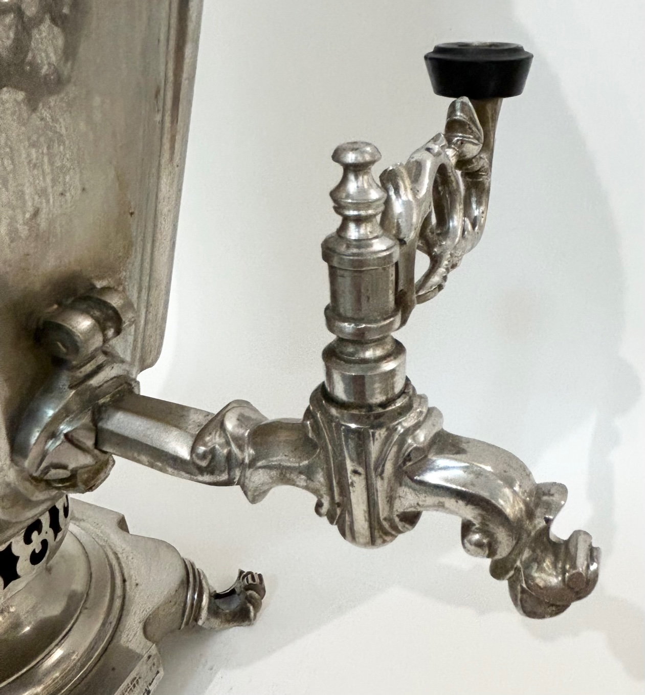 Samovar o čtvercové základně opatřené nožkami s dvěma postranními úchytkami. Součást podnos s miskou.