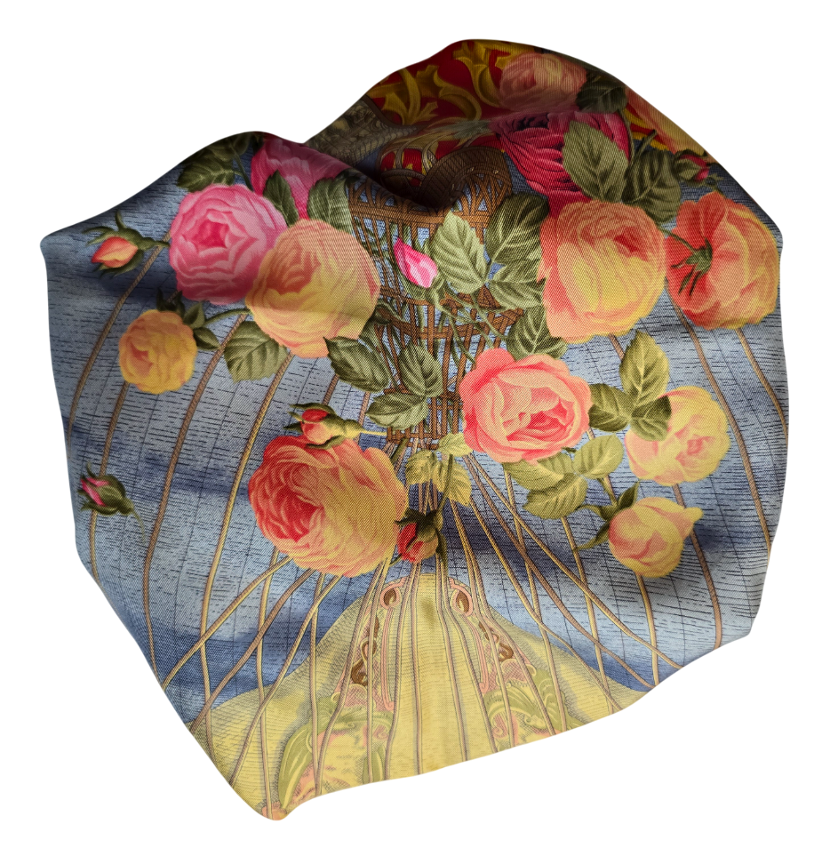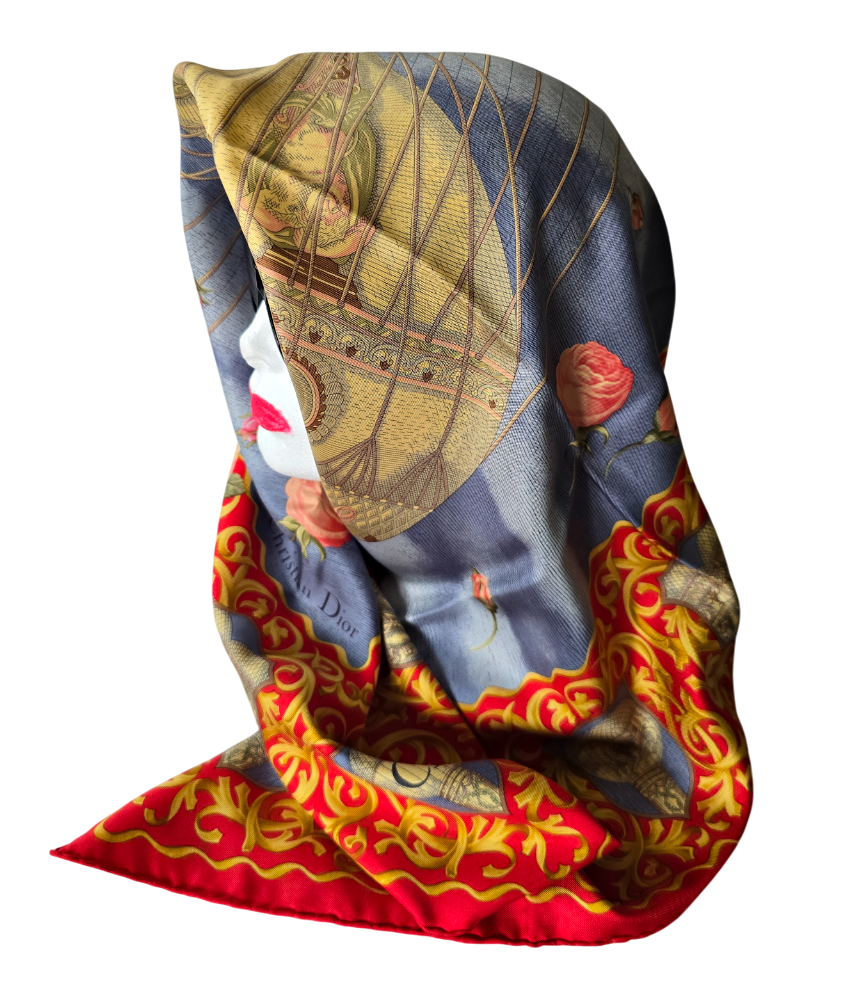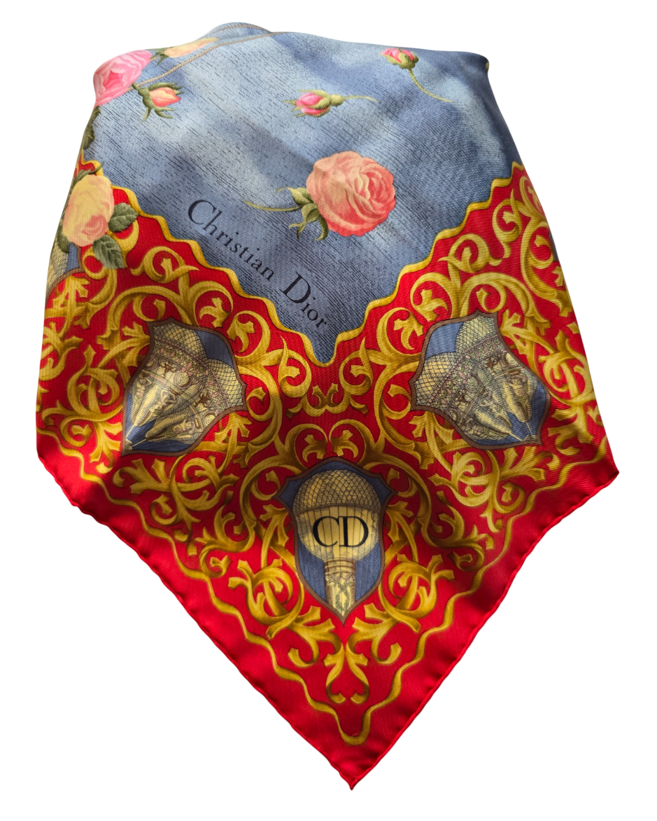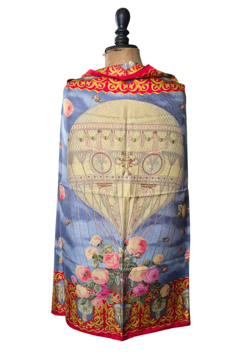 Popis: Šátek značky Christian Dior s propracovanými motivy létajícího balónu a růží. Hedvábí. Ručně rolované lemy do líce. V pravém dolním rohu vetkaná signace plus iniciály. V horním dekoru balónu nepatrně porušená tkanina. Jinak stav perfektní. Výjimečný doplněk.