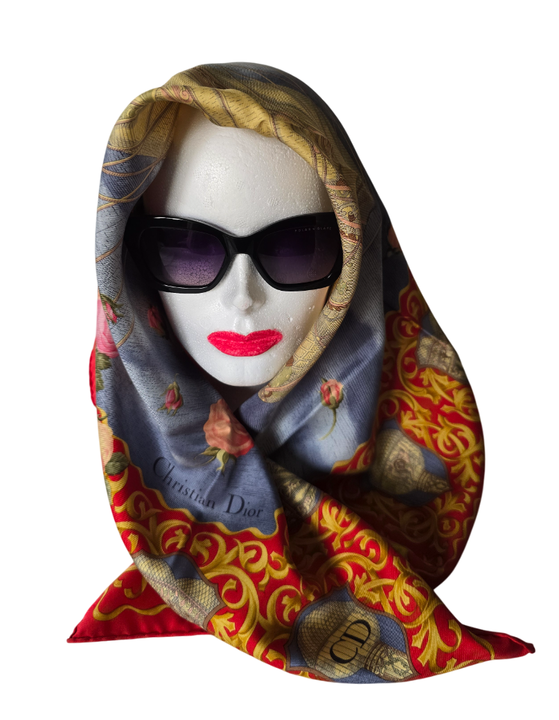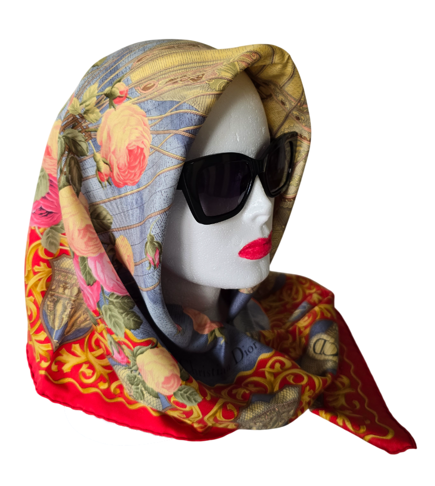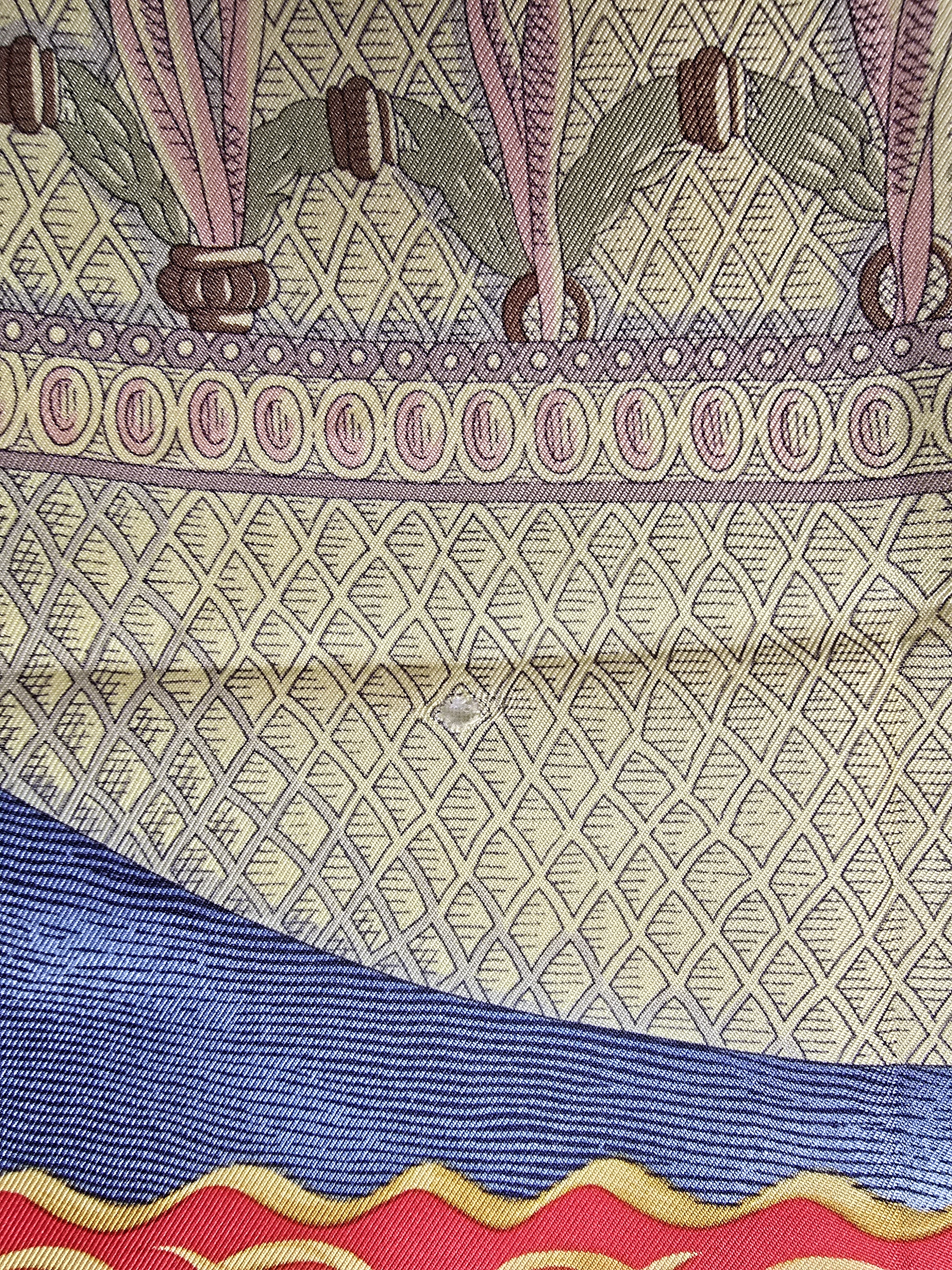 Popis: Šátek značky Christian Dior s propracovanými motivy létajícího balónu a růží. Hedvábí. Ručně rolované lemy do líce. V pravém dolním rohu vetkaná signace plus iniciály. V horním dekoru balónu nepatrně porušená tkanina. Jinak stav perfektní. Výjimečný doplněk.