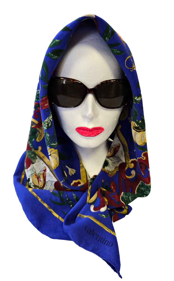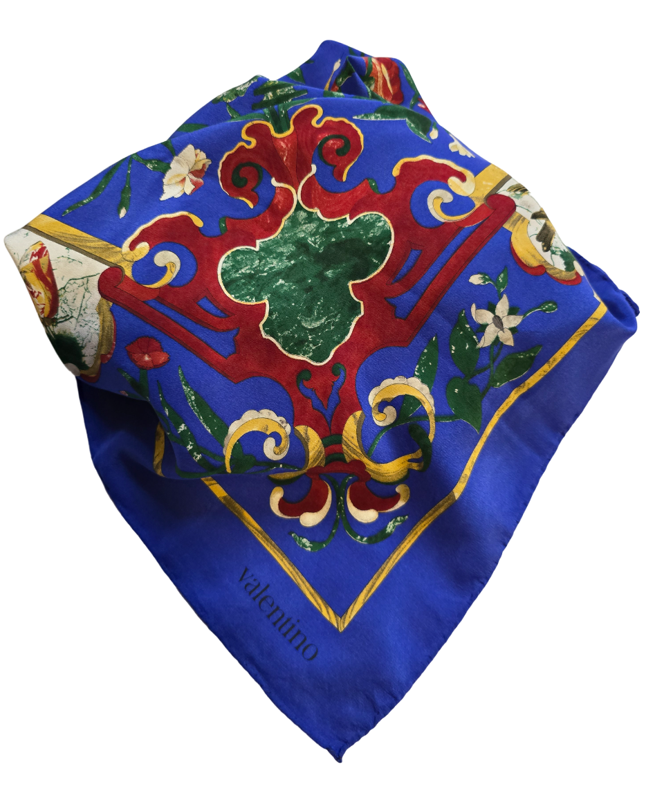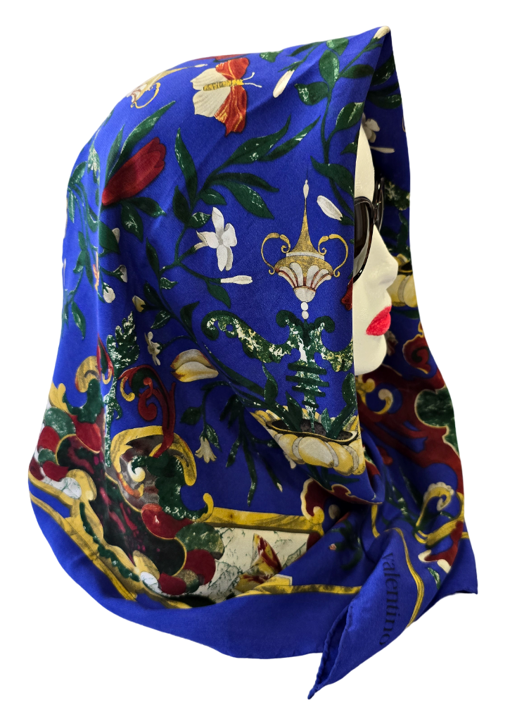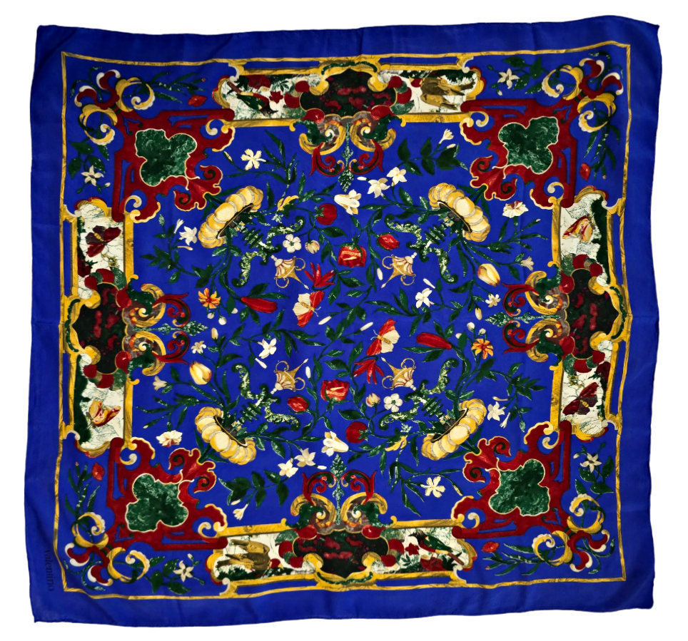 Popis: Šátek značky Valentino modré barvy s motýly a květinami. Hedvábí. Ručně rolované lemy do rubu. V pravém dolním rohu vetkaná signace Valentino. V pravém horním rohu z rubové strany všitá originální visačka (ERRE – označení samostatné řady kolekce). Nečištěno. Nepoškozeno, perfektní stav.