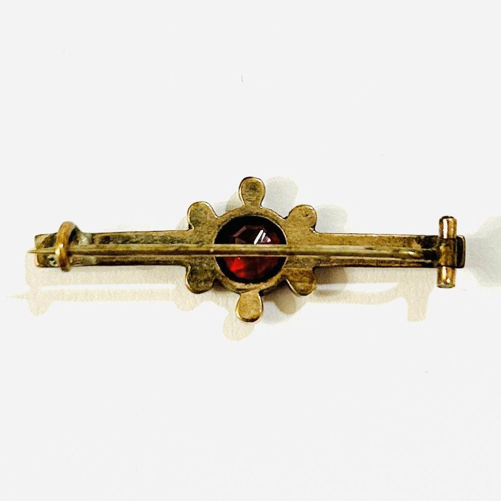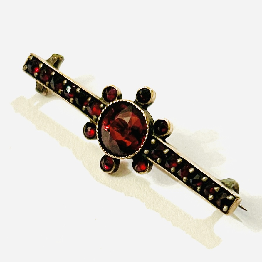 Půvabná brož z období secese, tělo tvořeno linií s centrální nevšední hlavicí připomínajíc květ či Slunce, osazeno větším přírodním almandinem kulatého brusu a českými granáty kulatého routového brusu. Fasováno nýtkovou technikou a obrubami, kvalitní tuzemská granátnická práce z počátku 20. století.