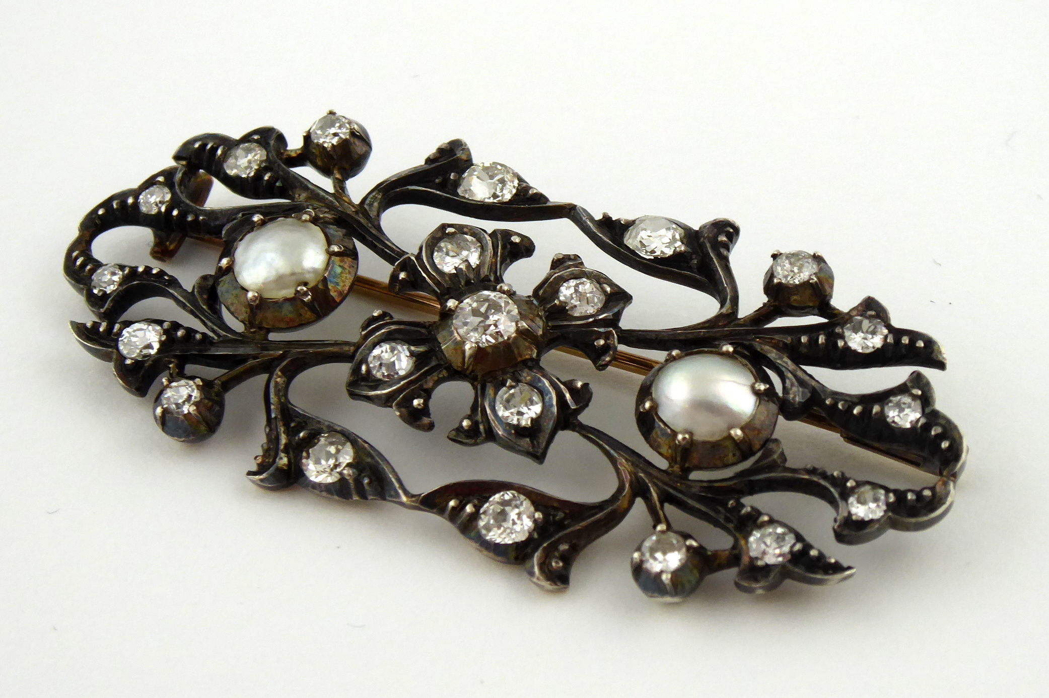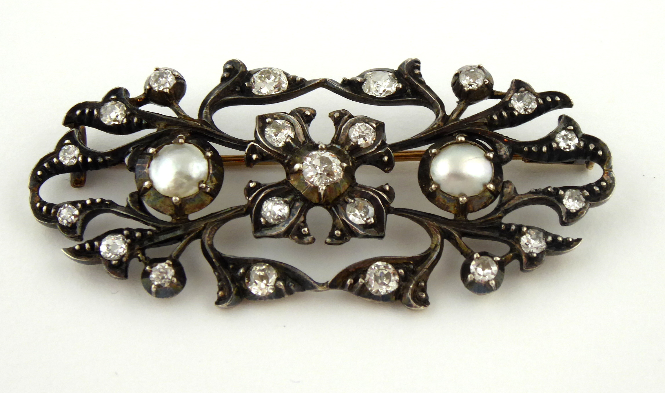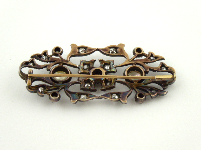 Zlato různé větší ryzosti, stříbro, přírodní diamanty, perleť. Hezká klenotnická práce. Ryzost zlata 735/1000, 715/1000 a 700/1000. Stříbro o ryzosti 900/1000. Zlatá jehla o ryzosti 735/1000, zlatá část brože a uchycení jehly o ryzosti 715/1000, zlaté zavírání jehly o ryzosti 700/1000. Stříbrná přední část brože o ryzosti 900/1000. Celková hmotnost 9,50 g. 31 přírodních diamantů starého briliantového brusu a výbrusu 16/16 o váze 1,40 ct, barva H-I, čistota Si-P. Přiloženo osvědčení Puncovního úřadu České republiky. Tvarově zajímavá brož je osázená 31 přírodními diamanty o celkové hmotnosti 1,40 ct. Evropa kolem roku 1900. Šířka 55 mm, výška 25 mm.