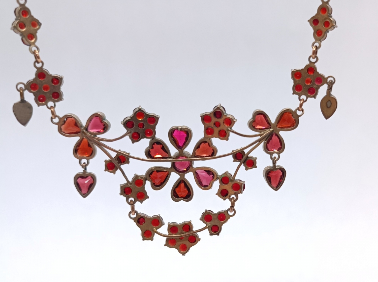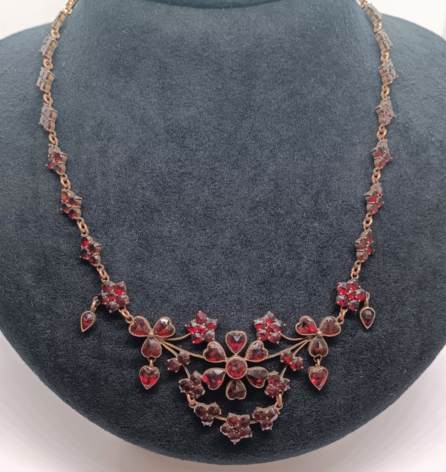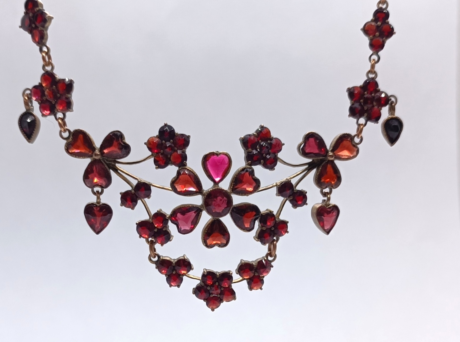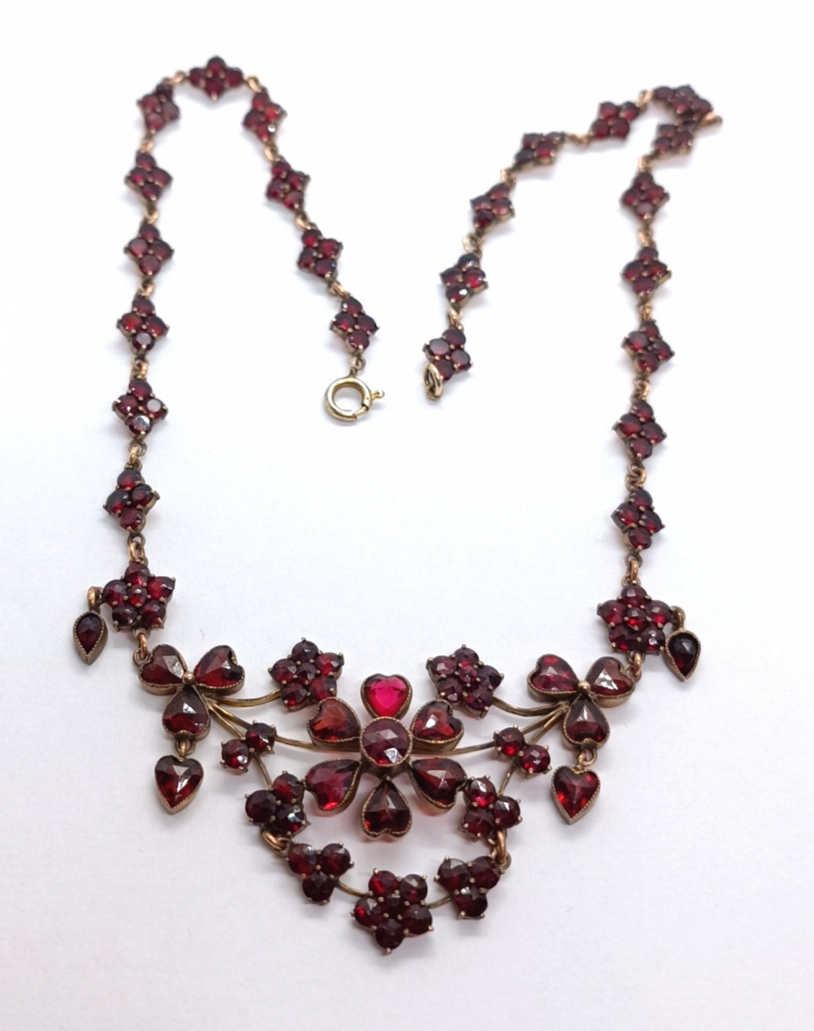Secesní granátový náhrdelník, české granáty a almandiny, ověsky ve tvaru granátových srdíček, sazené v tombaku, Čechy, kolem roku 1910; celková délka náhrdelníku je 40 cm a váží 15,23 g.