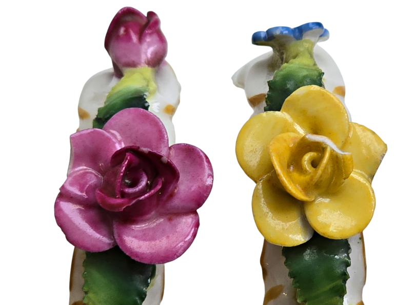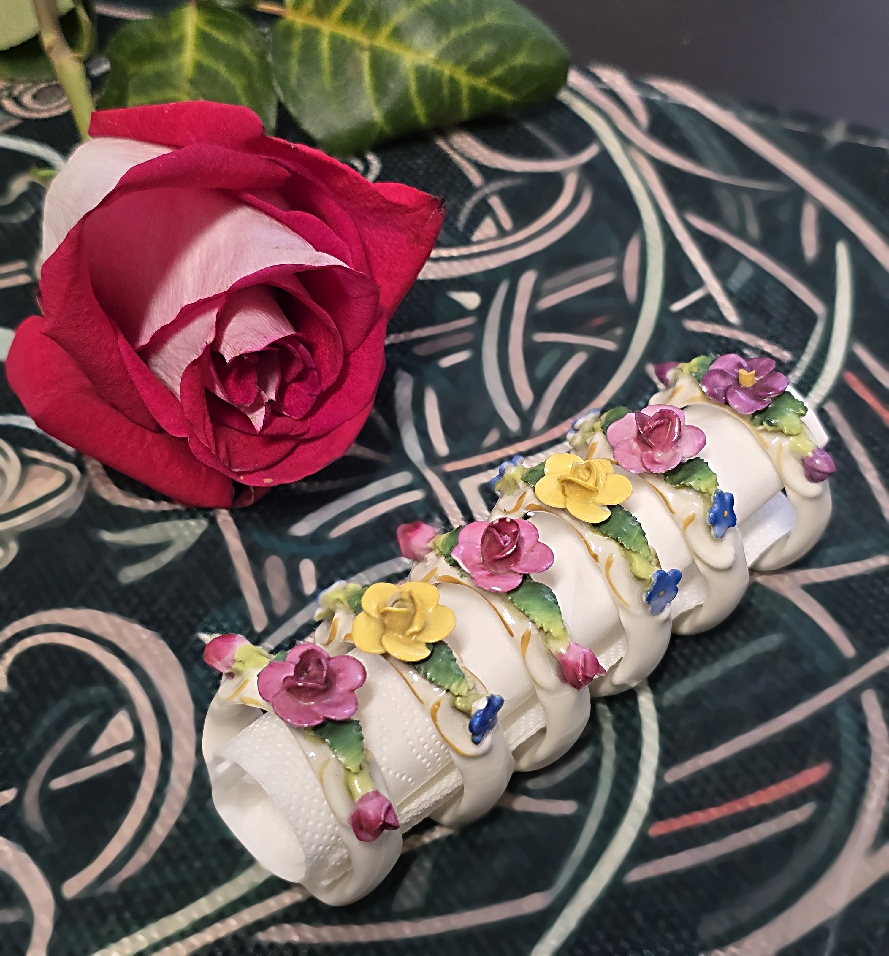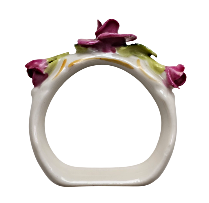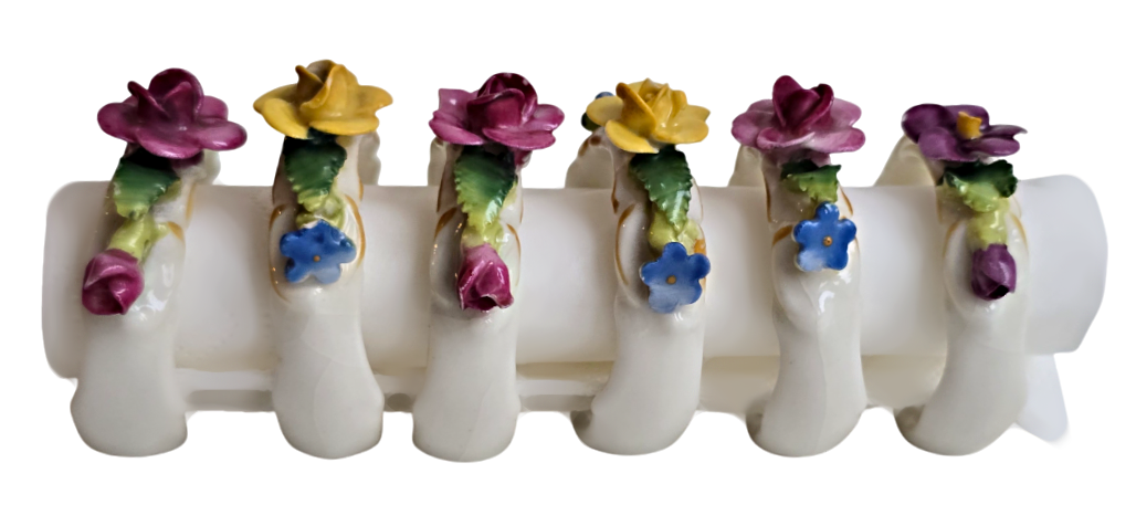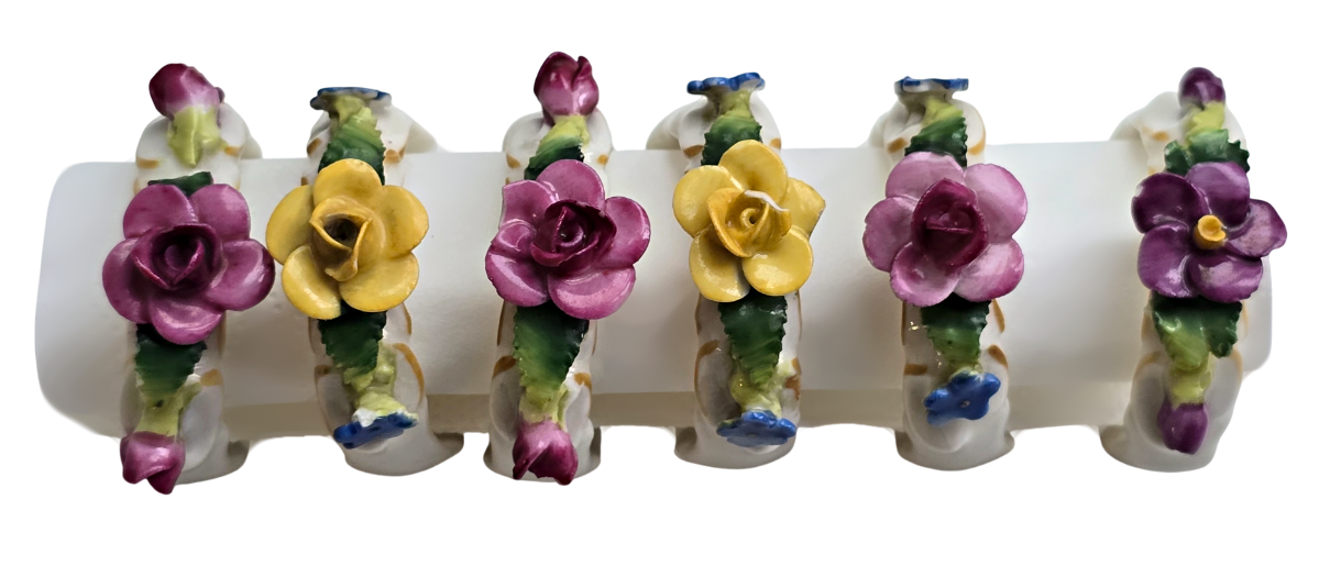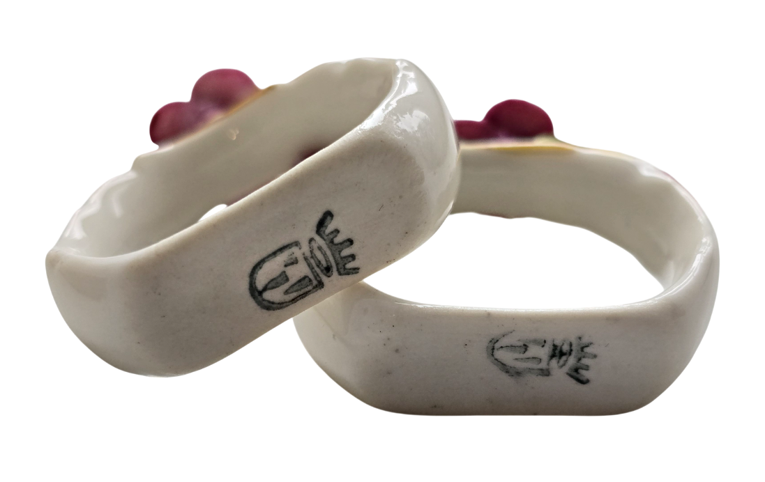 Popis: Porcelánové kroužky na ubrousky, zdobené různě barevnými kvítky. Ruční práce. Vzhledem ke stáří je stav dobrý, pouze na dvou kytičkách drobné otluky – viz foto. Na spodní straně značka.