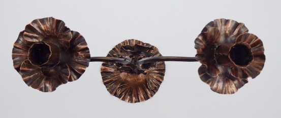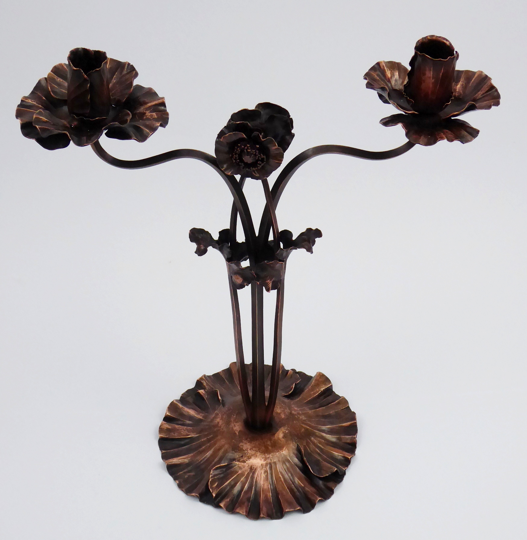 Měď. Období a styl: secese. Ručně tepaný secesní měděný svícen na dvě svíčky. Ramena a střední část tvořená tvarovanými stylizovanými stonky nesoucí květy a listy. Secesně tvarovaná podstava florálního secesního tepaného ornamentu. Střední Evropa 1900 – 1920. Výška 38 cm, šířka 31 cm.