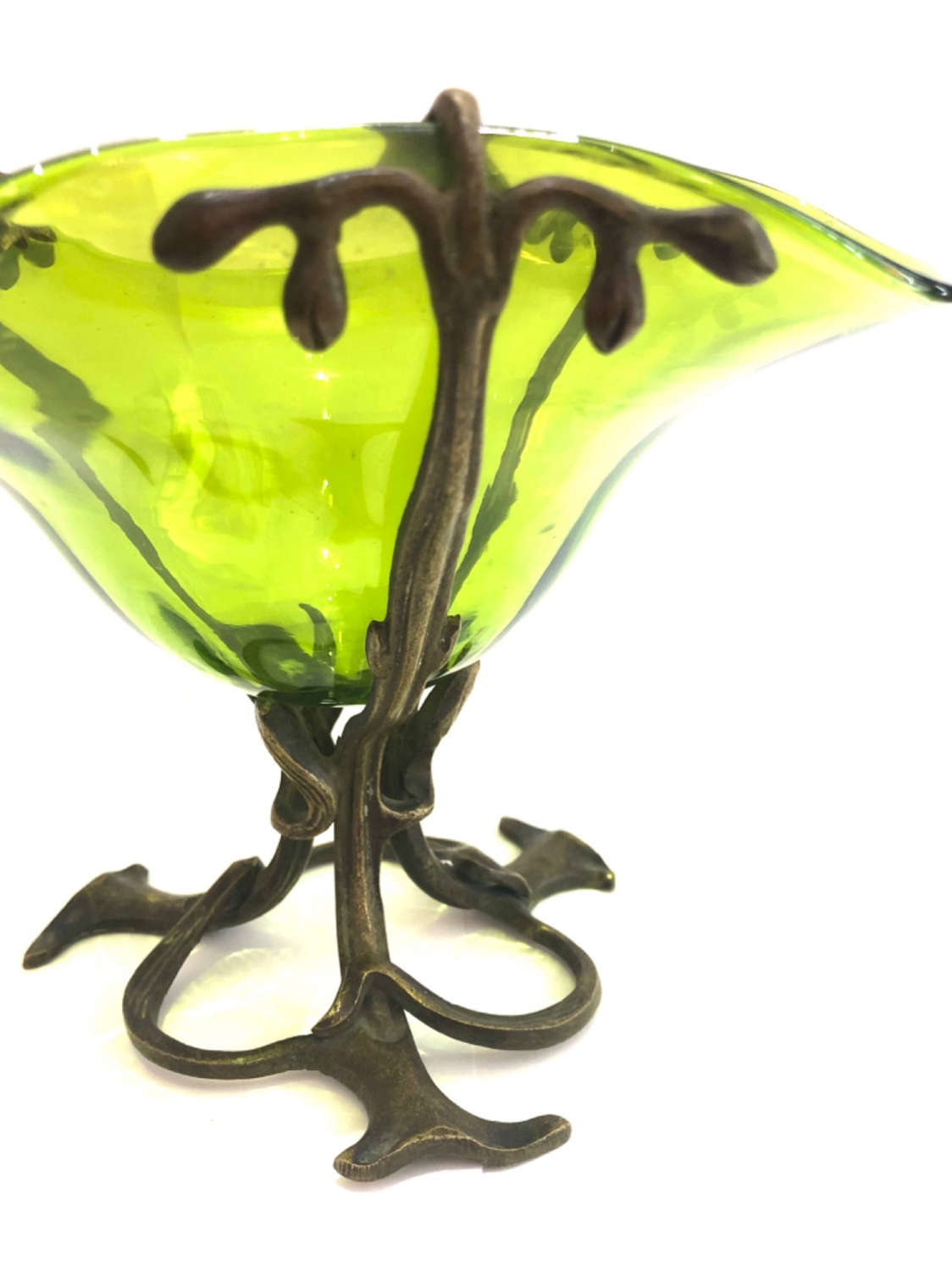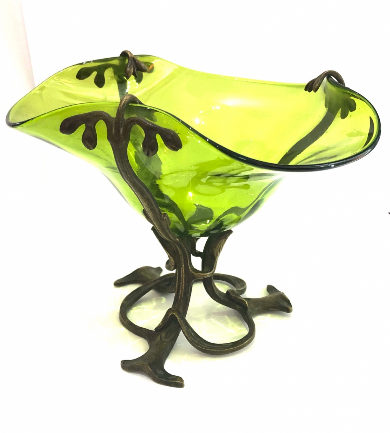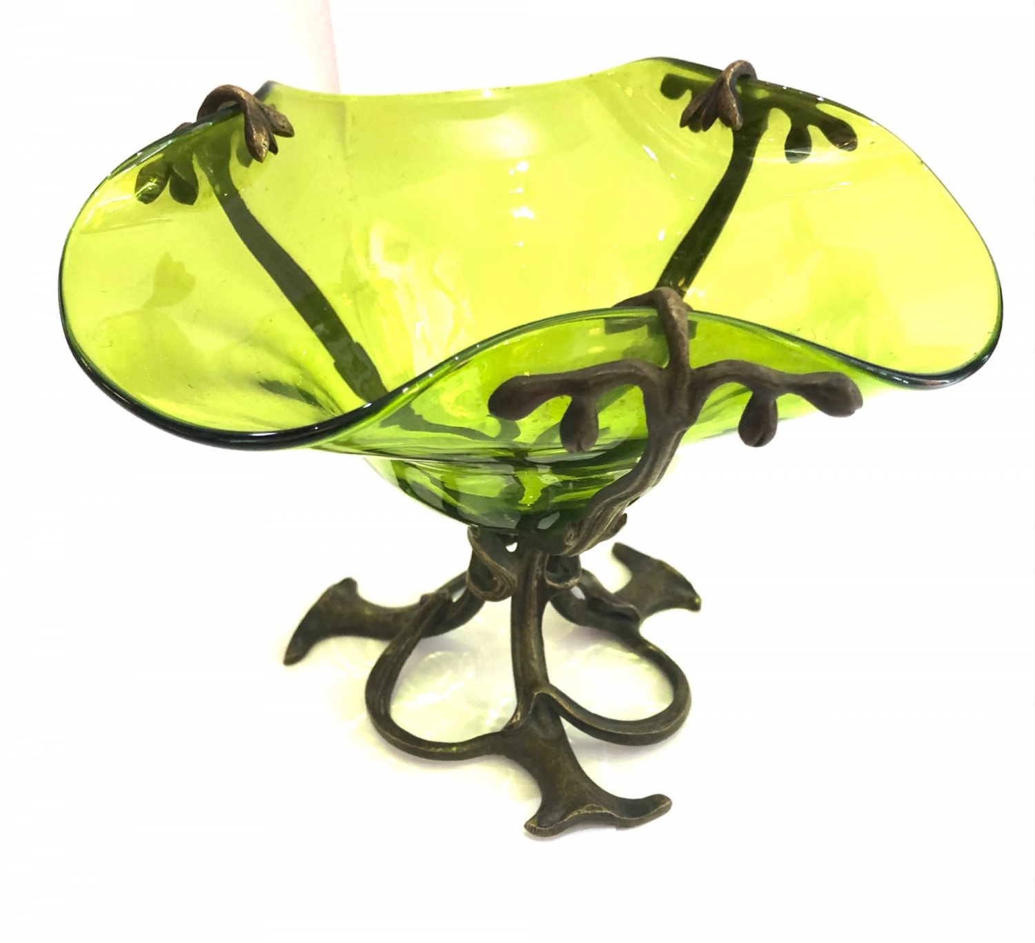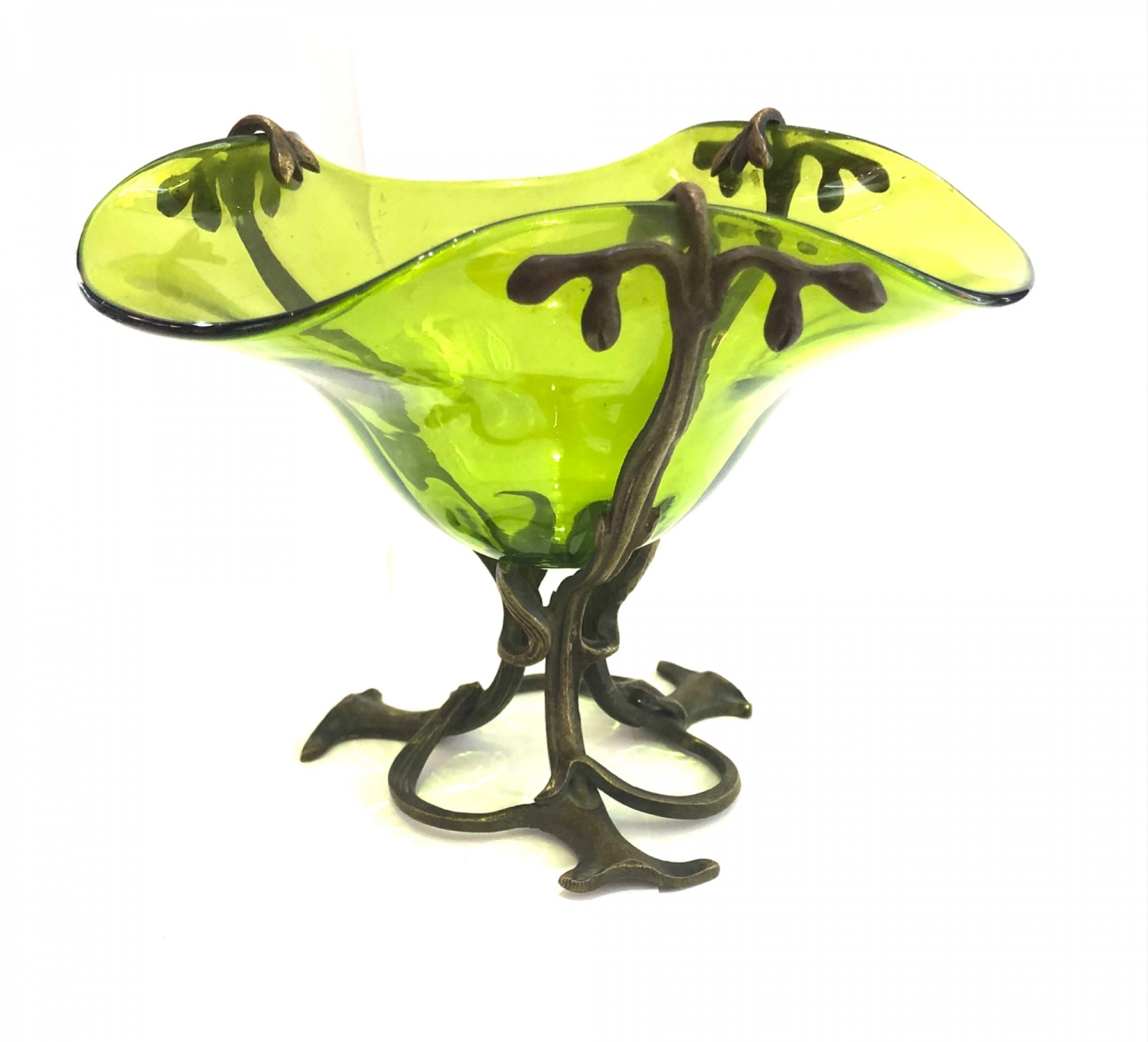 Secesní skleněná mísa jasně zelené barvy a velmi působivého tvaru vsazená do bronzového zdobného podstavce z období kolem roku 1900, vynikající stav; průměr 18 cm, výška 14 cm.