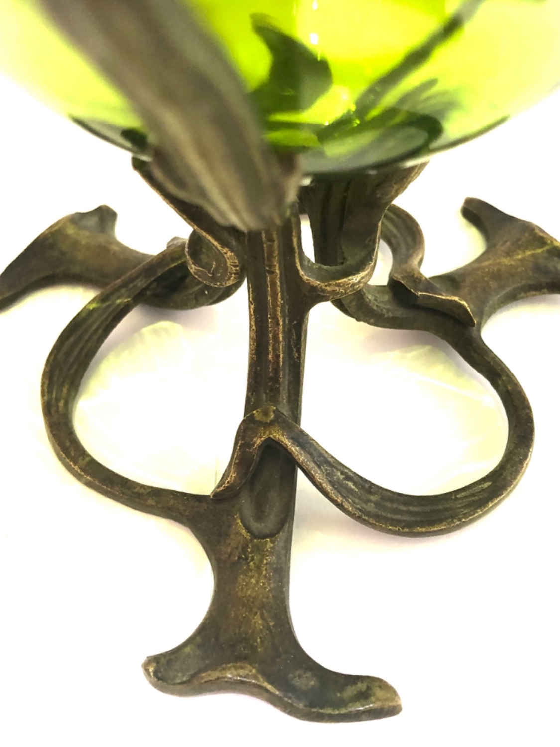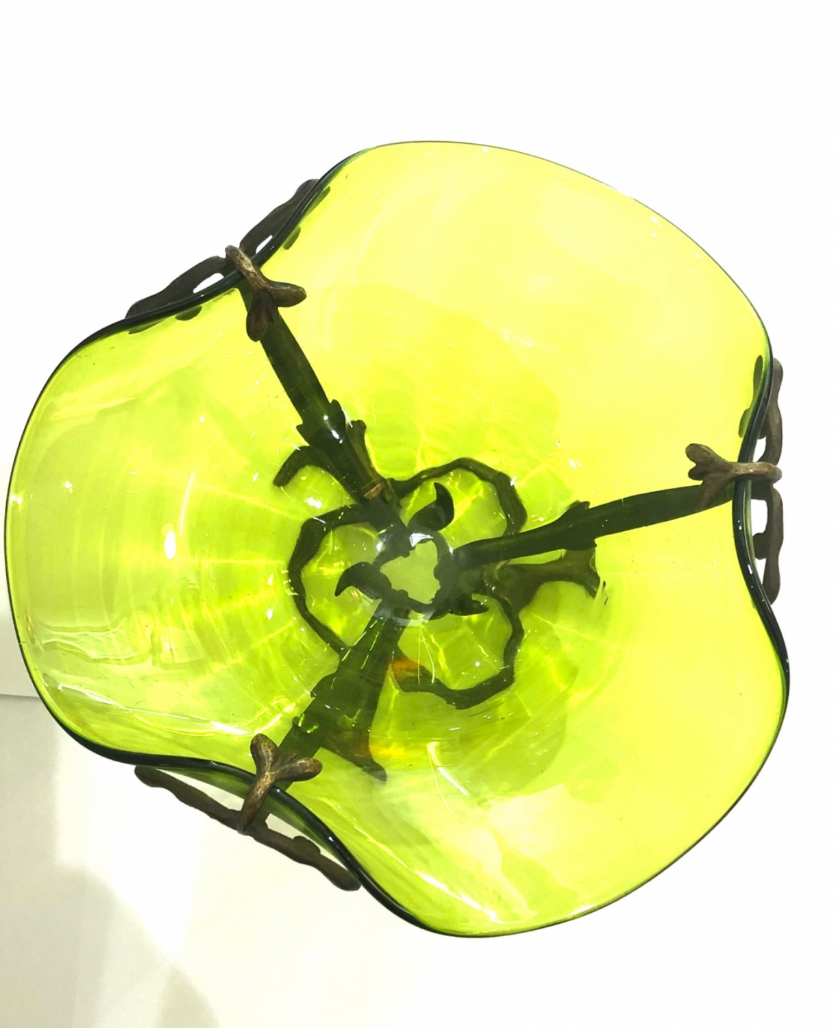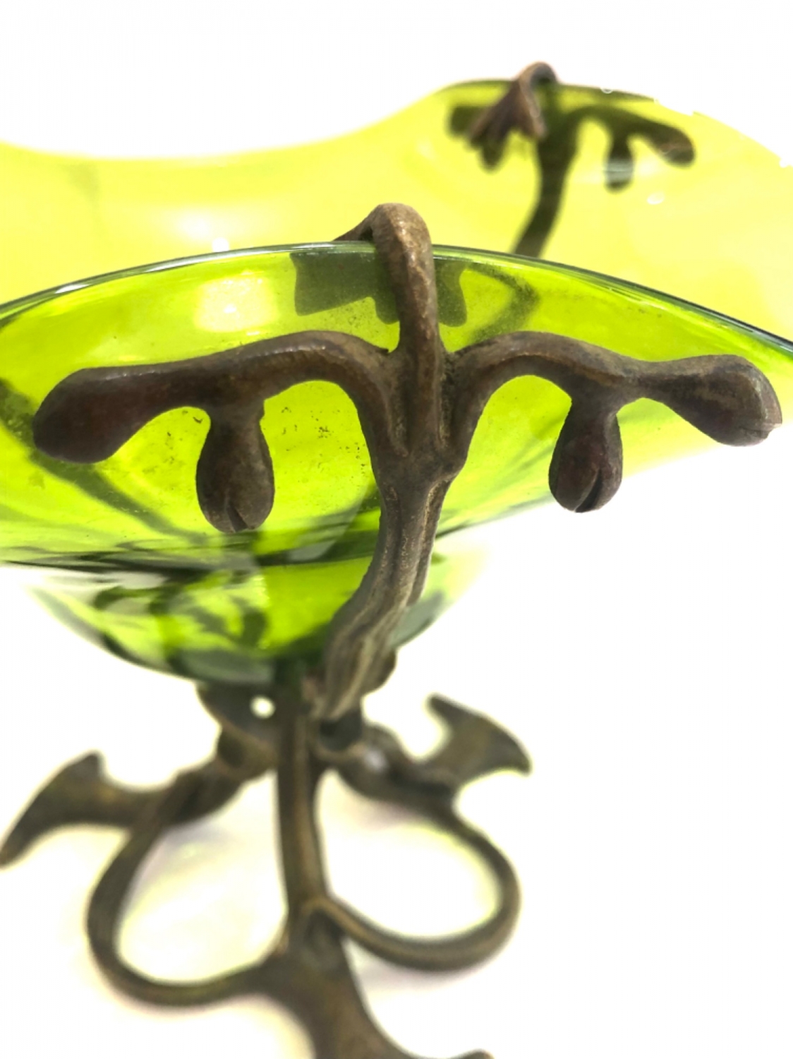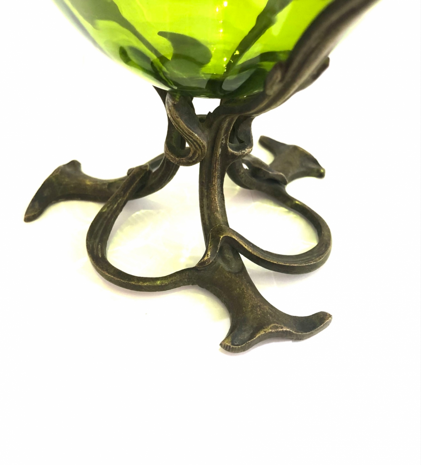 Secesní skleněná mísa jasně zelené barvy a velmi působivého tvaru vsazená do bronzového zdobného podstavce z období kolem roku 1900, vynikající stav; průměr 18 cm, výška 14 cm.