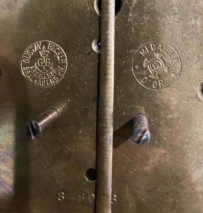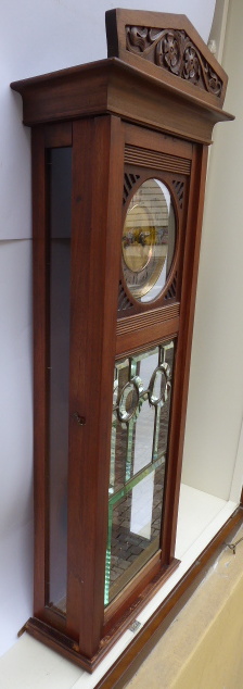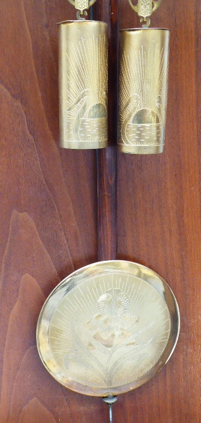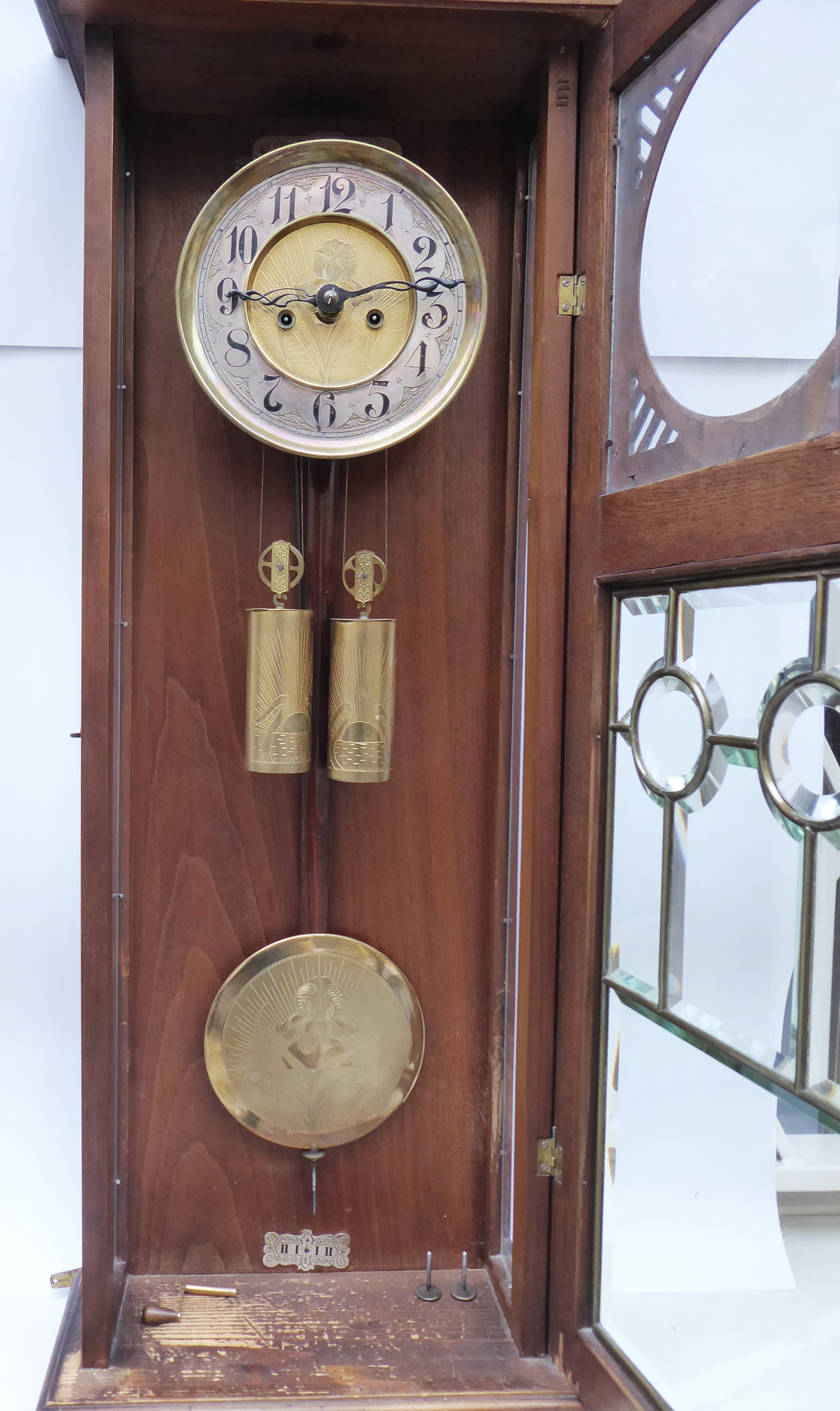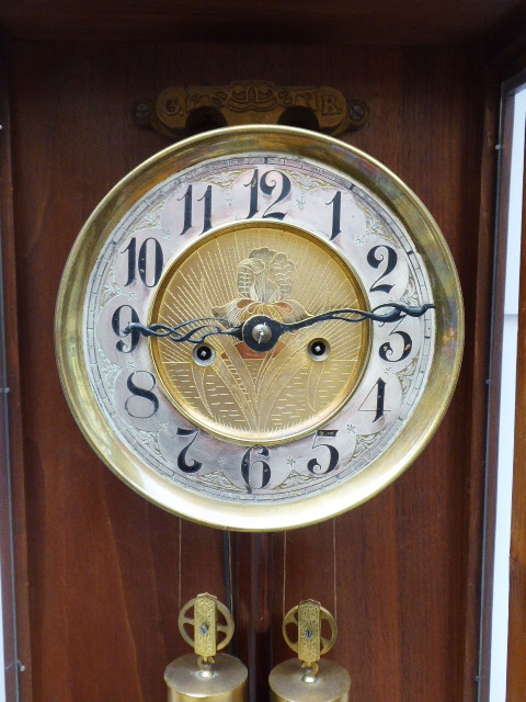 Dřevo, řezba, mosaz, originální klíč součástí. Období a styl: secese. Dvouzávažové nástěnné secesní hodiny typu pendlovky. Výrobce: Gustav Becker (1819-1885) založil v německém městě Freiburg svoje hodinářství, z něhož se v roce 1850 stala velká firma proslulá svými kvalitními výrobky. Stroj s kotvovým krokem, půlové bití. Světlé okruží ciferníku s reliéfními černými arabskými číslicemi. Secesně tvarované černěné mosazné ručičky. Mosazné kyvadlo a střed ciferníku zdobený gravírovaným secesním ornamentem kosatce s listy za východu slunce. Fazetovaná vitrážová skla. Stříška s řezbou. Originální klíč přiložen. Funkční. Vzhledem ke stáří hodinek bez záruky přesnosti chodu a dlouhodobé funkčnosti. Německo, Freiburg 1900 – 1920. Výška 95 cm, šířka 37 cm a hloubka 16 cm.